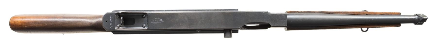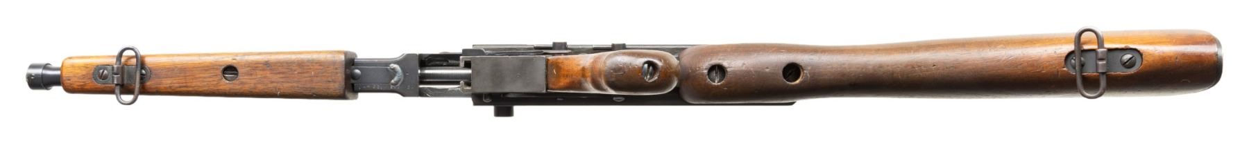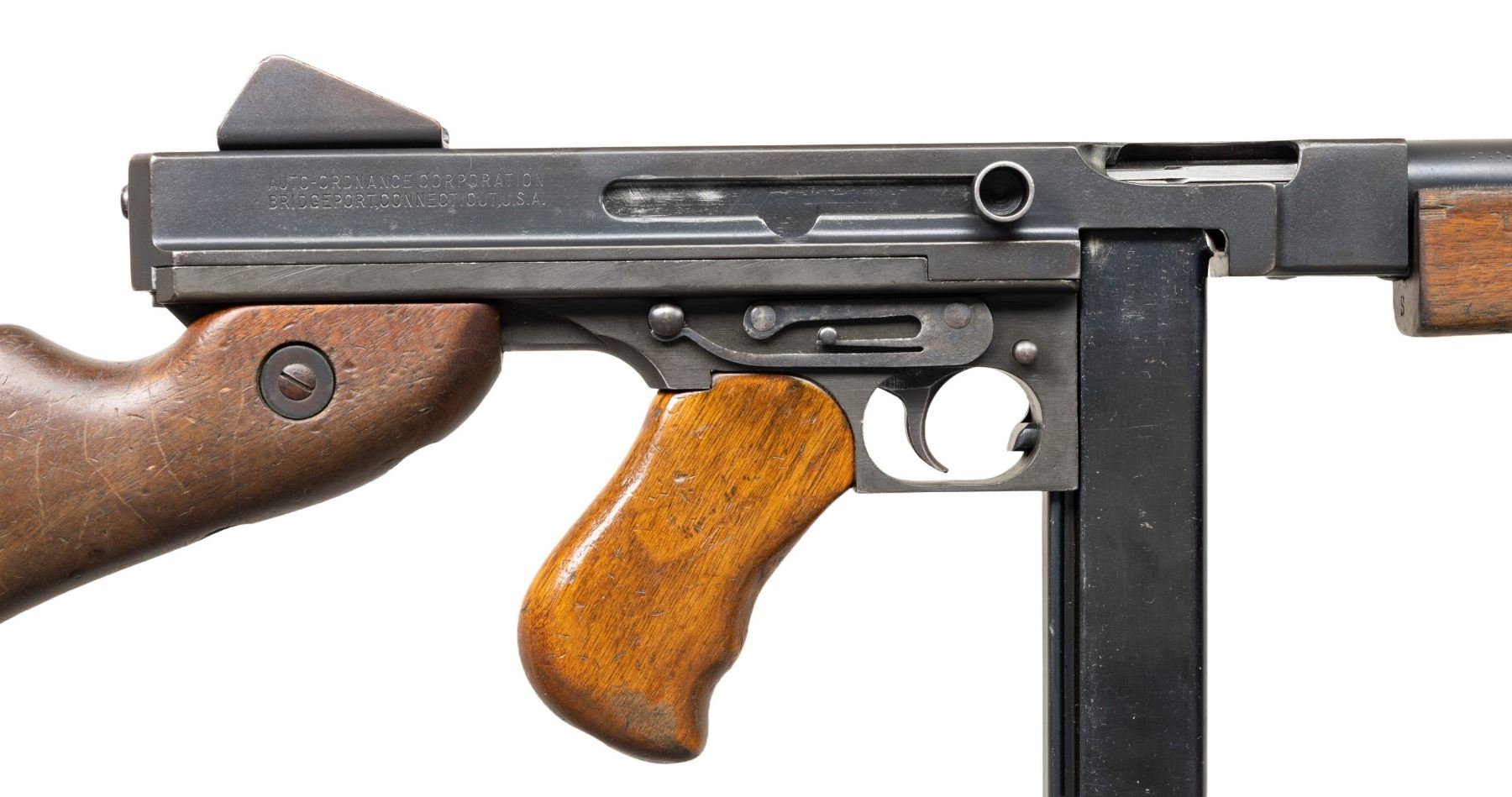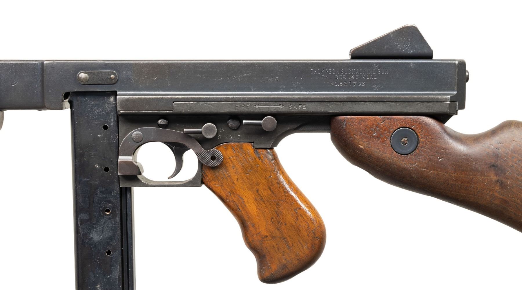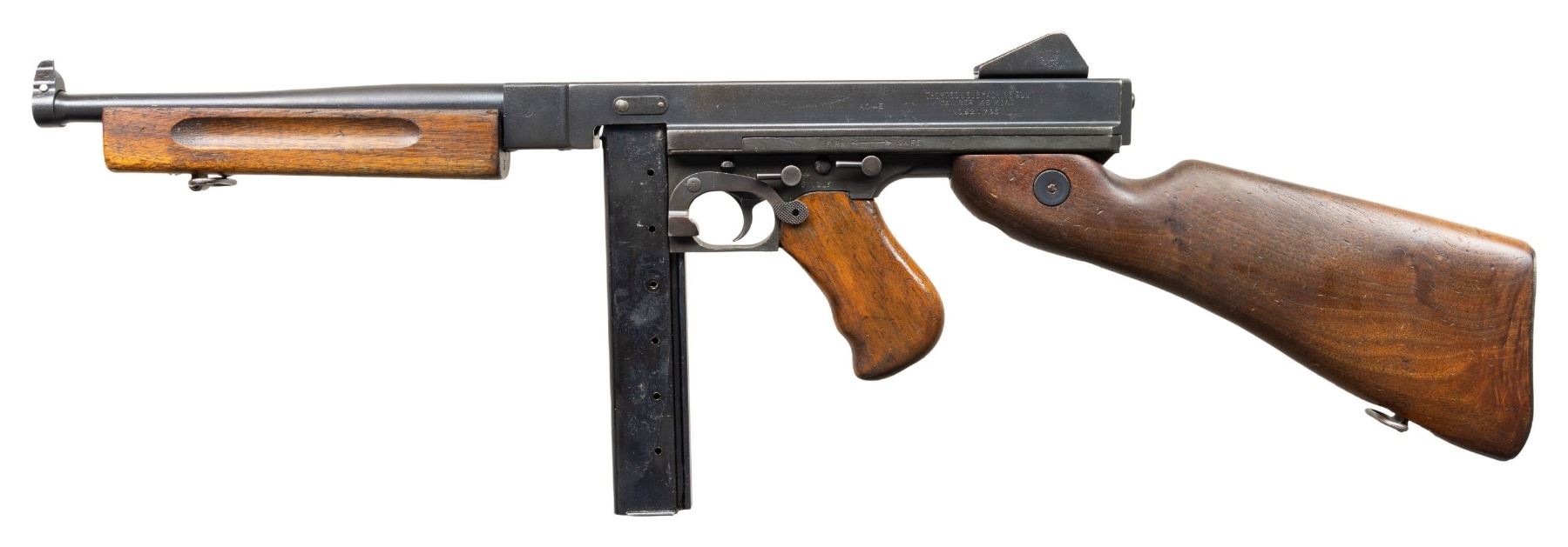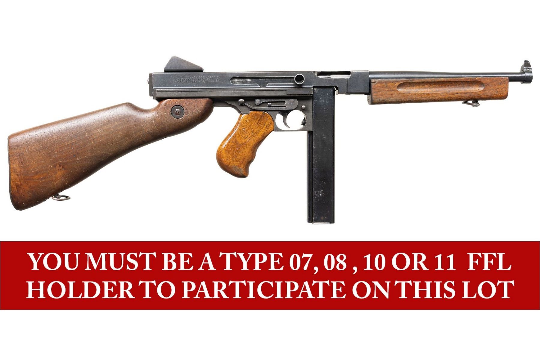 THOMPSON SUBMACHINE GUN. ***BIDDERS INTERESTED IN THIS LOT MUST CURRENTLY HOLD A TYPE 07, 08, 10, OR 11 FFL.*** Cal. 45 ACP. S# 621793. Bbl. 10" with "P" proof. Left of receiver is marked "Thompson Submachine Gun / Caliber .45 M1A1 / No. 621793" & "A.0-45". Top of receiver is marked with Thompson trademark and "US PROPERTY" located behind the fixed sight. Right side of receiver is marked "Auto Ordnance Corporation / Bridgeport, Connecticut, U.S.A.". "S" marked bolt. Walnut finger groove forearm with "S" stamp. Walnut stock and pistol grip. MAGS: 1-30rd. CONDITION: refinished metal surfaces over some spots of pitting around ejection port and scattered handling marks. There are vise marks on the bbl that were present prior to the refinish work, Furniture has scattered handling marks and numerous small dings. Lightly frosted bore with some wear to the rifling. POST 1986 DEALER SAMPLE MACHINE GUN WITH NO LAW (DEMO) LETTER REQUIRED TO TRANSFER. RESTRICTED REGISTRATION POSSESSION LIMITED TO CONTINUED COMPLIANCE WITH PROVISIONS OF PUBLIC LAW 99-308. IF YOU ARE AN 07, 08, 10, or 11 FFL/SOT YOU MAY TAKE TRANSFER OF THIS FIREARM UPON APPROVAL OF TRANSFER. PROVENANCE: Military Museum Collection of Shooters Outpost, Hooksett NH. THIS ITEM WILL BE AVAILABLE FOR PREVIEW BY APPOINTMENT AT THE SHOOTERS OUTPOST MUSEUM IN HOOKSETT, NH. TO SET UP AN APPOINTMENT, PLEASE CALL 207-453-2114. (50-1935/ZAL). MODERN CLASS III. $2,500-3,500.