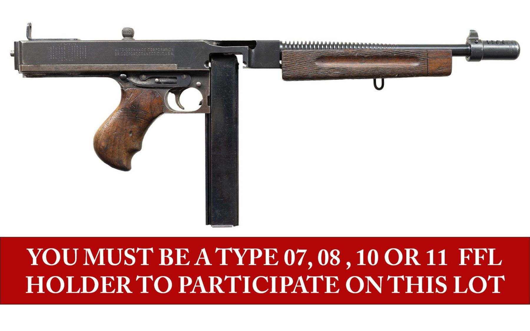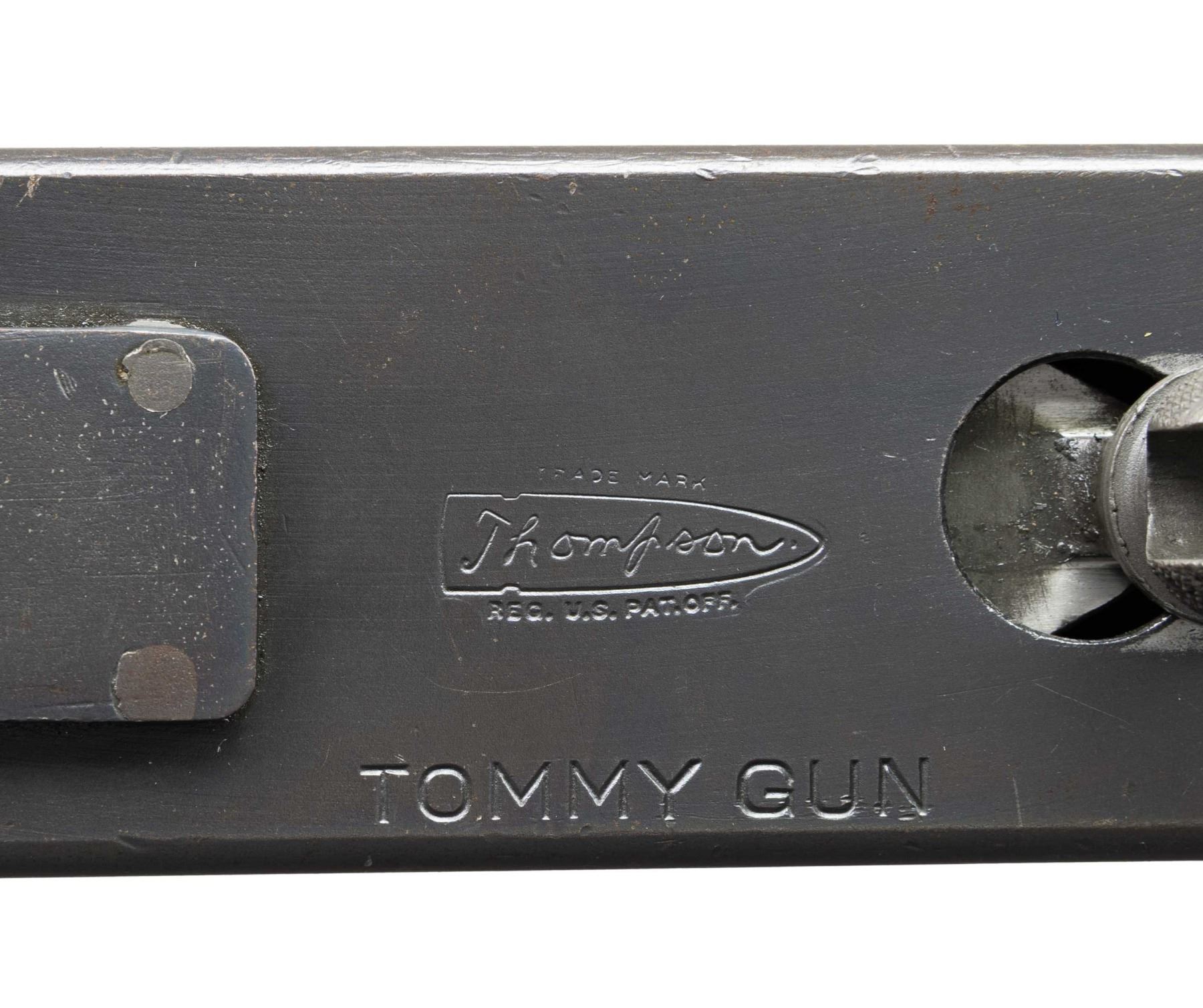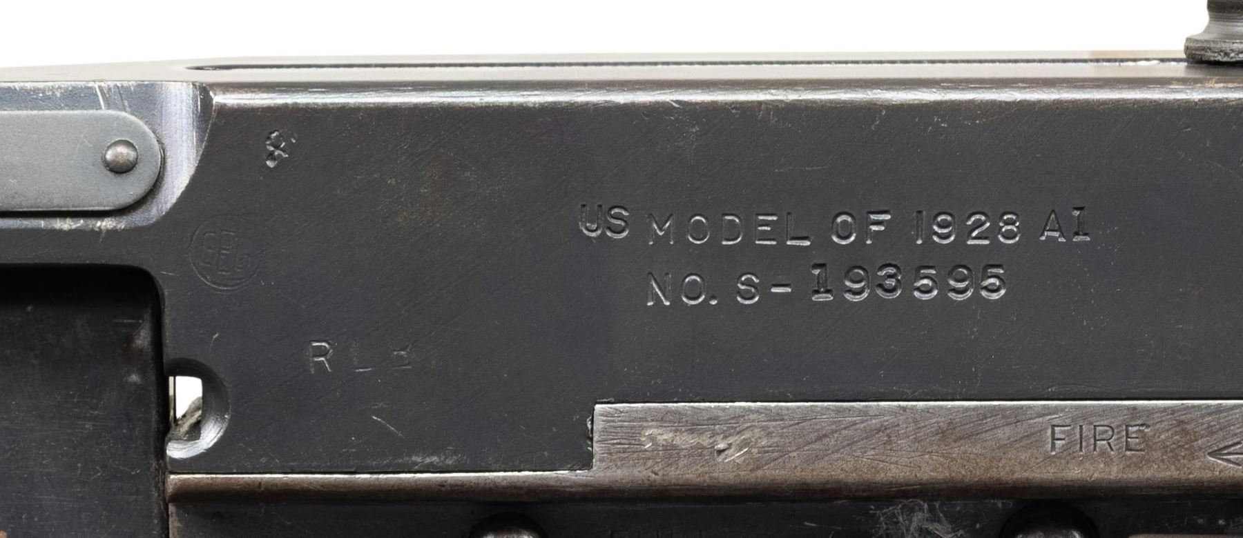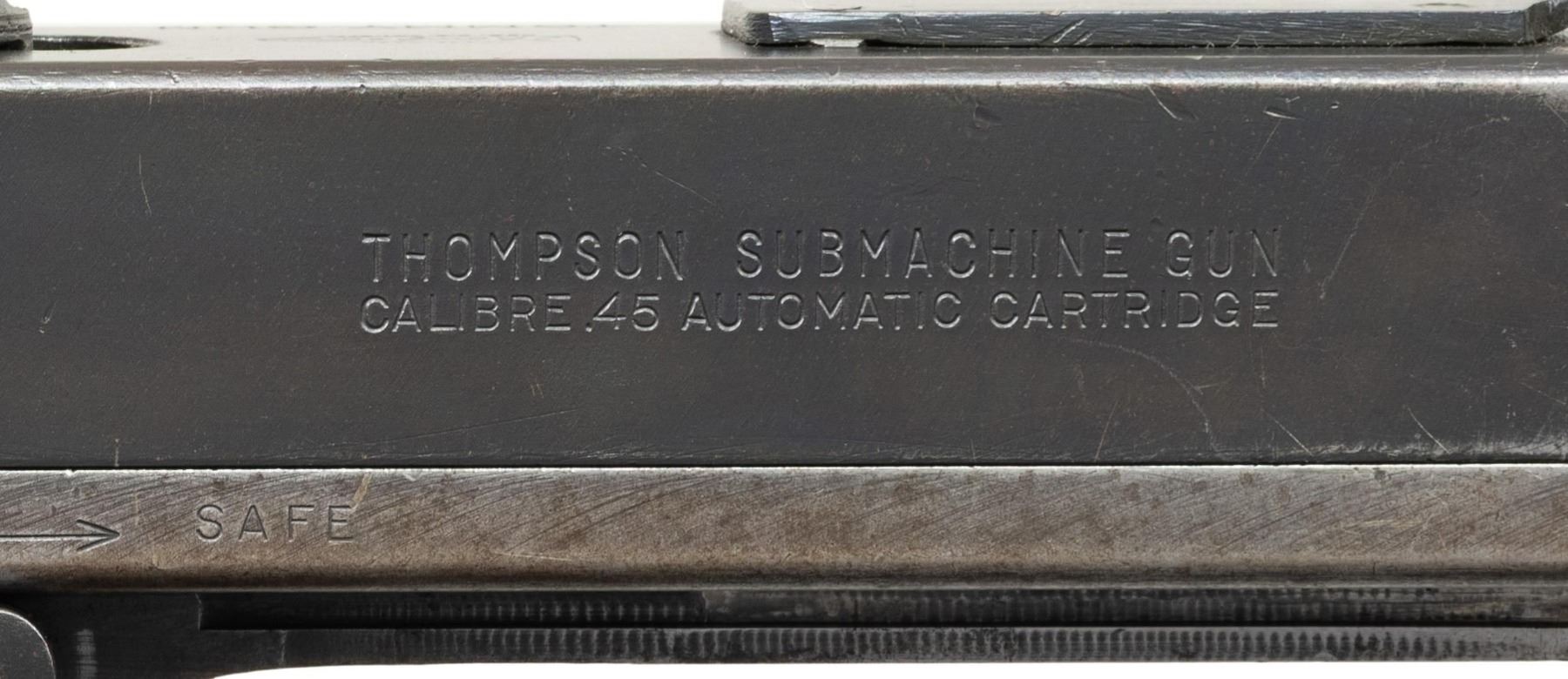 THOMPSON BRITISH LEND-LEASE SUBMACHINE GUN. ***BIDDERS INTERESTED IN THIS LOT MUST CURRENTLY HOLD A TYPE 07, 08, 10, OR 11 FFL.*** Cal 45 ACP. S# S-193595. Bbl 12" over Cutts compensator with 5-pointed star, P and punch dot proof. Bolt is R proofed. A chance to transfer in an original, military proofed Thompson, SMG, not a recent, converted, semiautomatic version. Buffer is S proofed. Trigger grouping number S354828. Chamber area of receiver is marked with "broad arrow CAS". Left side of receiver "circled GEG and RLB Proof", "US Model of 1928 A1/No. S-193595" and "Thompson sub machine gun/calibre.45 automatic cartridge". Top of receiver is marked with Thompson trademark and Tommy gun. Right side of receiver is marked with patent number and "Auto-Ordnance Corporation/ Bridgeport Connecticut, U.S.A.". Walnut forearm with checker pattern and S markings. CONDITION: overall fair Arsenal refinish with some light scratches and mild handling marks. Showing some high edge wear as well. Clean pitting present on cocking knob. Stock and forearm have numerous handling marks and some heavy gouging. Bore shows some frosting with scattered pitting. POST 1986 DEALER SAMPLE MACHINE GUN WITH NO LAW (DEMO) LETTER REQUIRED TO TRANSFER. RESTRICTED REGISTRATION POSSESSION LIMITED TO CONTINUED COMPLIANCE WITH PROVISIONS OF PUBLIC LAW 99-308. IF YOU ARE AN 07, 08, 10, or 11 FFL/SOT YOU MAY TAKE TRANSFER OF THIS FIREARM UPON APPROVAL OF TRANSFER. PROVENANCE: Military Museum Collection of Shooters Outpost, Hooksett NH. THIS ITEM WILL BE AVAILABLE FOR PREVIEW BY APPOINTMENT AT THE SHOOTERS OUTPOST MUSEUM IN HOOKSETT, NH. TO SET UP AN APPOINTMENT, PLEASE CALL 207-453-2114. (50-1871/ZAL). MODERN CLASS III. $2,500-3,500.