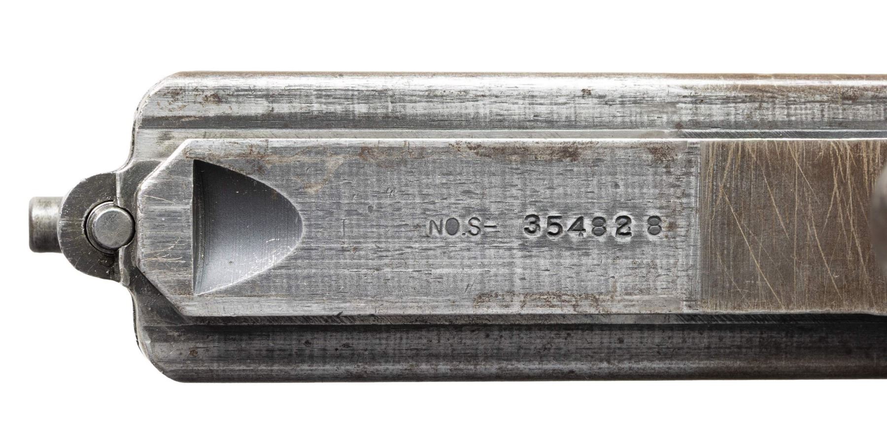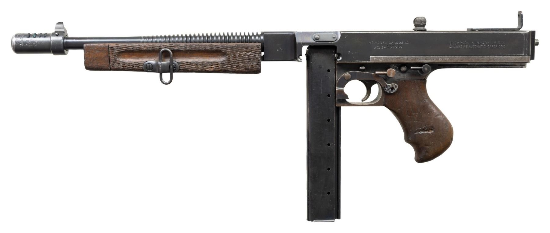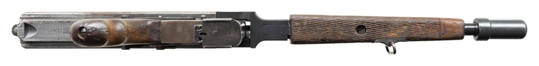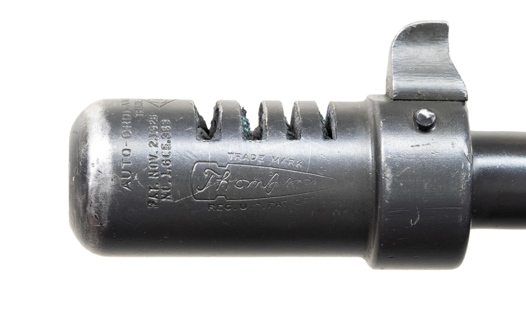 THOMPSON BRITISH LEND-LEASE SUBMACHINE GUN. ***BIDDERS INTERESTED IN THIS LOT MUST CURRENTLY HOLD A TYPE 07, 08, 10, OR 11 FFL.*** Cal 45 ACP. S# S-193595. Bbl 12" over Cutts compensator with 5-pointed star, P and punch dot proof. Bolt is R proofed. A chance to transfer in an original, military proofed Thompson, SMG, not a recent, converted, semiautomatic version. Buffer is S proofed. Trigger grouping number S354828. Chamber area of receiver is marked with "broad arrow CAS". Left side of receiver "circled GEG and RLB Proof", "US Model of 1928 A1/No. S-193595" and "Thompson sub machine gun/calibre.45 automatic cartridge". Top of receiver is marked with Thompson trademark and Tommy gun. Right side of receiver is marked with patent number and "Auto-Ordnance Corporation/ Bridgeport Connecticut, U.S.A.". Walnut forearm with checker pattern and S markings. CONDITION: overall fair Arsenal refinish with some light scratches and mild handling marks. Showing some high edge wear as well. Clean pitting present on cocking knob. Stock and forearm have numerous handling marks and some heavy gouging. Bore shows some frosting with scattered pitting. POST 1986 DEALER SAMPLE MACHINE GUN WITH NO LAW (DEMO) LETTER REQUIRED TO TRANSFER. RESTRICTED REGISTRATION POSSESSION LIMITED TO CONTINUED COMPLIANCE WITH PROVISIONS OF PUBLIC LAW 99-308. IF YOU ARE AN 07, 08, 10, or 11 FFL/SOT YOU MAY TAKE TRANSFER OF THIS FIREARM UPON APPROVAL OF TRANSFER. PROVENANCE: Military Museum Collection of Shooters Outpost, Hooksett NH. THIS ITEM WILL BE AVAILABLE FOR PREVIEW BY APPOINTMENT AT THE SHOOTERS OUTPOST MUSEUM IN HOOKSETT, NH. TO SET UP AN APPOINTMENT, PLEASE CALL 207-453-2114. (50-1871/ZAL). MODERN CLASS III. $2,500-3,500.