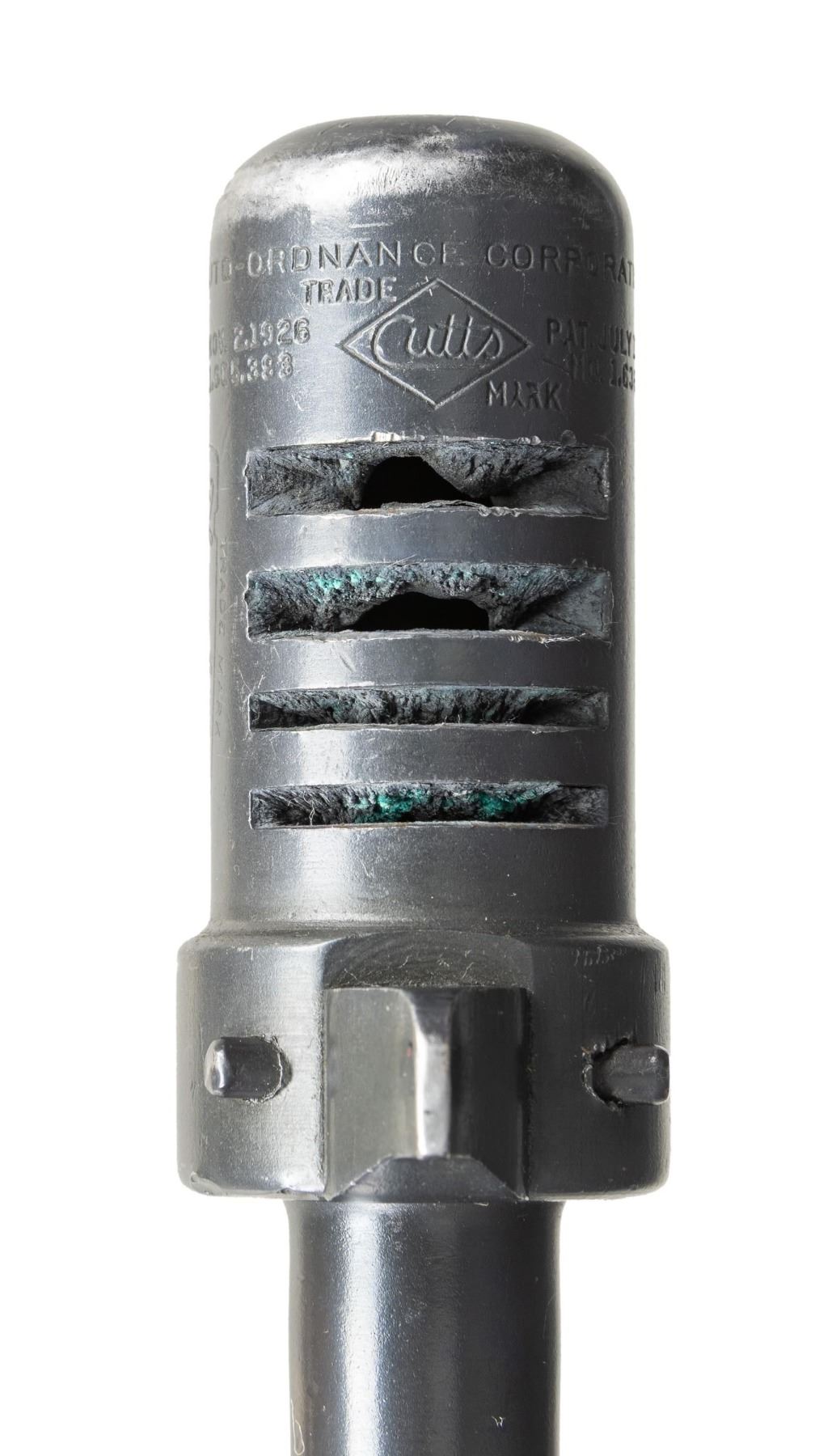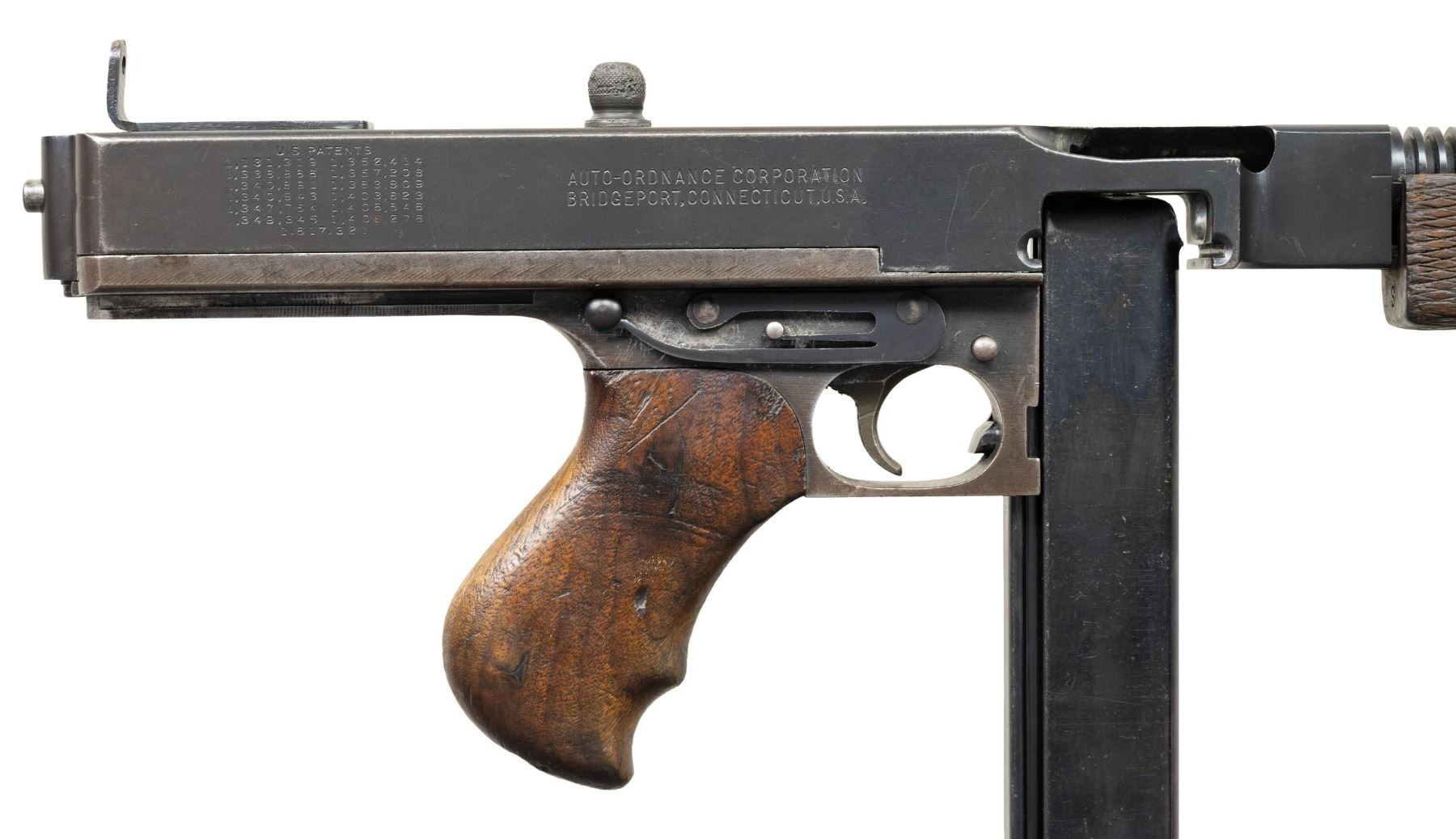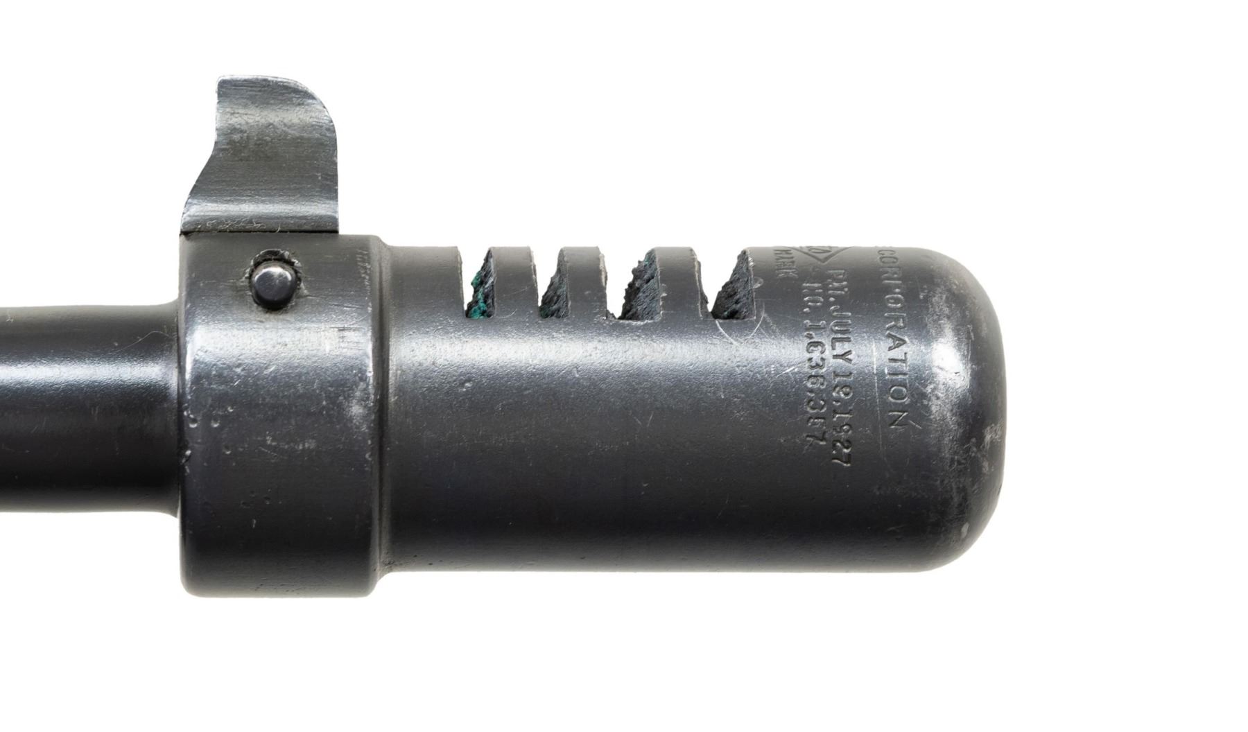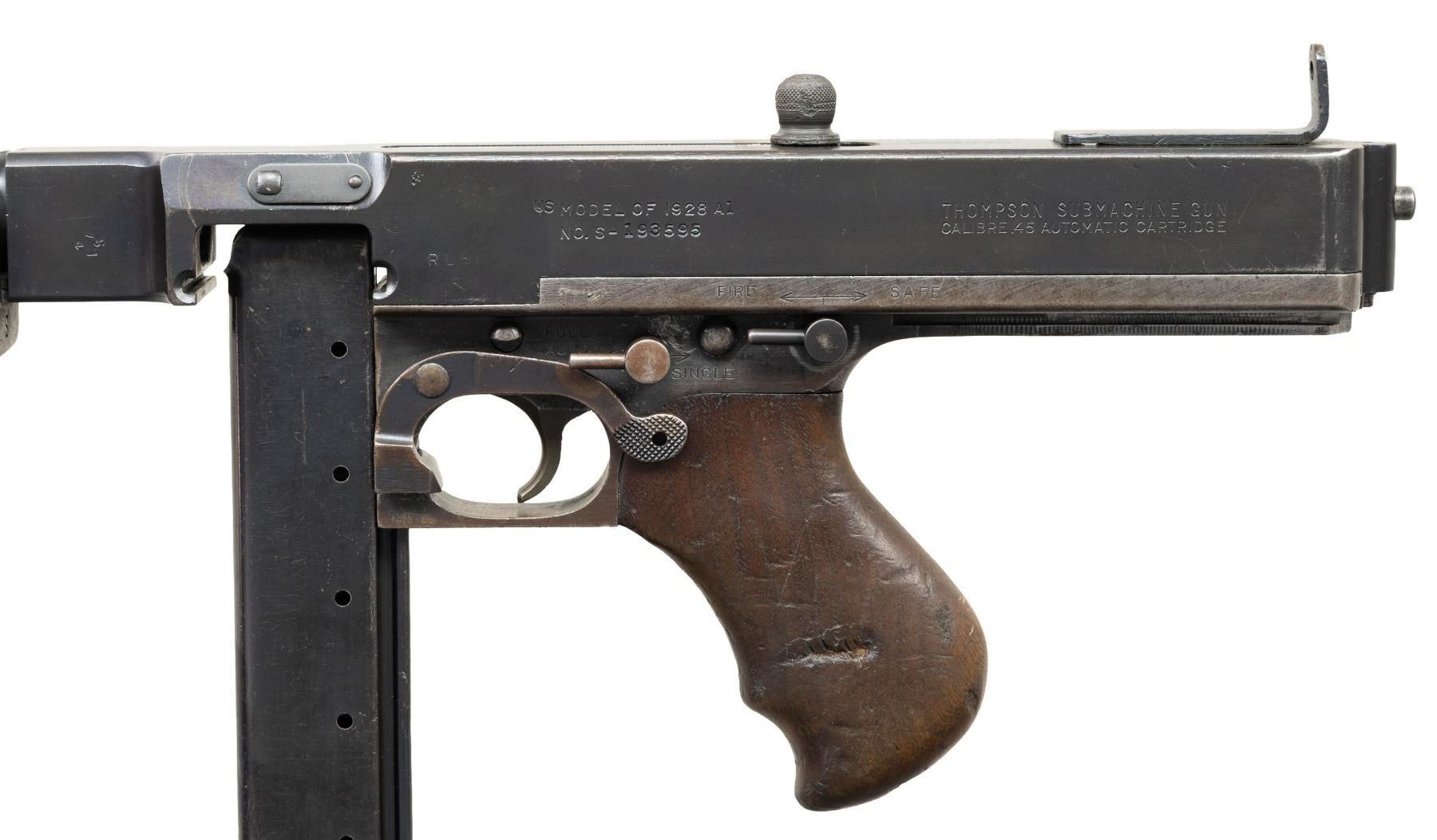THOMPSON BRITISH LEND-LEASE SUBMACHINE GUN. ***BIDDERS INTERESTED IN THIS LOT MUST CURRENTLY HOLD A TYPE 07, 08, 10, OR 11 FFL.*** Cal 45 ACP. S# S-193595. Bbl 12" over Cutts compensator with 5-pointed star, P and punch dot proof. Bolt is R proofed. A chance to transfer in an original, military proofed Thompson, SMG, not a recent, converted, semiautomatic version. Buffer is S proofed. Trigger grouping number S354828. Chamber area of receiver is marked with "broad arrow CAS". Left side of receiver "circled GEG and RLB Proof", "US Model of 1928 A1/No. S-193595" and "Thompson sub machine gun/calibre.45 automatic cartridge". Top of receiver is marked with Thompson trademark and Tommy gun. Right side of receiver is marked with patent number and "Auto-Ordnance Corporation/ Bridgeport Connecticut, U.S.A.". Walnut forearm with checker pattern and S markings. CONDITION: overall fair Arsenal refinish with some light scratches and mild handling marks. Showing some high edge wear as well. Clean pitting present on cocking knob. Stock and forearm have numerous handling marks and some heavy gouging. Bore shows some frosting with scattered pitting. POST 1986 DEALER SAMPLE MACHINE GUN WITH NO LAW (DEMO) LETTER REQUIRED TO TRANSFER. RESTRICTED REGISTRATION POSSESSION LIMITED TO CONTINUED COMPLIANCE WITH PROVISIONS OF PUBLIC LAW 99-308. IF YOU ARE AN 07, 08, 10, or 11 FFL/SOT YOU MAY TAKE TRANSFER OF THIS FIREARM UPON APPROVAL OF TRANSFER. PROVENANCE: Military Museum Collection of Shooters Outpost, Hooksett NH. THIS ITEM WILL BE AVAILABLE FOR PREVIEW BY APPOINTMENT AT THE SHOOTERS OUTPOST MUSEUM IN HOOKSETT, NH. TO SET UP AN APPOINTMENT, PLEASE CALL 207-453-2114. (50-1871/ZAL). MODERN CLASS III. $2,500-3,500.