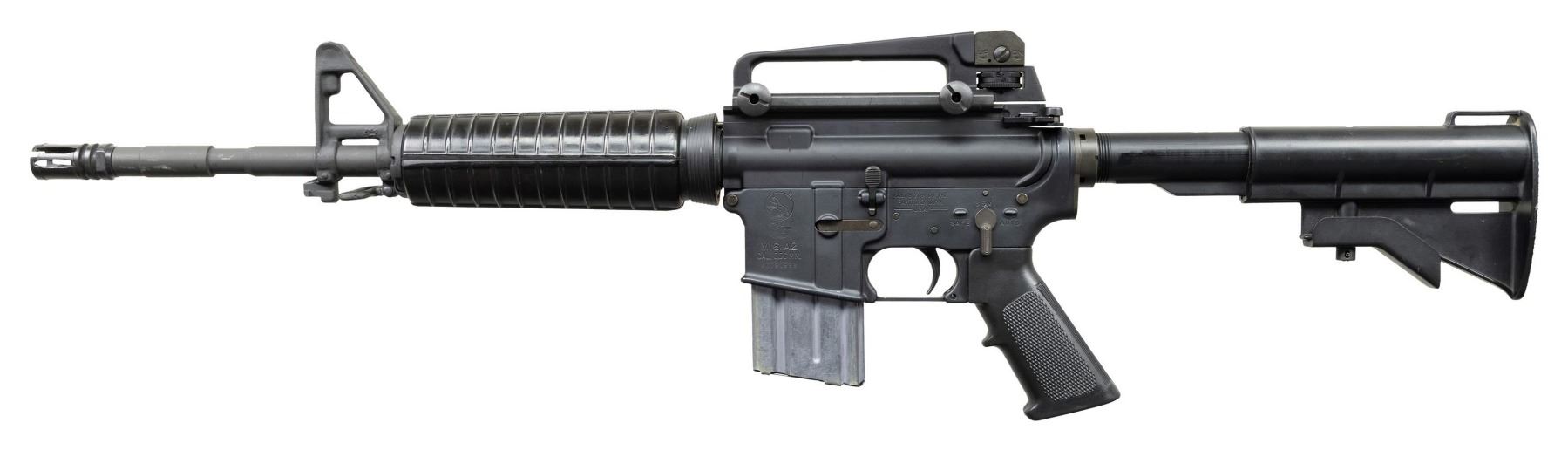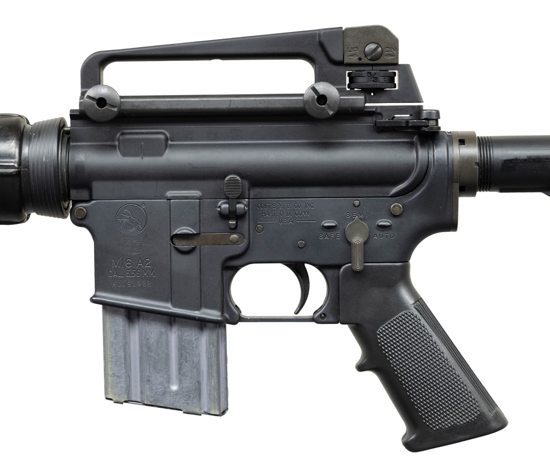 ***BIDDERS INTERESTED IN THIS LOT MUST CURRENTLY HOLD A TYPE 07, 08, 10, OR 11 FFL.*** Cal 5.56mm. S# A0091982. Bbl 16" over muzzle brake. Manufactured by Colt Manufacturing Company Hartford, Connecticut with safe, semi and auto selector positions. A2 style carry handle, hand guard and front sight. Telescopic Stock. MAGS: 1-20rd. CONDITION: overall very good metal finish with some mild scuffs on the barrel and a few light scratches on the receiver. Shiny bore with good rifling. POST 1986 DEALER SAMPLE MACHINE GUN WITH NO LAW (DEMO) LETTER REQUIRED TO TRANSFER. RESTRICTED REGISTRATION POSSESSION LIMITED TO CONTINUED COMPLIANCE WITH PROVISIONS OF PUBLIC LAW 99-308. IF YOU ARE AN 07, 08, 10, or 11 FFL/SOT YOU MAY TAKE TRANSFER OF THIS FIREARM UPON APPROVAL OF TRANSFER. PROVENANCE: Military Museum Collection of Shooters Outpost, Hooksett NH. THIS ITEM WILL BE AVAILABLE FOR PREVIEW BY APPOINTMENT AT THE SHOOTERS OUTPOST MUSEUM IN HOOKSETT, NH. TO SET UP AN APPOINTMENT, PLEASE CALL 207-453-2114. (50-1888/ZAL). MODERN CLASS III. $1,800-2,500.