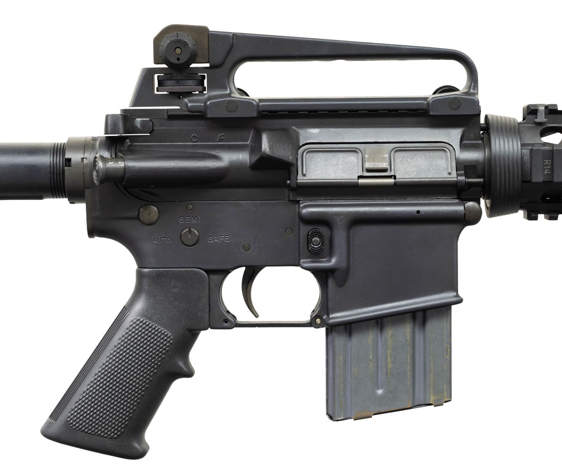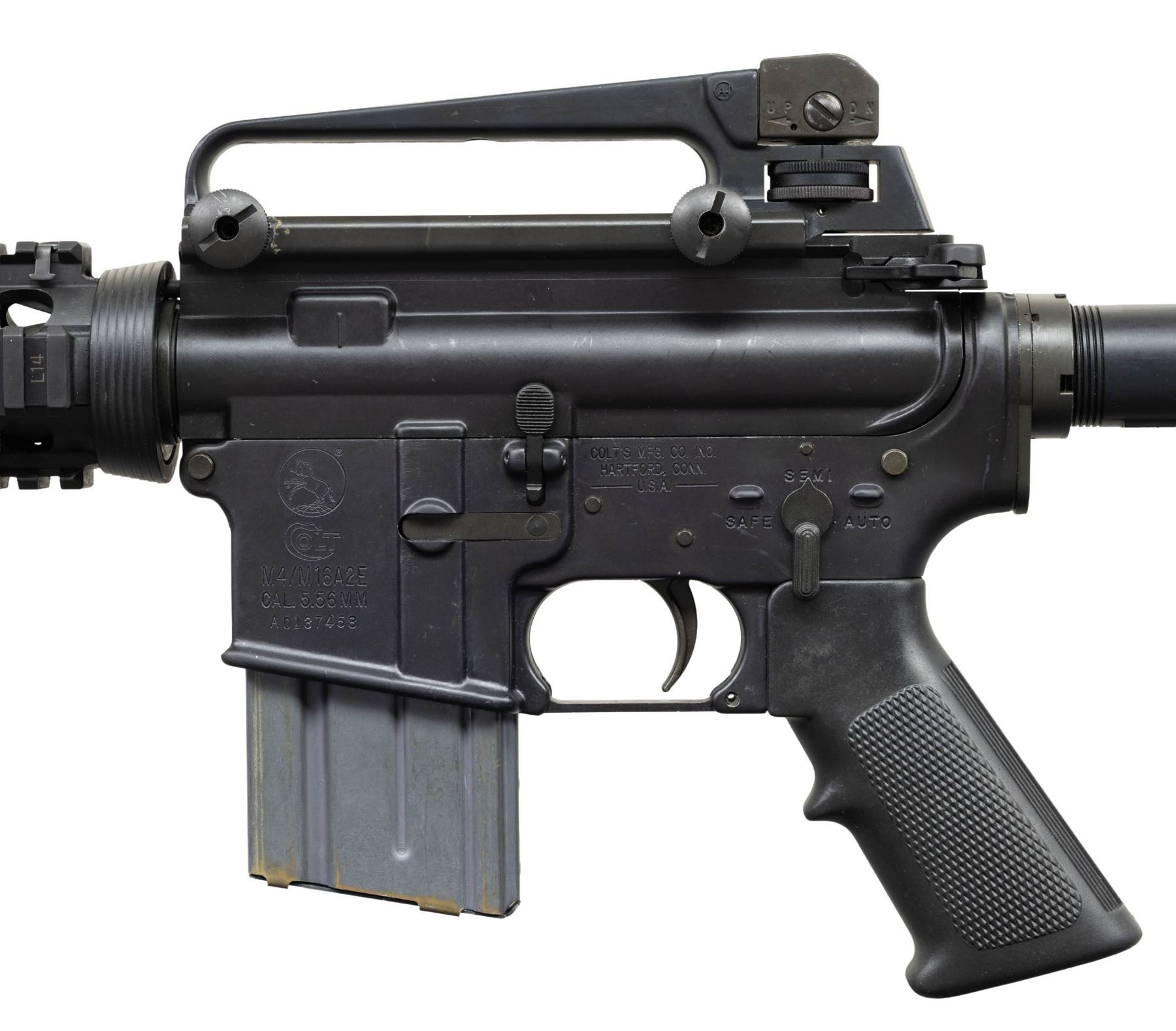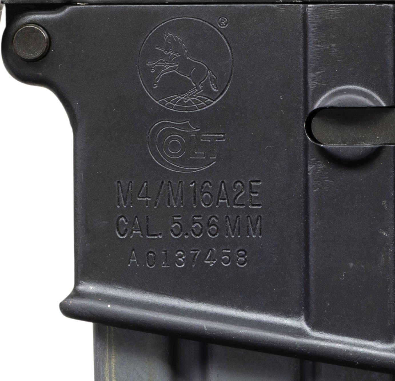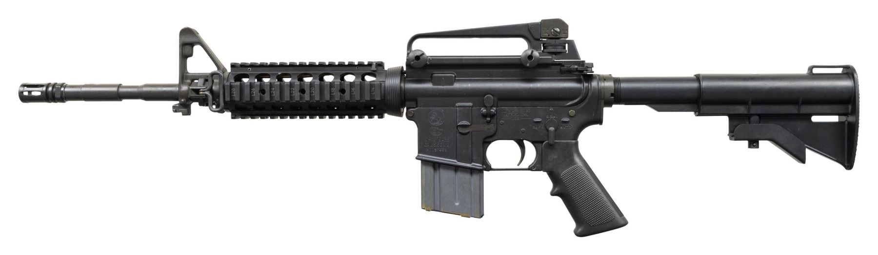 MACHINE GUN. ***BIDDERS INTERESTED IN THIS LOT MUST CURRENTLY HOLD A TYPE 07, 08, 10, OR 11 FFL.*** Cal 5.56mm. S# A0137458. Bbl is 16" over muzzle brake. Manufactured by Colt Manufacturing Company Hartford, Connecticut. Safe, semi and auto selector positions. Collapsible stock. A2 Style carry handle and front sight with bayonet left. Quad rail forearm. MAGS: 1 Colt AR15 20-rd. CONDITION: overall very good with a few minor handling marks. very fine bore with nice rifling. POST 1986 DEALER SAMPLE MACHINE GUN WITH NO LAW (DEMO) LETTER REQUIRED TO TRANSFER. RESTRICTED REGISTRATION POSSESSION LIMITED TO CONTINUED COMPLIANCE WITH PROVISIONS OF PUBLIC LAW 99-308. IF YOU ARE AN 07, 08, 10, or 11 FFL/SOT YOU MAY TAKE TRANSFER OF THIS FIREARM UPON APPROVAL OF TRANSFER. PROVENANCE: Military Museum Collection of Shooters Outpost, Hooksett NH. THIS ITEM WILL BE AVAILABLE FOR PREVIEW BY APPOINTMENT AT THE SHOOTERS OUTPOST MUSEUM IN HOOKSETT, NH. TO SET UP AN APPOINTMENT, PLEASE CALL 207-453-2114. (50-1885/ZAL). MODERN CLASS III. $1,800-2,500.