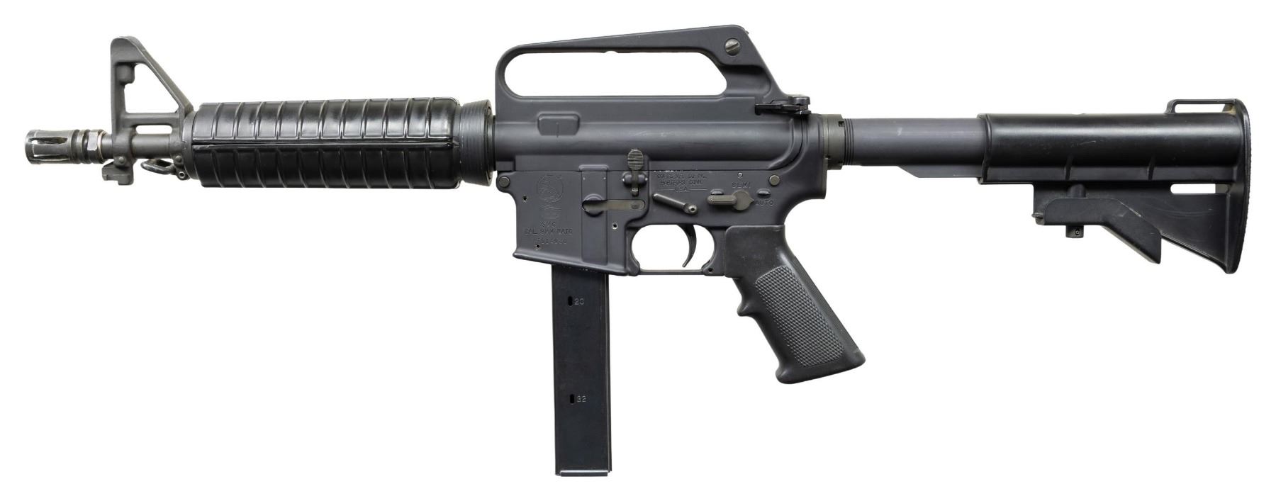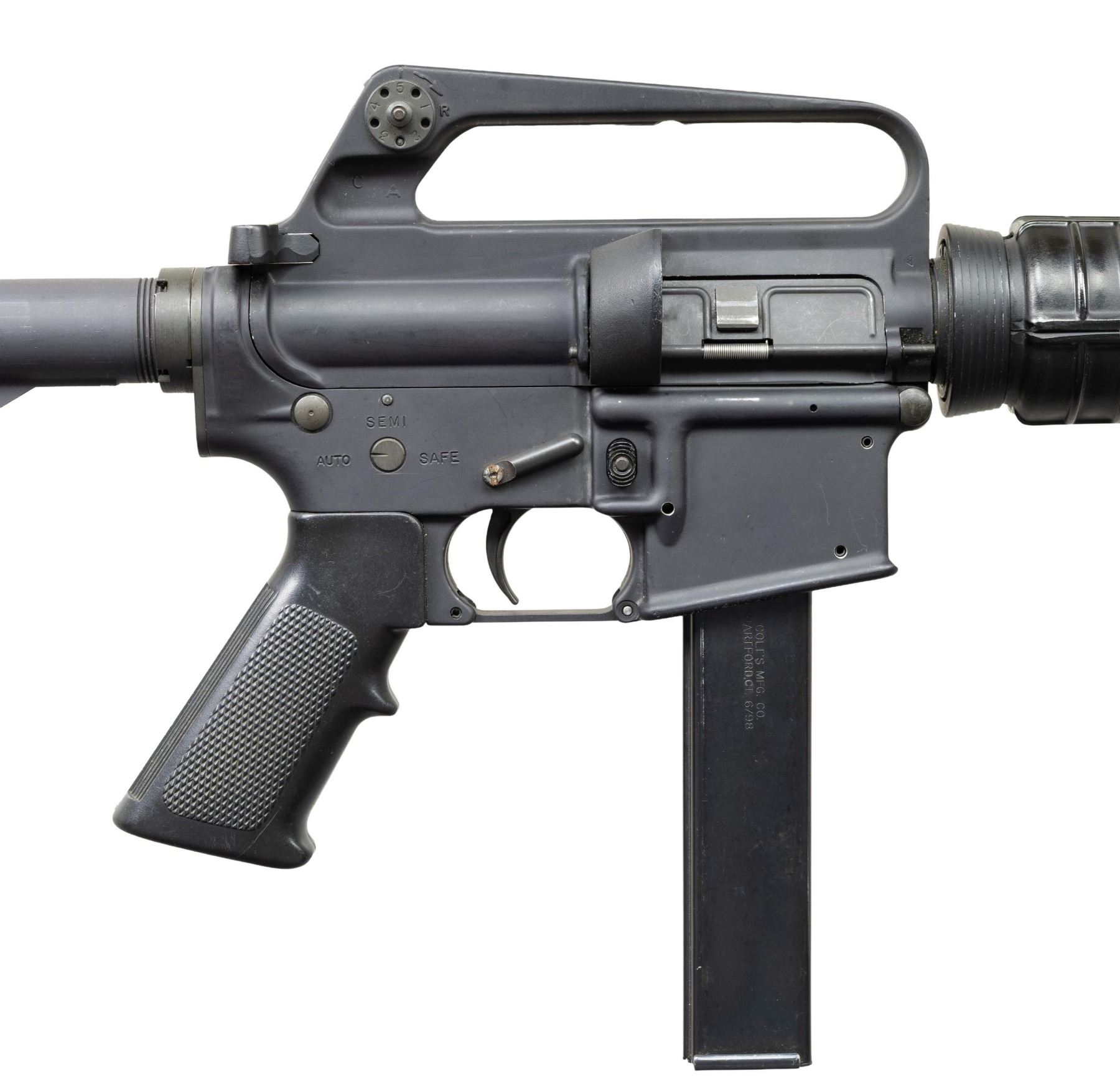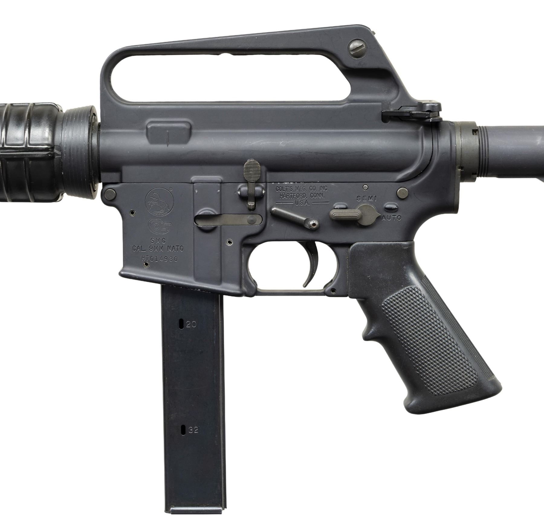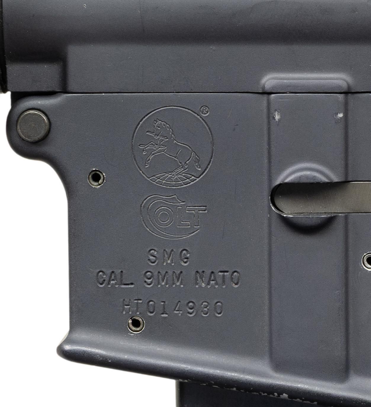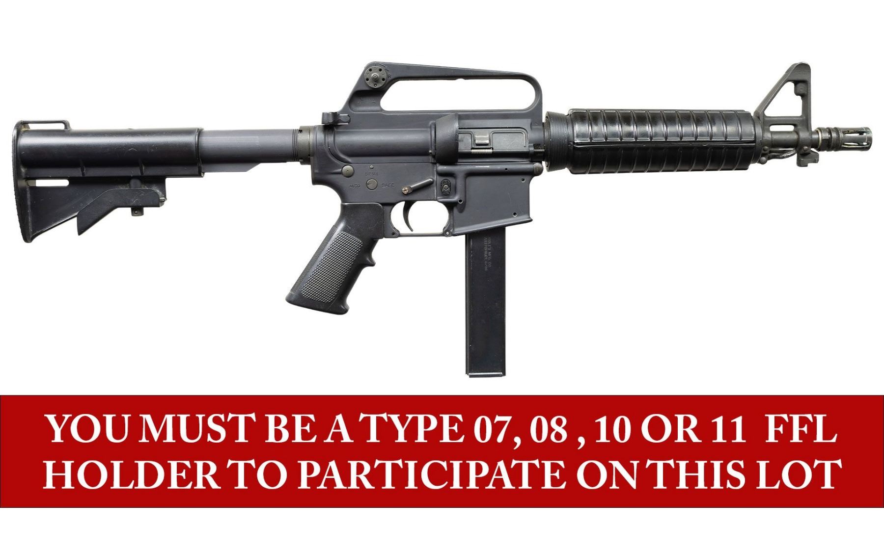 ***BIDDERS INTERESTED IN THIS LOT MUST CURRENTLY HOLD A TYPE 07, 08, 10, OR 11 FFL.*** Cal. 9mm Nato. S# HT014930. Bbl 11.5" over flash hider. Manufactured by Colt Manufacturing Company Hartford, Company with safe, semi and auto selector positions. A2 hand guard, carry handle and front sight. Telescopic stock. MAGS: 1-32rd. CONDITION: overall very good with some minor handling marks and some flaking finish in mag well area. Frosted bore with scattered pitting and sharp rifling. POST 1986 DEALER SAMPLE MACHINE GUN WITH NO LAW (DEMO) LETTER REQUIRED TO TRANSFER. RESTRICTED REGISTRATION POSSESSION LIMITED TO CONTINUED COMPLIANCE WITH PROVISIONS OF PUBLIC LAW 99-308. IF YOU ARE AN 07, 08, 10, or 11 FFL/SOT YOU MAY TAKE TRANSFER OF THIS FIREARM UPON APPROVAL OF TRANSFER. PROVENANCE: Military Museum Collection of Shooters Outpost, Hooksett NH. THIS ITEM WILL BE AVAILABLE FOR PREVIEW BY APPOINTMENT AT THE SHOOTERS OUTPOST MUSEUM IN HOOKSETT, NH. TO SET UP AN APPOINTMENT, PLEASE CALL 207-453-2114. (50-1887/ZAL). MODERN CLASS III. $1,800-2,500.