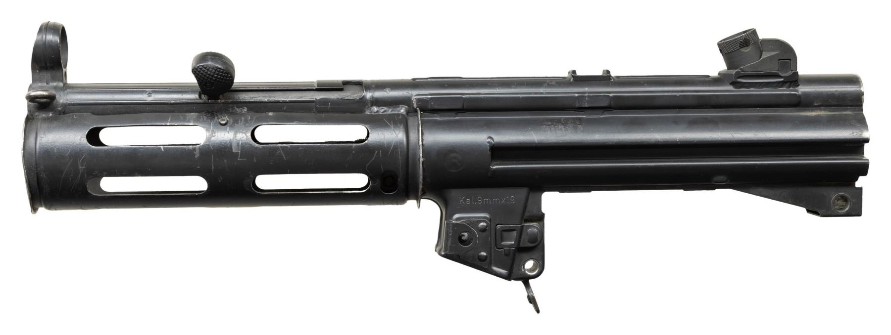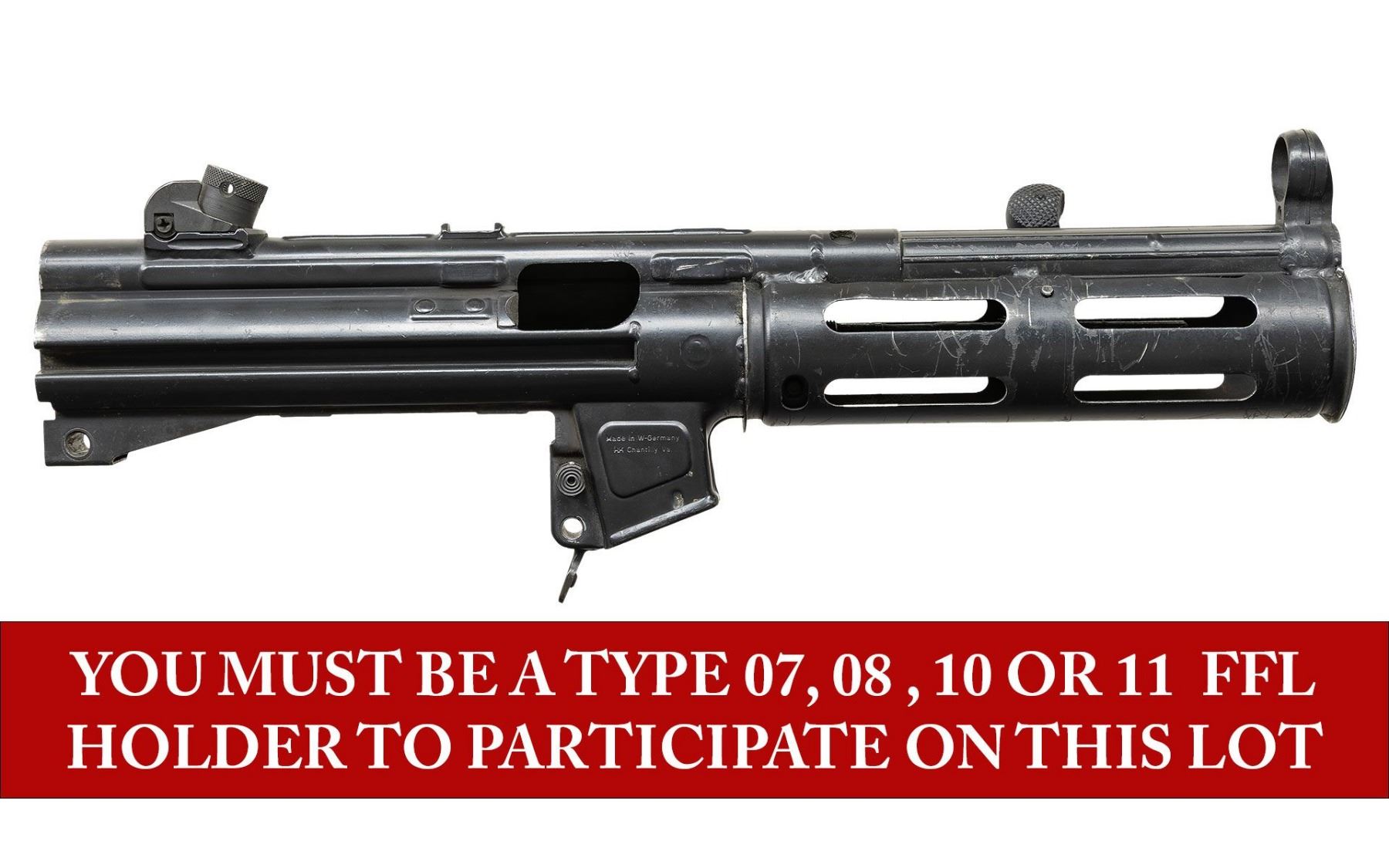 RECEIVER. ***BIDDERS INTERESTED IN THIS LOT MUST CURRENTLY HOLD A TYPE 07, 08, 10, OR 11 FFL.*** Cal 9x19. S# S97763. Bbl 6". Made in West Germany. Top rib is marked with manufacturer, model, serial number and Eagle NIG antler proof. Includes charging handle, rear sight and magazine release. No other mechanical components. CONDITION: overall fair to good with numerous scattered scratches and handling marks, as well as some high edge wear. Bore is frosted with pitting and some wear to the rifling. POST 1986 DEALER SAMPLE MACHINE GUN WITH NO LAW (DEMO) LETTER REQUIRED TO TRANSFER. RESTRICTED REGISTRATION POSSESSION LIMITED TO CONTINUED COMPLIANCE WITH PROVISIONS OF PUBLIC LAW 99-308. IF YOU ARE AN 07, 08, 10, or 11 FFL/SOT YOU MAY TAKE TRANSFER OF THIS FIREARM UPON APPROVAL OF TRANSFER. PROVENANCE: Military Museum Collection of Shooters Outpost, Hooksett NH. THIS ITEM WILL BE AVAILABLE FOR PREVIEW BY APPOINTMENT AT THE SHOOTERS OUTPOST MUSEUM IN HOOKSETT, NH. TO SET UP AN APPOINTMENT, PLEASE CALL 207-453-2114. (50-1896/ZAL). MODERN CLASS III. $600-1,200.