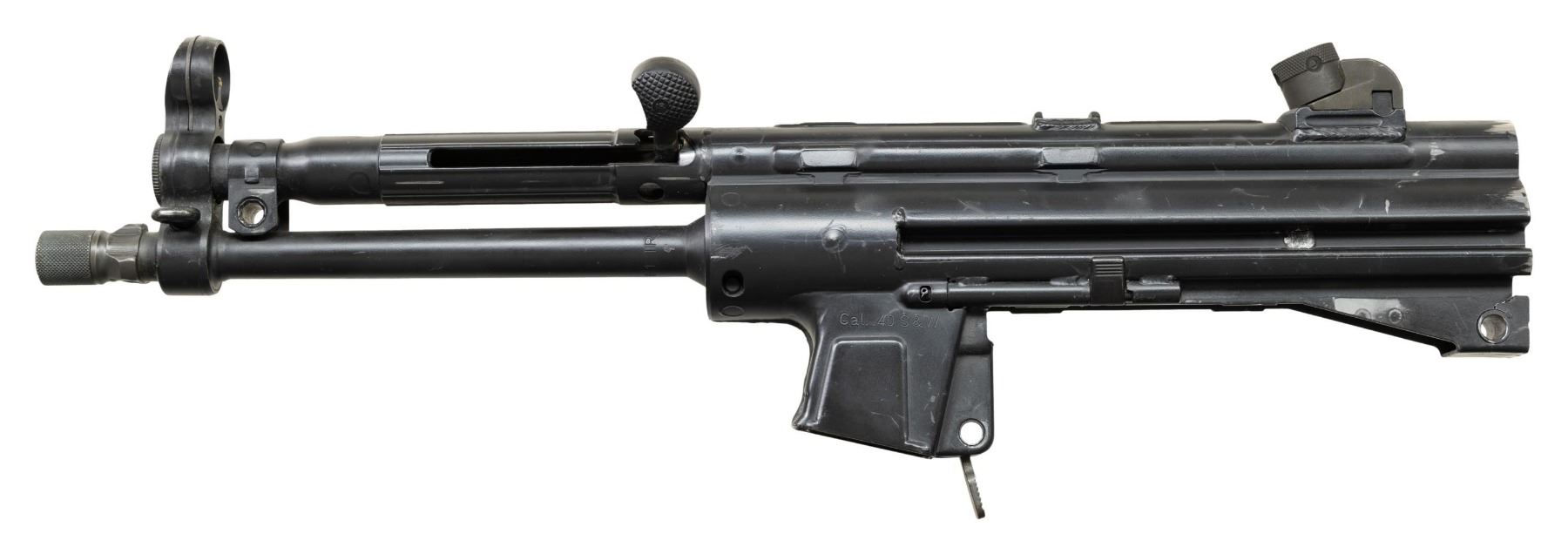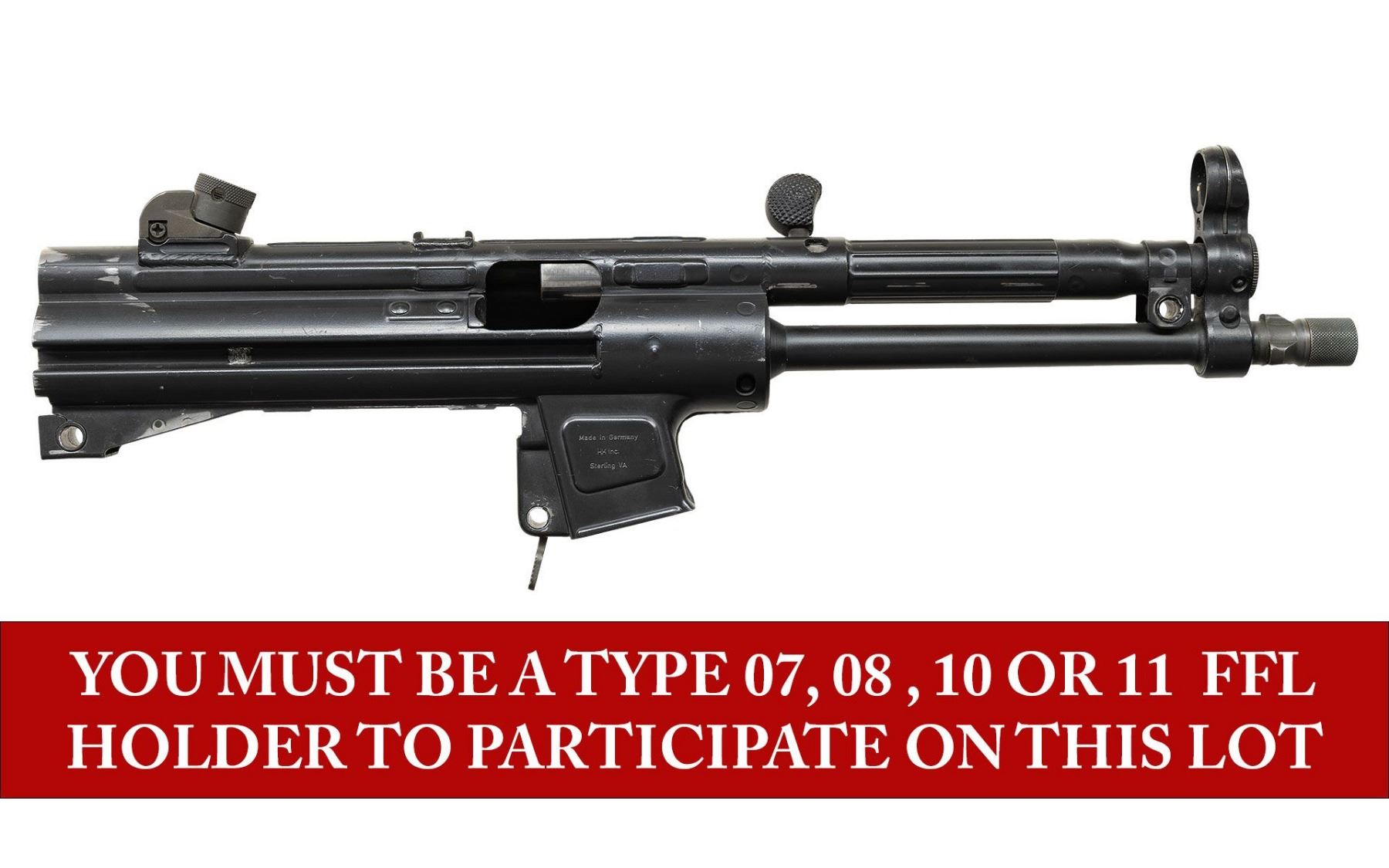 RECEIVER. ***BIDDERS INTERESTED IN THIS LOT MUST CURRENTLY HOLD A TYPE 07, 08, 10, OR 11 FFL.*** Cal 40 S&W. S# 69-149. Bbl 8" threaded with knurled thread protector manufactured in Germany. Top rib is marked with the manufactured, model, serial number and Eagle NKD Antler proof. Includes charging handle, rear sight and paddle magazine release. No other mechanical components. CONDITION: overall fair with scattered handling marks, scuffs and some high edge wear. Bore is bright with some wear to the rifling. POST 1986 DEALER SAMPLE MACHINE GUN WITH NO LAW (DEMO) LETTER REQUIRED TO TRANSFER. RESTRICTED REGISTRATION POSSESSION LIMITED TO CONTINUED COMPLIANCE WITH PROVISIONS OF PUBLIC LAW 99-308. IF YOU ARE AN 07, 08, 10, or 11 FFL/SOT YOU MAY TAKE TRANSFER OF THIS FIREARM UPON APPROVAL OF TRANSFER. PROVENANCE: Military Museum Collection of Shooters Outpost, Hooksett NH. THIS ITEM WILL BE AVAILABLE FOR PREVIEW BY APPOINTMENT AT THE SHOOTERS OUTPOST MUSEUM IN HOOKSETT, NH. TO SET UP AN APPOINTMENT, PLEASE CALL 207-453-2114. (50-1919/ZAL). MODERN. CLASS III. $600-1,200.