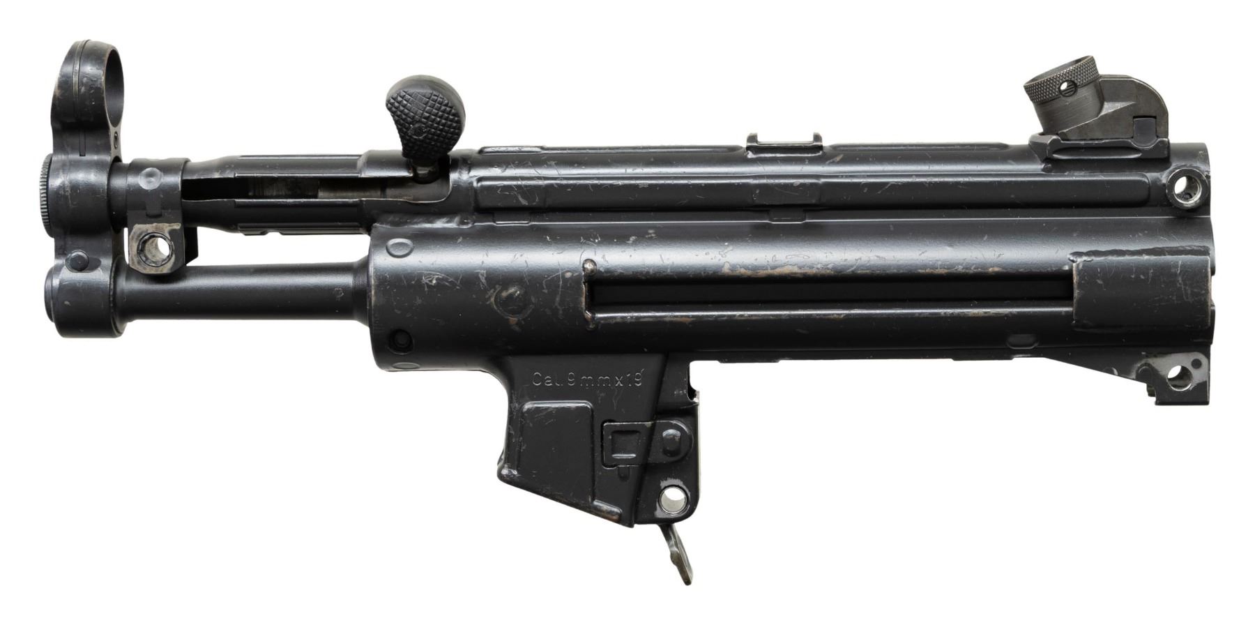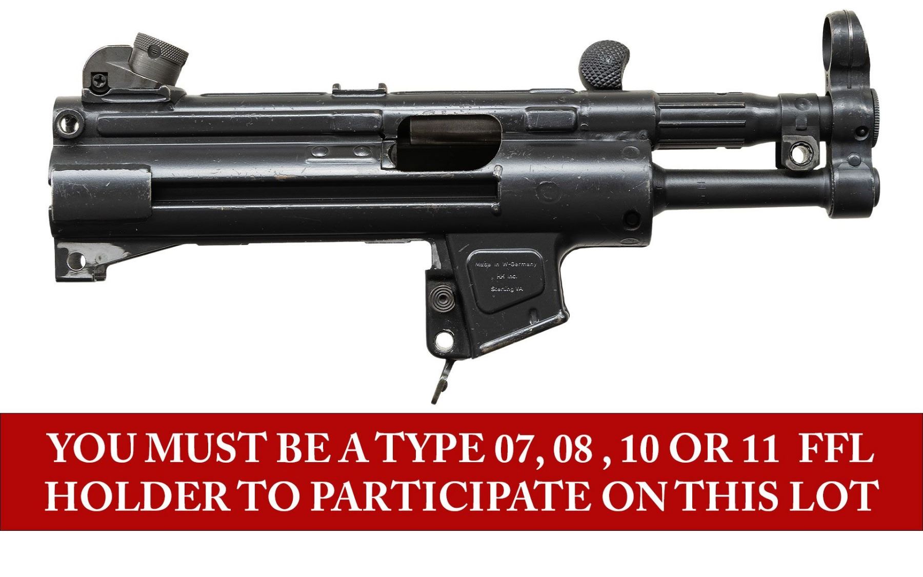 ***BIDDERS INTERESTED IN THIS LOT MUST CURRENTLY HOLD A TYPE 07, 08, 10, OR 11 FFL.*** Cal. 9x19. S# 64-13018. Bbl 5". Manufactured in West Germany. Top rail marked "HK MP 5K, Serial Number and Eagle-NIK Antler proof". Includes charging handle, rear sight, push button and paddle mag release. CONDITION: overall good with scattered handling marks and flaking finish. Lightly frosted bore showing wear to the rifling. POST 1986 DEALER SAMPLE MACHINE GUN WITH NO LAW (DEMO) LETTER REQUIRED TO TRANSFER. RESTRICTED REGISTRATION POSSESSION LIMITED TO CONTINUED COMPLIANCE WITH PROVISIONS OF PUBLIC LAW 99-308. IF YOU ARE AN 07, 08, 10, or 11 FFL/SOT YOU MAY TAKE TRANSFER OF THIS FIREARM UPON APPROVAL OF TRANSFER. PROVENANCE: Military Museum Collection of Shooters Outpost, Hooksett NH. THIS ITEM WILL BE AVAILABLE FOR PREVIEW BY APPOINTMENT AT THE SHOOTERS OUTPOST MUSEUM IN HOOKSETT, NH. TO SET UP AN APPOINTMENT, PLEASE CALL 207-453-2114. (50-1923/ZAL). MODERN CLASS III. $600-1,200.