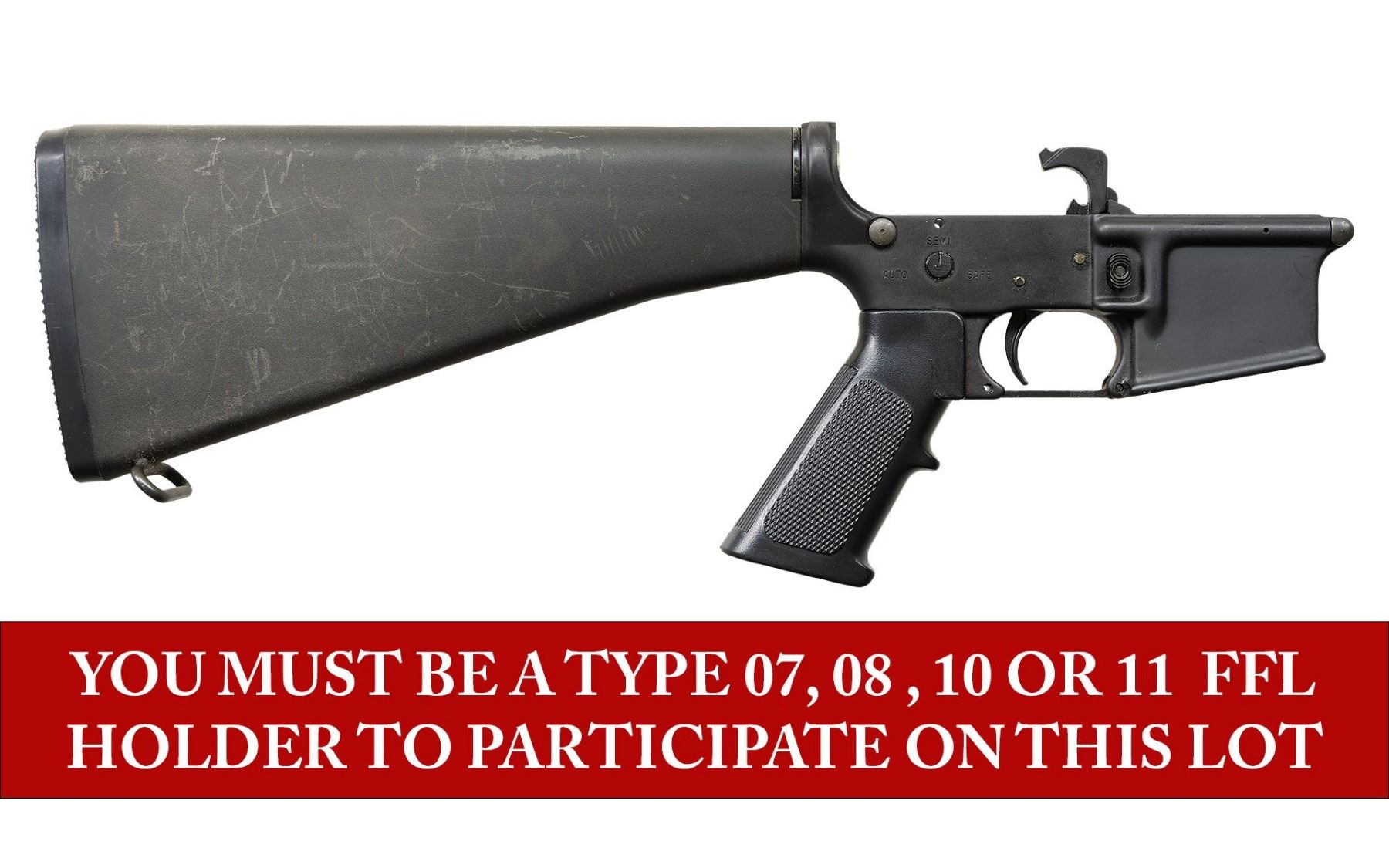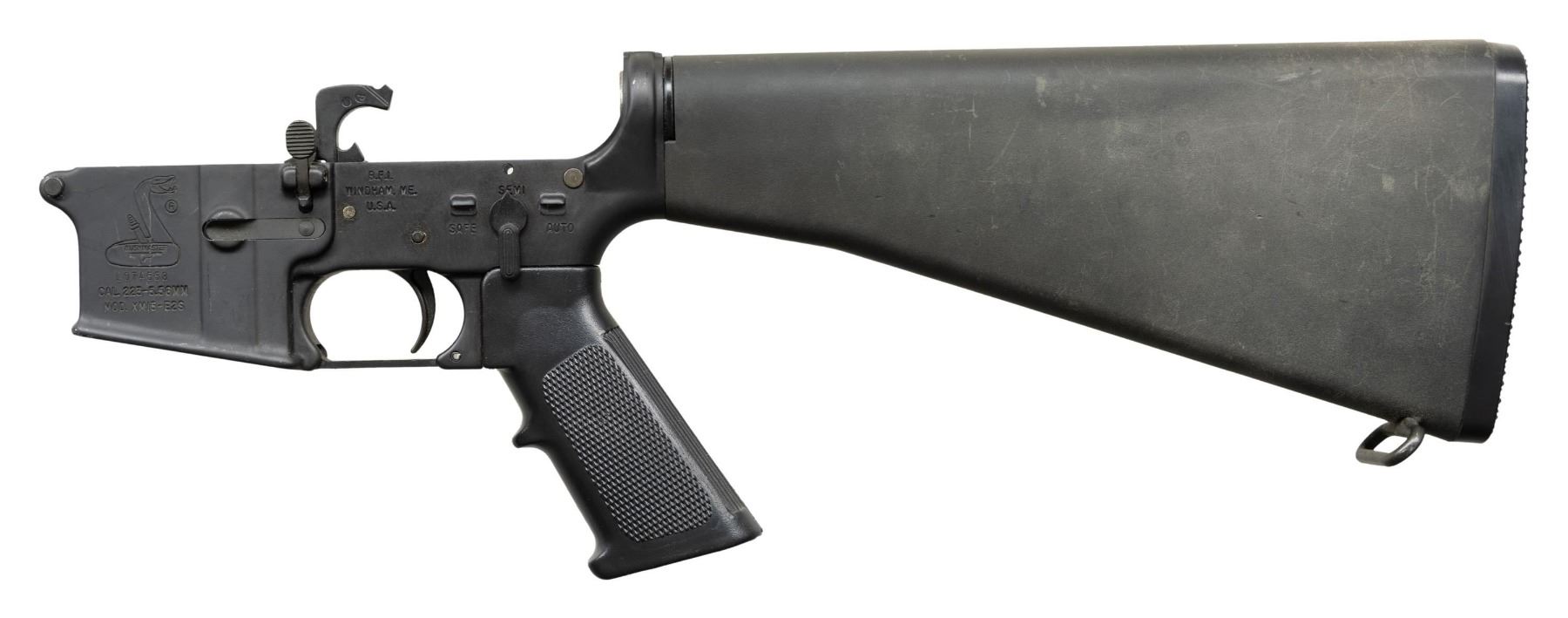RECEIVER. ***BIDDERS INTERESTED IN THIS LOT MUST CURRENTLY HOLD A TYPE 07, 08, 10, OR 11 FFL.*** Cal 5.56mm. S# L074558. Bushmaster factory full auto, manufactured by B.F.I. Windham, Maine with safe, semi and auto selector positions. Includes internal mechanical components, A2 stock and pistol grip. CONDITION: overall very good with some minor receiver blemishes, stock has moderated scattered handling marks. Auto sear absent. POST 1986 DEALER SAMPLE MACHINE GUN WITH NO LAW (DEMO) LETTER REQUIRED TO TRANSFER. RESTRICTED REGISTRATION POSSESSION LIMITED TO CONTINUED COMPLIANCE WITH PROVISIONS OF PUBLIC LAW 99-308. IF YOU ARE AN 07, 08, 10, or 11 FFL/SOT YOU MAY TAKE TRANSFER OF THIS FIREARM UPON APPROVAL OF TRANSFER. PROVENANCE: Military Museum Collection of Shooters Outpost, Hooksett NH. THIS ITEM WILL BE AVAILABLE FOR PREVIEW BY APPOINTMENT AT THE SHOOTERS OUTPOST MUSEUM IN HOOKSETT, NH. TO SET UP AN APPOINTMENT, PLEASE CALL 207-453-2114. (50-1876/ZAL). MODERN CLASS III. $200-400.