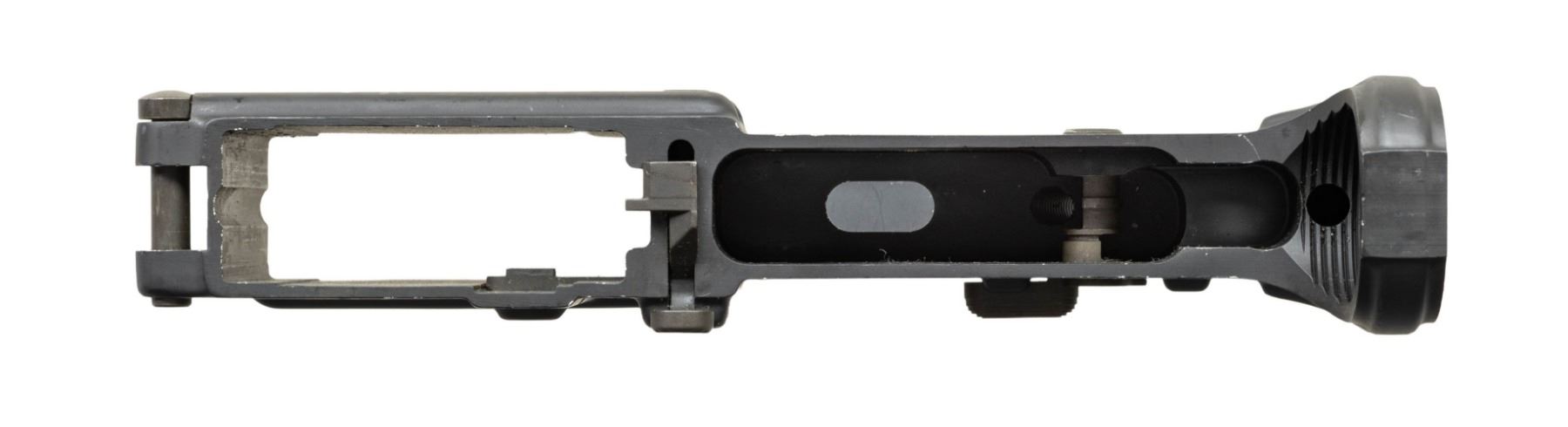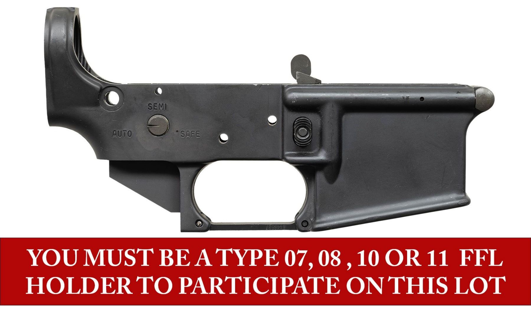 RECEIVER. ***BIDDERS INTERESTED IN THIS LOT MUST CURRENTLY HOLD A TYPE 07, 08, 10, OR 11 FFL.*** Cal 5.56mm. S# L130749. Bushmaster factory full auto, manufactured by B.F.I Windham, Maine with safe, semi & auto selector positions. Fitted with bolt catch, magazine release and selector switch. CONDITION: overall very good with a few minor blemishes and a small patch of minor oxidation on the left side. POST 1986 DEALER SAMPLE MACHINE GUN WITH NO LAW (DEMO) LETTER REQUIRED TO TRANSFER. RESTRICTED REGISTRATION POSSESSION LIMITED TO CONTINUED COMPLIANCE WITH PROVISIONS OF PUBLIC LAW 99-308. IF YOU ARE AN 07, 08, 10, or 11 FFL/SOT YOU MAY TAKE TRANSFER OF THIS FIREARM UPON APPROVAL OF TRANSFER. PROVENANCE: Military Museum Collection of Shooters Outpost, Hooksett NH. THIS ITEM WILL BE AVAILABLE FOR PREVIEW BY APPOINTMENT AT THE SHOOTERS OUTPOST MUSEUM IN HOOKSETT, NH. TO SET UP AN APPOINTMENT, PLEASE CALL 207-453-2114. (50-1873/ZAL). MODERN CLASS III. $100-300.