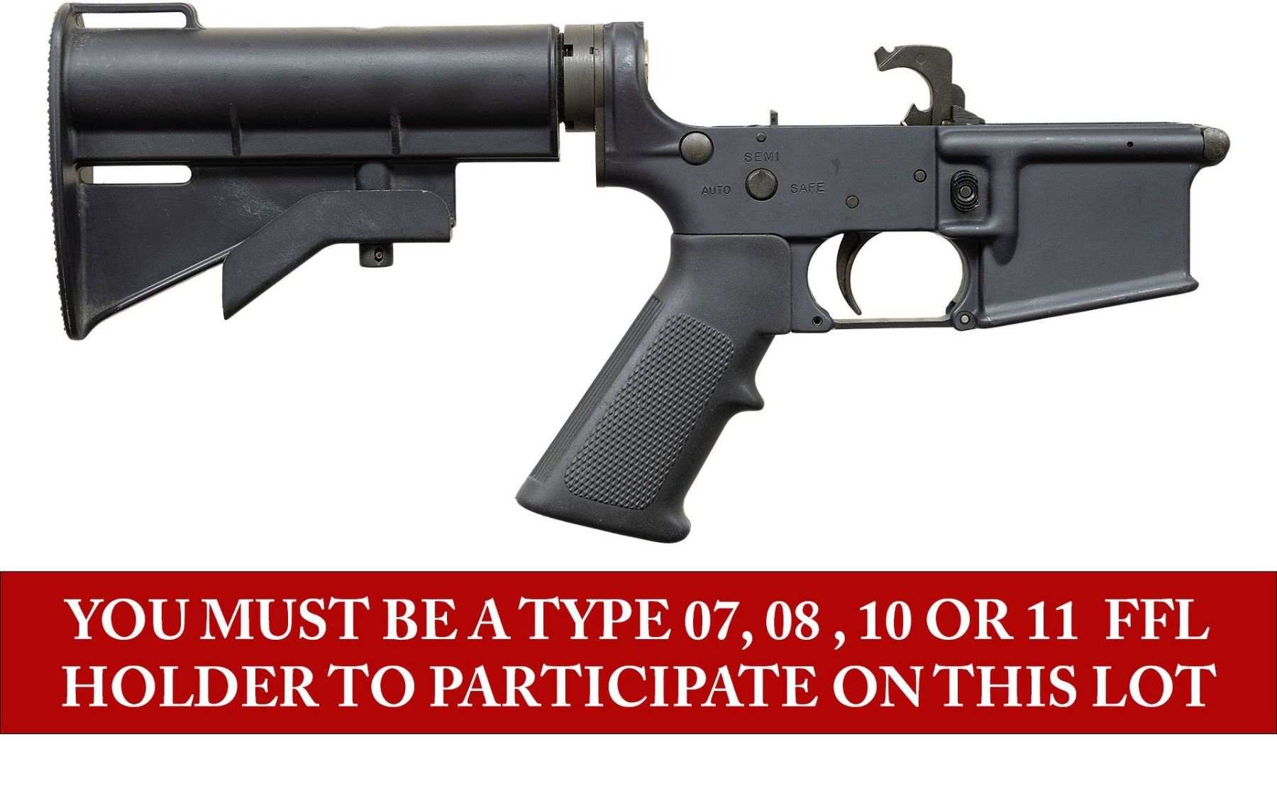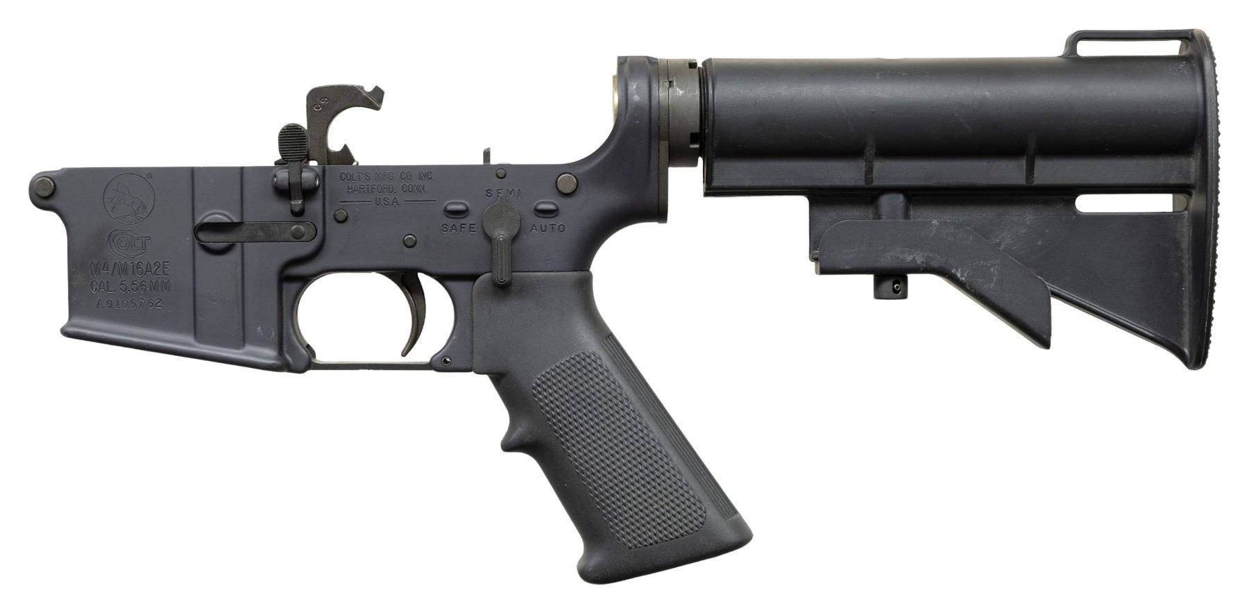 RECEIVER. ***BIDDERS INTERESTED IN THIS LOT MUST CURRENTLY HOLD A TYPE 07, 08, 10, OR 11 FFL.*** Cal 5.56mm. S# A0105762. Manufactured by Colt Manufacturing Company in Hartford, Connecticut with safe, semi & auto selector positions. Includes internal mechanics, collapsible stock and grip. CONDITION: overall very fine with only a few minor blemishes. POST 1986 DEALER SAMPLE MACHINE GUN WITH NO LAW (DEMO) LETTER REQUIRED TO TRANSFER. RESTRICTED REGISTRATION POSSESSION LIMITED TO CONTINUED COMPLIANCE WITH PROVISIONS OF PUBLIC LAW 99-308. IF YOU ARE AN 07, 08, 10, or 11 FFL/SOT YOU MAY TAKE TRANSFER OF THIS FIREARM UPON APPROVAL OF TRANSFER. PROVENANCE: Military Museum Collection of Shooters Outpost, Hooksett NH. THIS ITEM WILL BE AVAILABLE FOR PREVIEW BY APPOINTMENT AT THE SHOOTERS OUTPOST MUSEUM IN HOOKSETT, NH. TO SET UP AN APPOINTMENT, PLEASE CALL 207-453-2114. (50-1886/ZAL). MODERN CLASS III. $500-800.