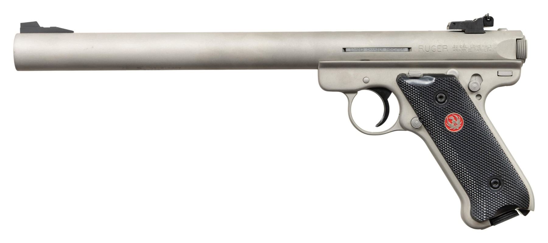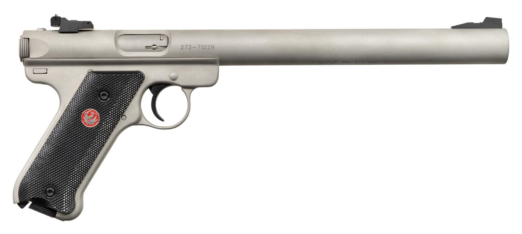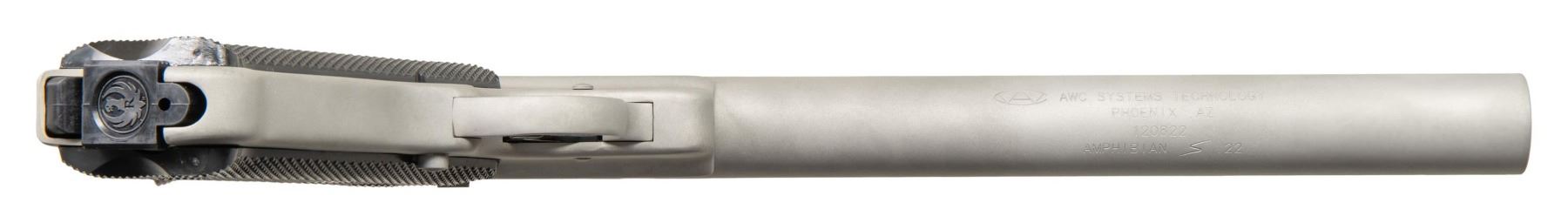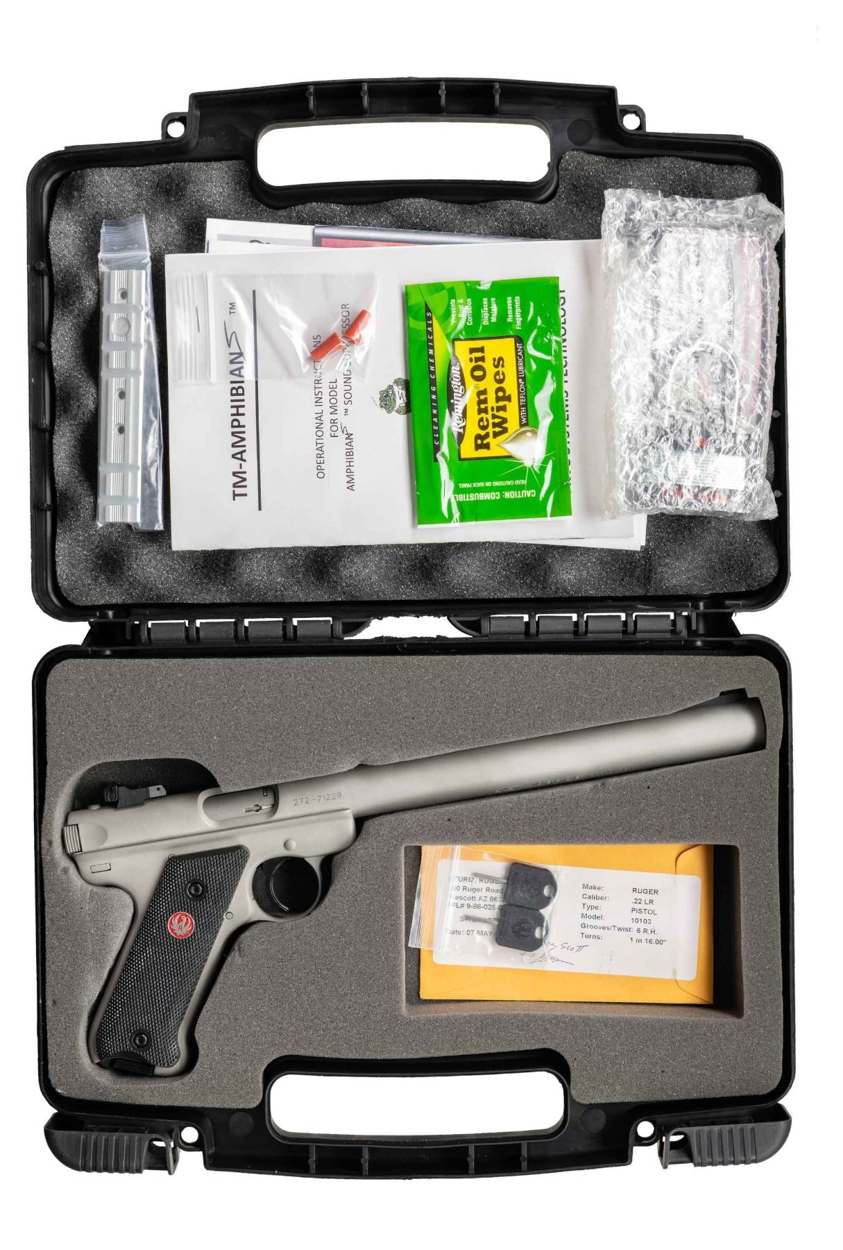 RUGER MARK III TARGET SEMI AUTO PISTOL. Cal. 22LR. S# Host= 272-71229, SUPP. = 120822. Bbl 9" serrated ramp front sight. Square notch adjustable rear sight. Left side of tube is marked "Ruger.22CAL Long Rifle/-Mark III Target-". Bottom of tube is marked "AWC SystemsTechnology/Phoenix.AZ/120822/Amphibian.22". Matte stainless steel finish. Red Eagle Grips. MAGS: 1-10 Round. UNATTACHED ACCESSORIES: Original AWC Amphibian box, manual, sight rail, lock. CONDITION: all aspects near excellent appears unfired. NATIONAL FIREARMS ACT SOUND SUPPRESSOR REQUIRING BATF TRANSFER BEFORE TAKING POSSESSION. FULLY TRANSFERABLE. PROVENANCE: Military Museum Collection of Shooters Outpost, Hooksett NH. (03-1948 & 26-3/ZAL/VK). MODERN. CLASS III. $1,400-1,800.