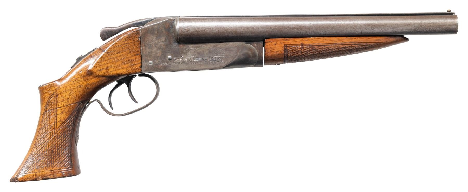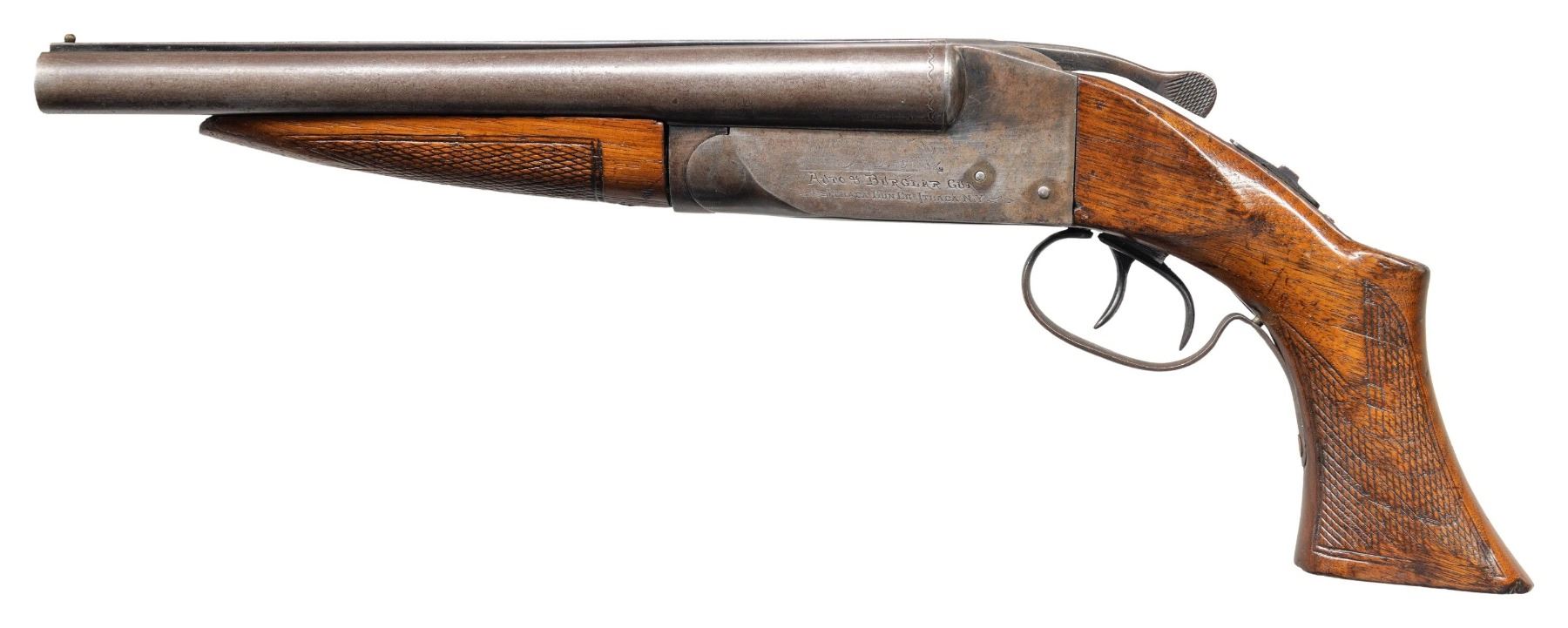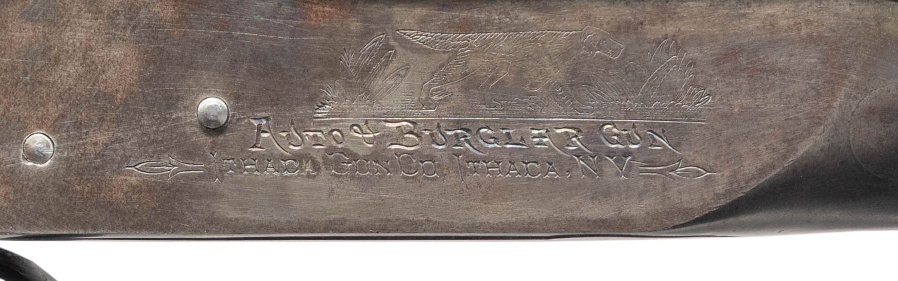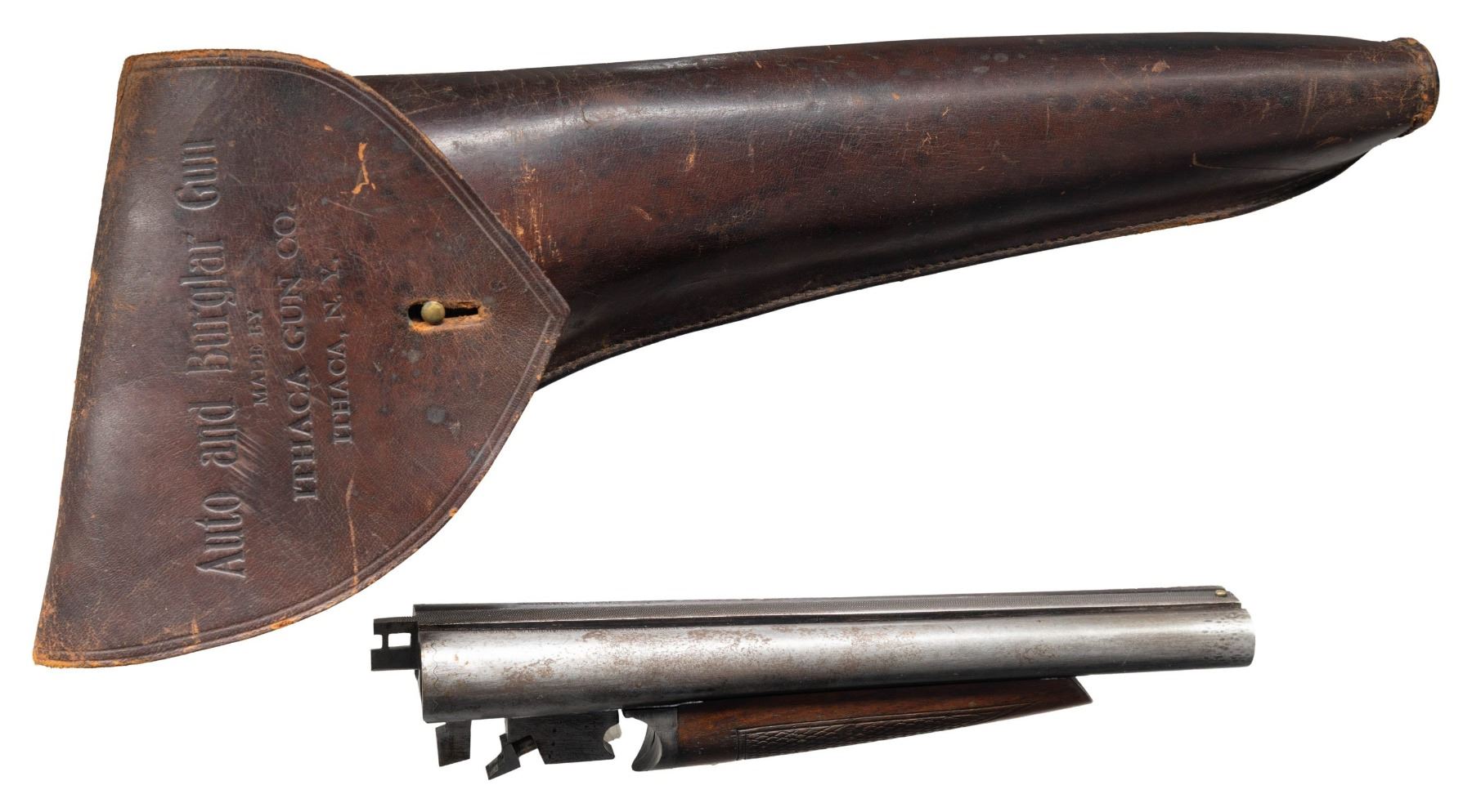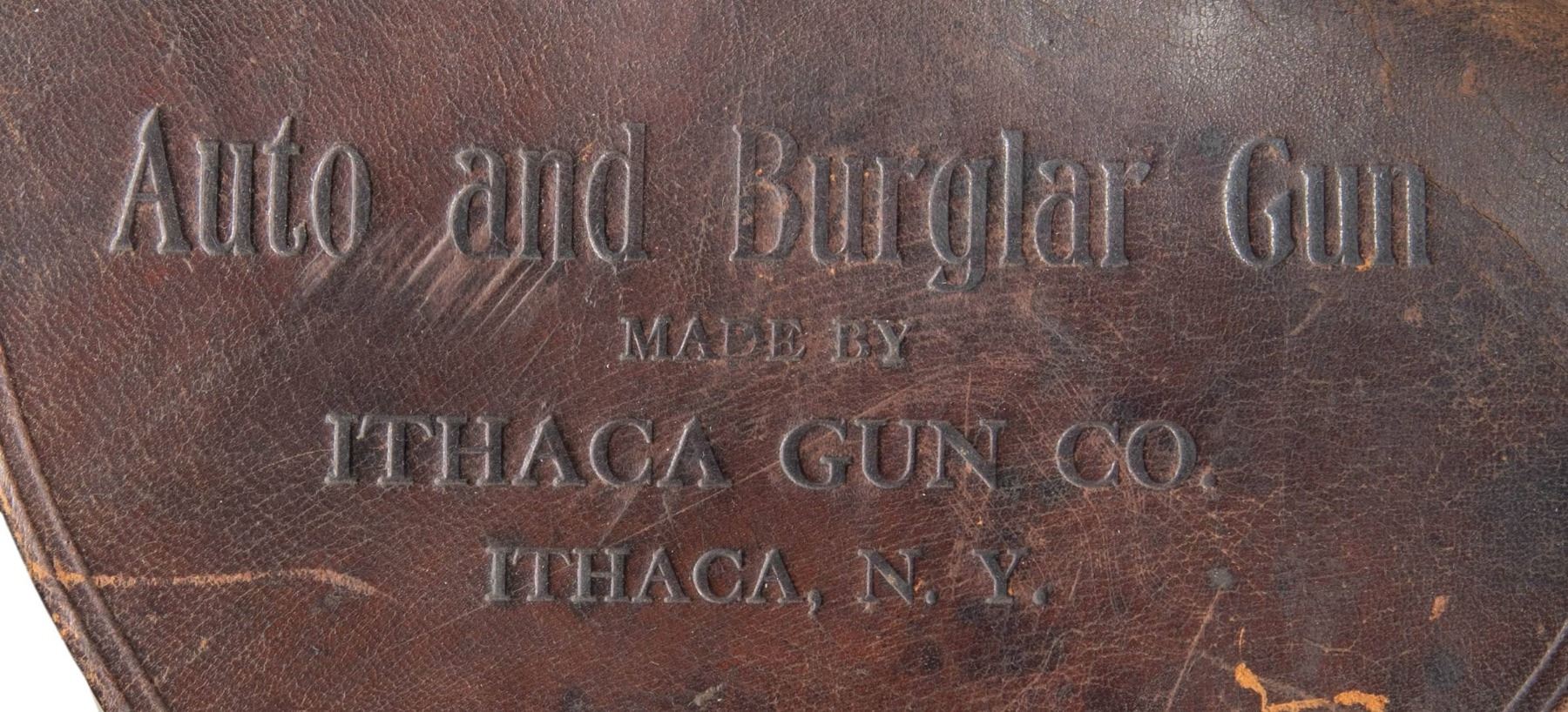 Cal. 20 Ga. S# 346430. 10" Bbl. Manufactured between 1926-1934. A rare example from a total of only approximately 1500 of these second model Ithaca AOWs manufactured. These have earned the unofficial designation of "Model A" among collectors. Ithaca ceased production of the entire project in 1934 when the National Firearms Act of 1934 imposed a prohibitive transfer tax of $200 on each gun to be sold, which was later reduced to a $5 transfer tax in 1960. These factors lead to very low production numbers, making them desirable & rare collectors pieces today. Stocks are checkered hardwood, w/o the original spur used in many of the first model guns. The receivers are engraved on both sides of the receiver; "Auto & Burglar Gun / Ithaca Gun Co., Ithaca, NY." w/ the familiar Retriever engraving. It is cased in it's fitted holster, embossed "Auto & Burglar Gun / Made By / Ithaca Gun Company. / Ithaca, N.Y.". Top, sliding tang safety. Front mounted brass bead. Dual triggers. Matching numbered forend, barrels & receiver. UNATTACHED ACCESSORIES: early, leather holster, embossed w/ "Auto & Burglar Gun / Made By / Ithaca Gun Company. / Ithaca, N.Y." on top flap. Brass flap hardware w/ sewn belt loop on rear, 1 spare barrel assembly & forend, numbered Ser # 361025 (not matching this gun). CONDITION: bluing on exposed metal surfaces enjoy full coverage which has faded to a dark grey / patina mix on barrels. Receiver case colors are visible w/ some small pops of blue remaining. Wood furniture illustrates small dents & impressions typical of soft case storage & period correct use. Wood has been sanded and has added finish. Wrist has a solid repair across its circumference. Bores are bright & shiny. Spare barrel assembly has much thinner finish w/ an abundance of old corrosion brought under control while retaining bright, shiny bores. NATIONAL FIREARMS ACT AOW REQUIRING BATF TRANSFER BEFORE TAKING POSSESSION. FULLY TRANSFERABLE. (03-1930/JZ). CURIO CLASS III. $6,000 - 9,000.