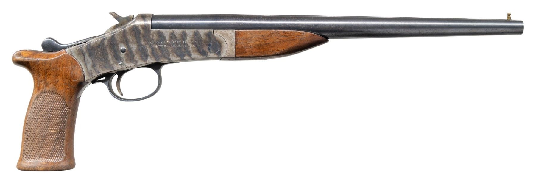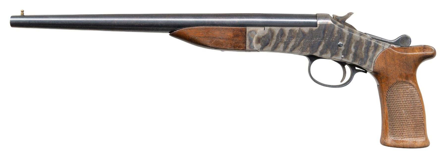 Cal. 410. S# 39615. Bbl. 12". Desirable gun, manufactured almost a century ago. The Harrington & Richardson (H&R) smooth bore Handy Gun was manufactured from the early 1920s through 1934. It is a small game gun that was commercially available in both .410 & 28Ga with barrels approximately 8" or 12". Though the exact number of Handy Guns manufactured is really unknown, it has been rumored that there were in excess of 25,000 produced. Blued barrel & "Tiger Stripe" cyanide dipped, case hardened receiver. Brass bead front sight. Checkered wooden pistol grip & smooth fore grip. Single shot break action. Bbl. marked on top "MADE IN U.S.A. .41GA CHOKE ". Considered an any other weapon by the National Firearms Act (AOW). CONDITION: numbers matching on barrel & frame. Case colors are vivid and well defined over the entire receiver. Barrel is uniform blued finish w/ extremely gentle patina visible under close inspection. Wood shows some typical handling marks, mostly in the form of light scratches, impressions & finish thinning. Bore is bright. NATIONAL FIREARMS ACT AOW REQUIRING BATF TRANSFER BEFORE TAKING POSSESSION. FULLY TRANSFERABLE. (03-1929/JZ). CURIO, CLASS III $1,000-1,500.