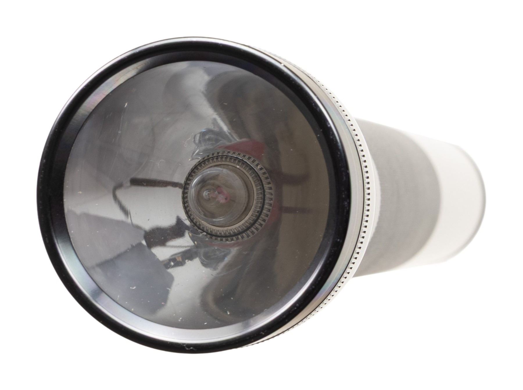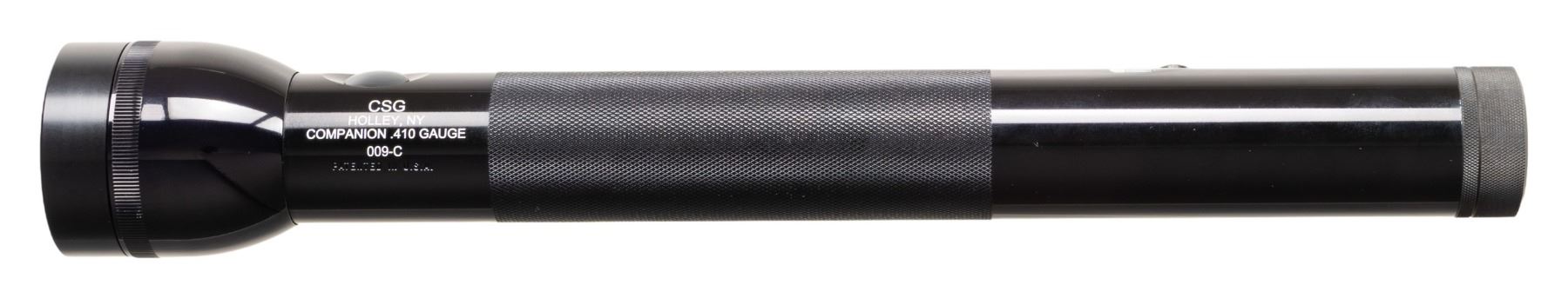 SINGLE SHOT FLASHLIGHT. Cal. 410 ga. S#009-C. Bbl 3". An interesting concealed shotgun within 15" Maglite style flashlight. CONDITION: Overall very fine. NATIONAL FIREARMS ACT ANY OTHER WEAPON REQUIRING BATF TRANSFER BEFORE TAKING POSSESSION. FULLY TRANSFERABLE. PROVENANCE: Military Museum Collection of Shooters Outpost, Hooksett NH. (03-1964/ZAL/VK). MODERN. CLASS III. $600-900.