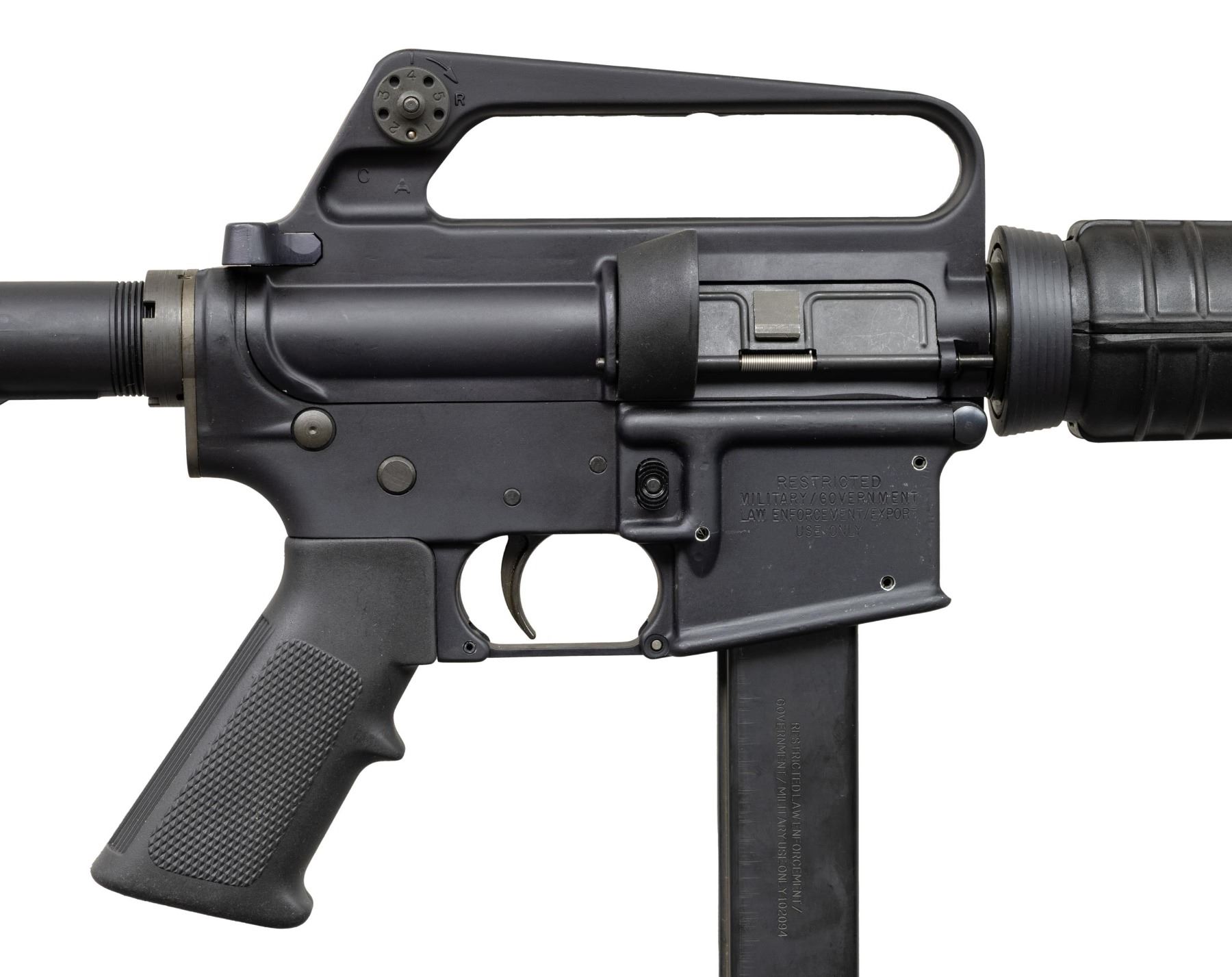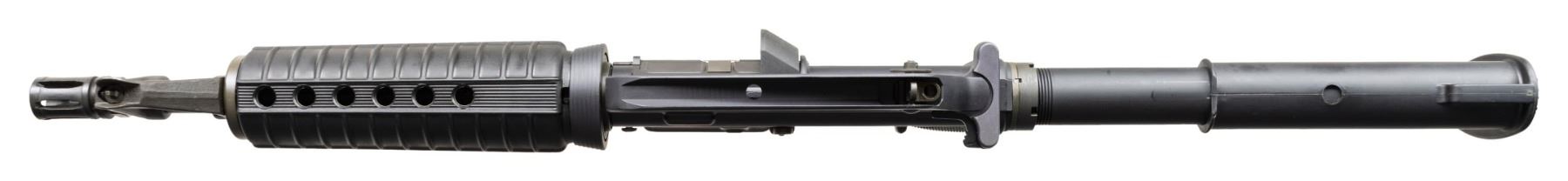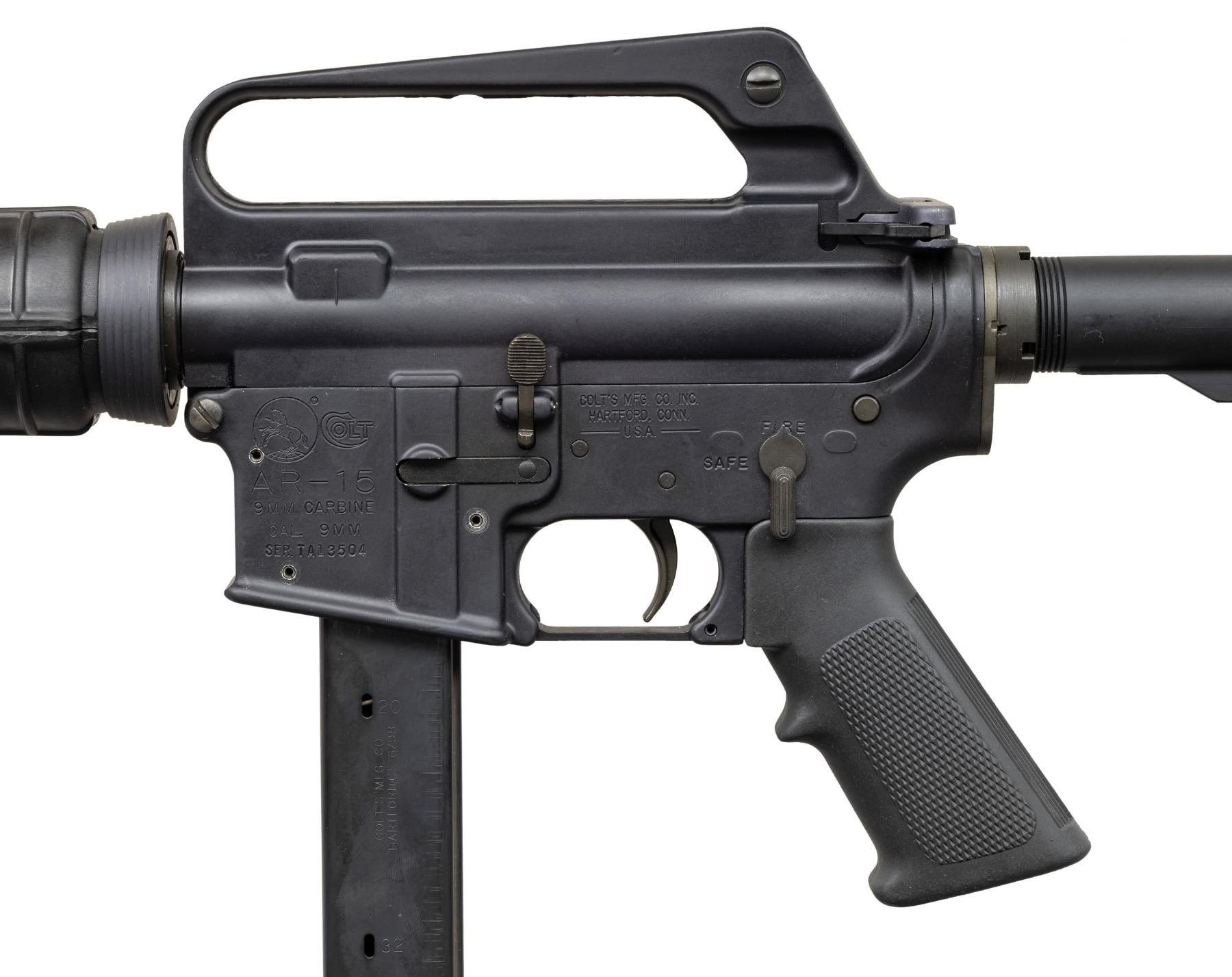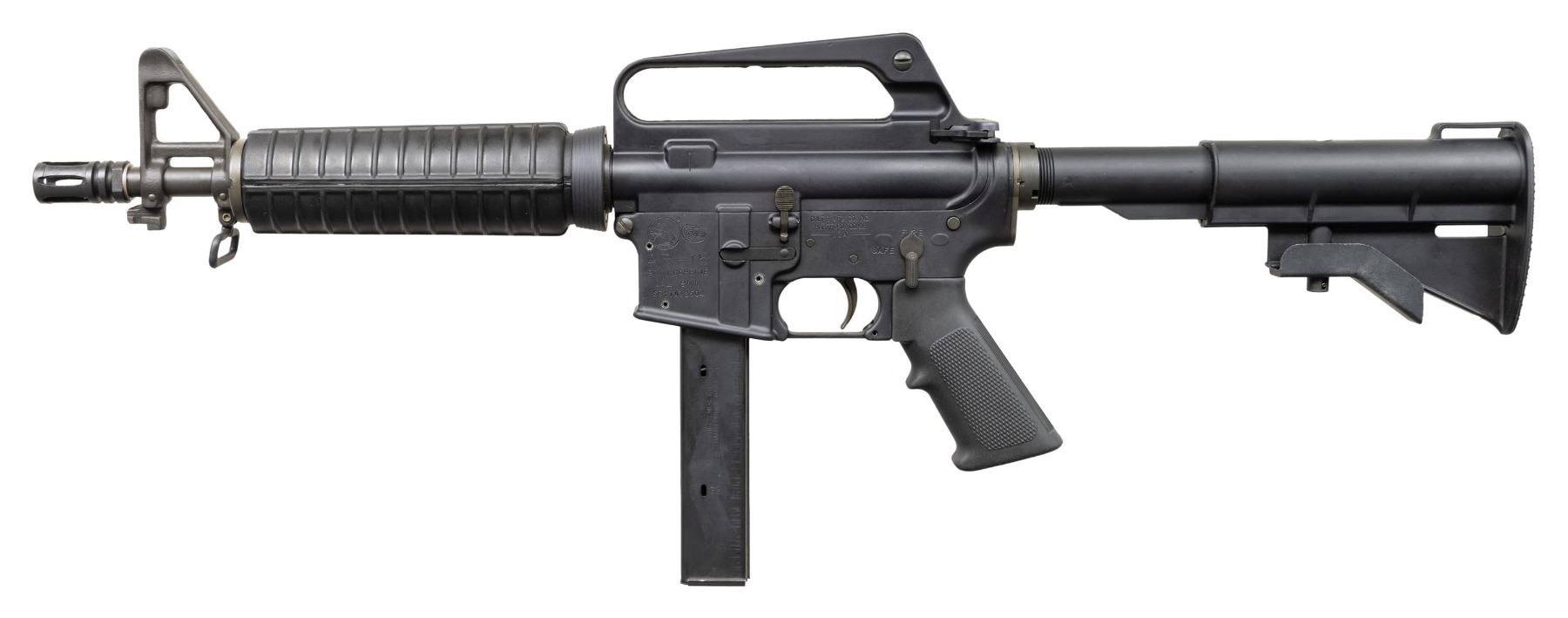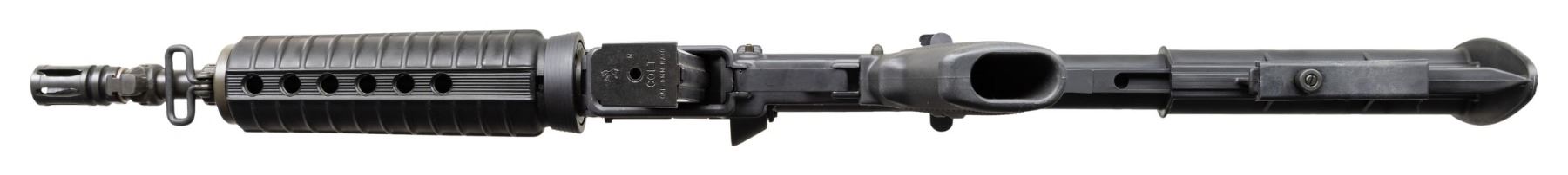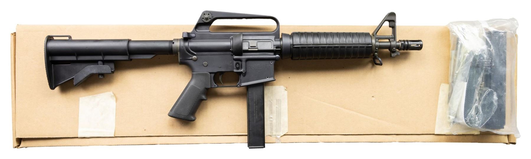 Cal.9mm Para S#TA13504. Bbl 12" over A2 birdcage flash hider. Fixed carry handle upper with fixed front sight with bayonet lug. Pinned 9mm magazine well adapter. Receiver manufactured by Colt Manufacturing CO Hartford Connecticut with Safe and fire selector positions. Carbine length ribbed polymer hand guard. Telescoping Stock. A2 Pistol Grip. MAGS: 2-32 Round. UNATTACHED ACCESSORIES: Manual, black web sling, cleaning rod, blue shipping plastic and unmarked box. CONDITION: all aspects like new. NATIONAL FIREARMS ACT SHORT BARRELED RIFLE REQUIRING BATF TRANSFER BEFORE TAKING POSSESSION. FULLY TRANSFERABLE PROVENANCE: Military Museum Collection of Shooters Outpost, Hooksett NH. (03-1952/ZAL/VK). MODERN. CLASS III. $1,000-1,500.