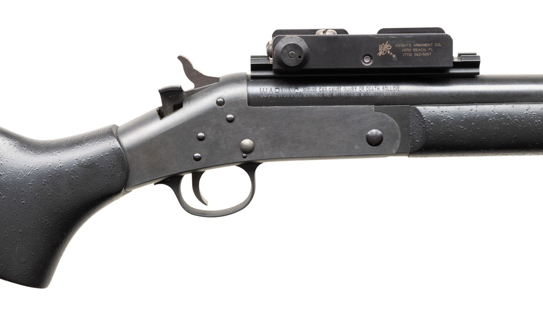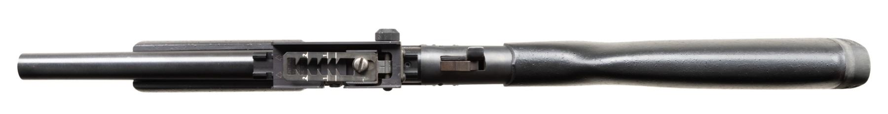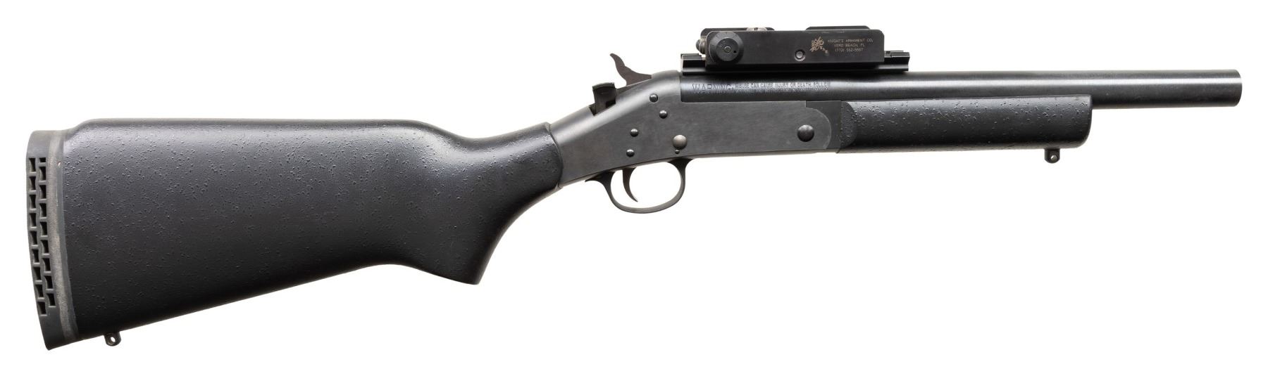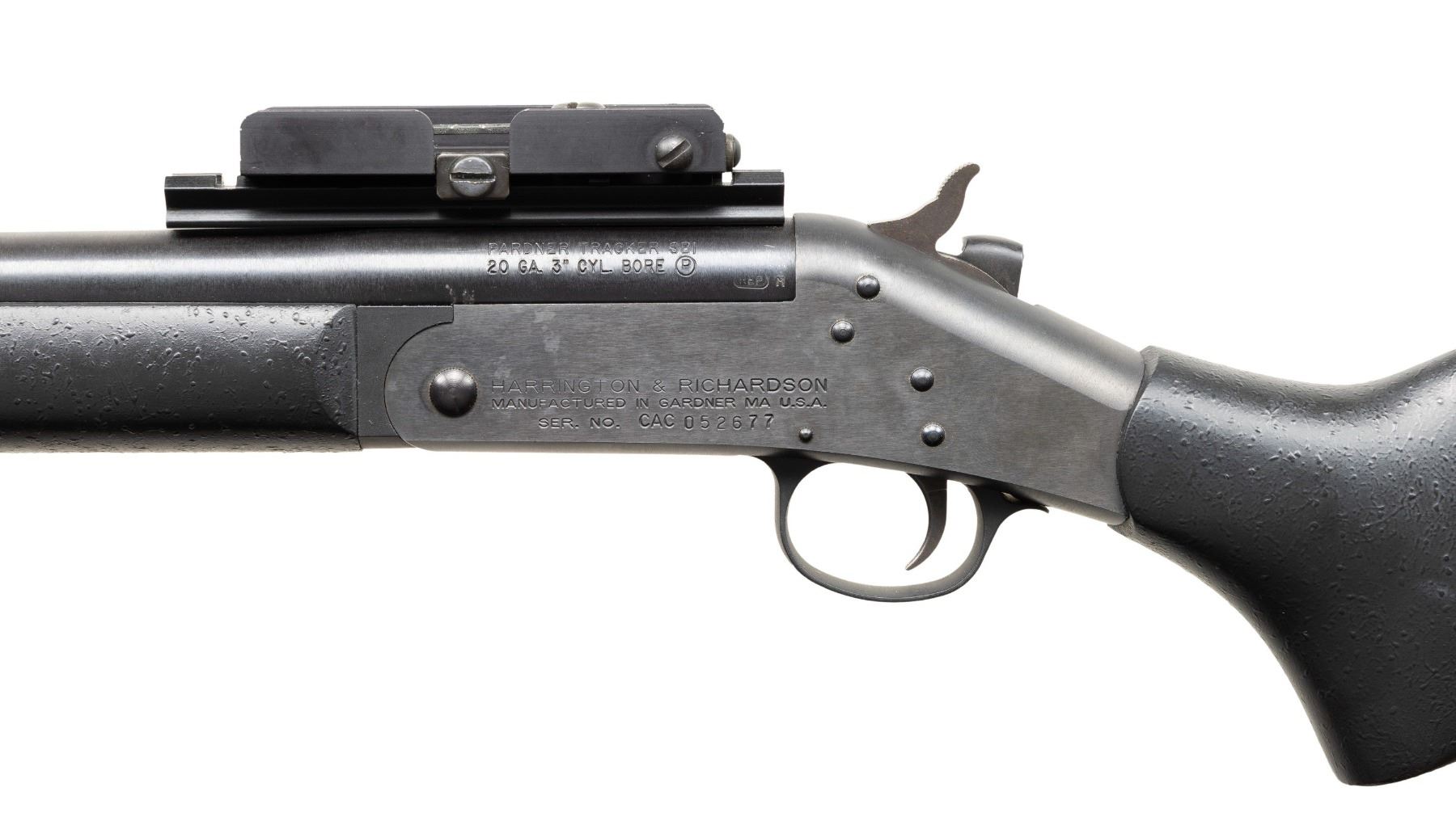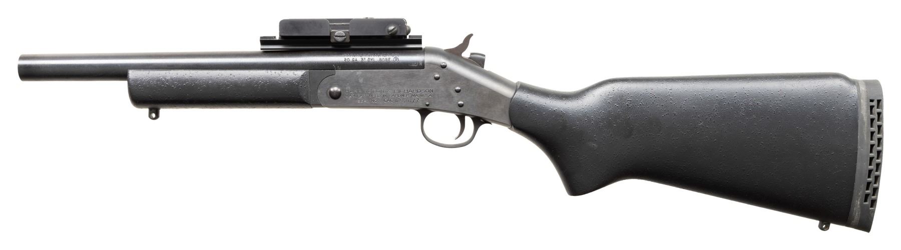Cal. 20 Ga 3". S#CAC052677. Bbl 12.5" Rifled slug barrel. ASI converted H&R Pardner Tracker SB1 to Short Barreled Shotgun. Knights Armament Grenade Launcher Sight Attached to barrel mounted rail. Matte finish. Black synthetic forearm and stock with vented recoil pad and sling studs. CONDITION: All Aspects are like new with light signs of firing. Bore has some light frosting. NATIONAL FIREARMS ACT MG REQUIRING BATF TRANSFER BEFORE TAKING POSSESSION. FULLY TRANSFERABLE. PROVENANCE: Military Museum Collection of Shooters Outpost, Hooksett NH. (03-1957/ZAL/VK). MODERN. CLASS III. $500-800.