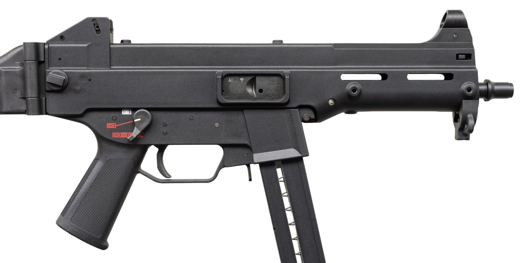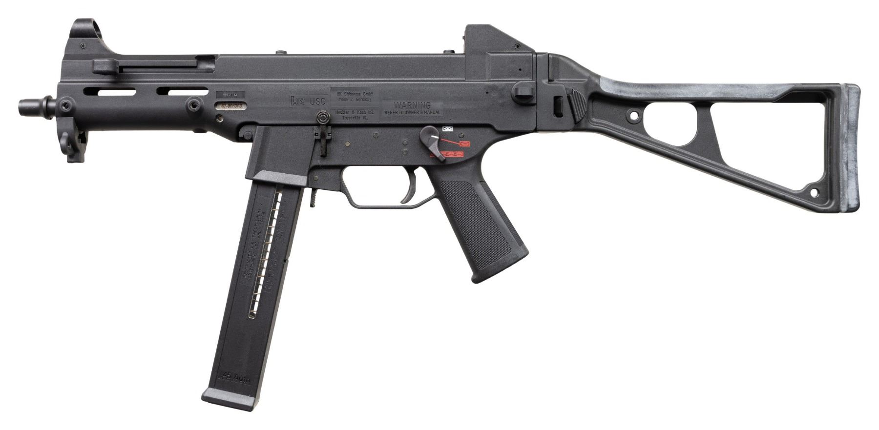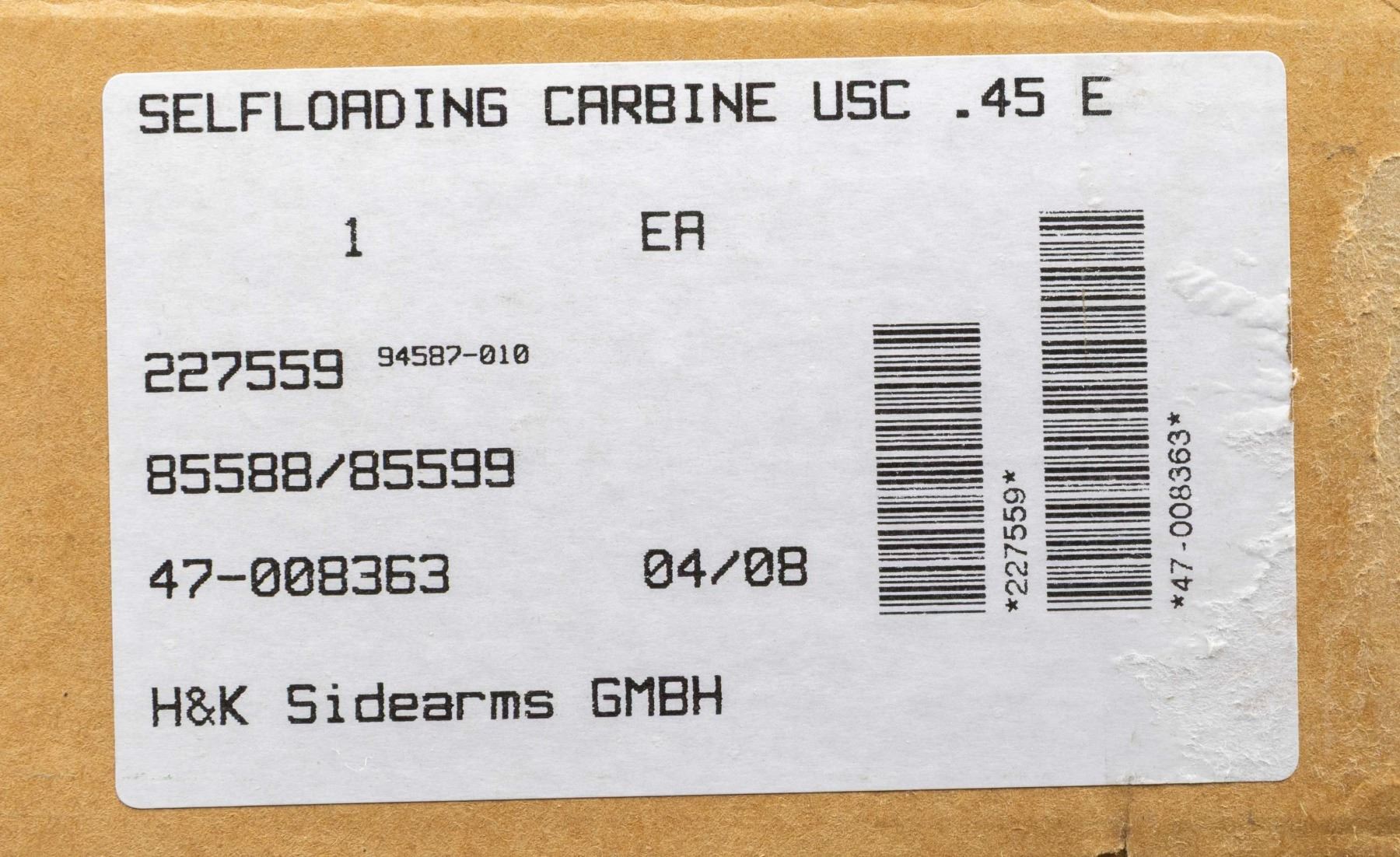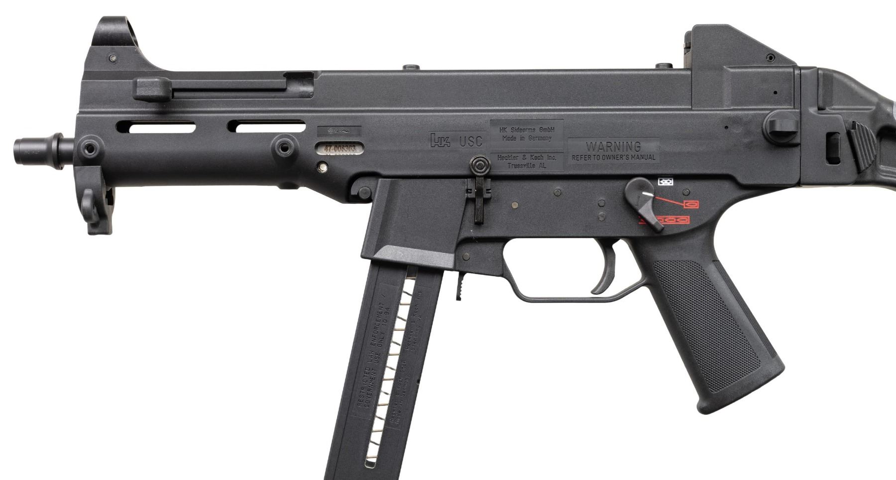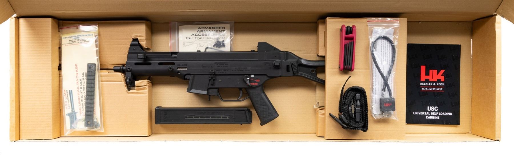 WITH ORIGINAL BOX. Cal 45 ACP. S#47-008363. Bbl 8". The H&K USC (Manufactured in 2000) (Universal Self Loading Carbine) is the civilian variant in semi auto only, rather than select fire, of the UMP (Universal Machine Pistol). This was heavily marketed as the "Next Generation" of SMG's, to replace the highly successful MP5 family. Available in both 9mm Parabellum & .45 ACP, this example belonging to the latter. Hooded blade front sight. Flip up dual aperture. Rear sight with protected ears. Black chassis with Ambidextrous three position selector (only functions in safe and semi). Left side bolt release. Paddle mag release. Folding stock. ASI converted USC SBR conversion noted on NFA paperwork as UMP model. MAGS: 1. UNATTACHED ACCESSORIES: original box, manual, tool and sling. CONDITION: All aspects like new, appears unfired. NATIONAL FIREARMS ACT SHORT BARRELED RIFLE. REQUIRING BATF TRANSFER BEFORE TAKING POSSESSION. FULLY TRANSFERABLE. PROVENANCE: Military Museum Collection of Shooters Outpost, Hooksett NH. (03-1967/ZAL/VK). MODERN. CLASS III. $2,000-2,500.