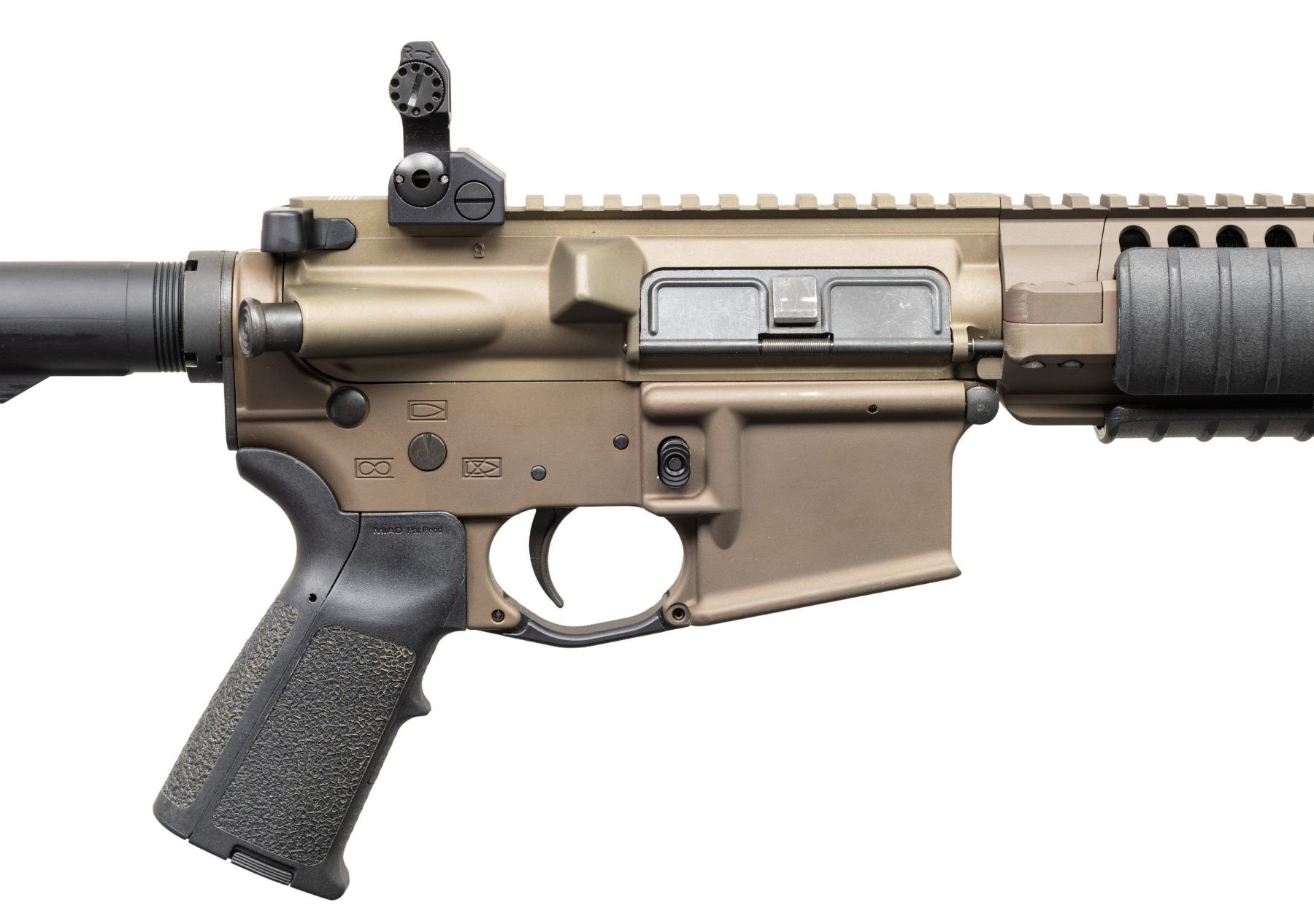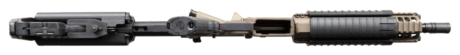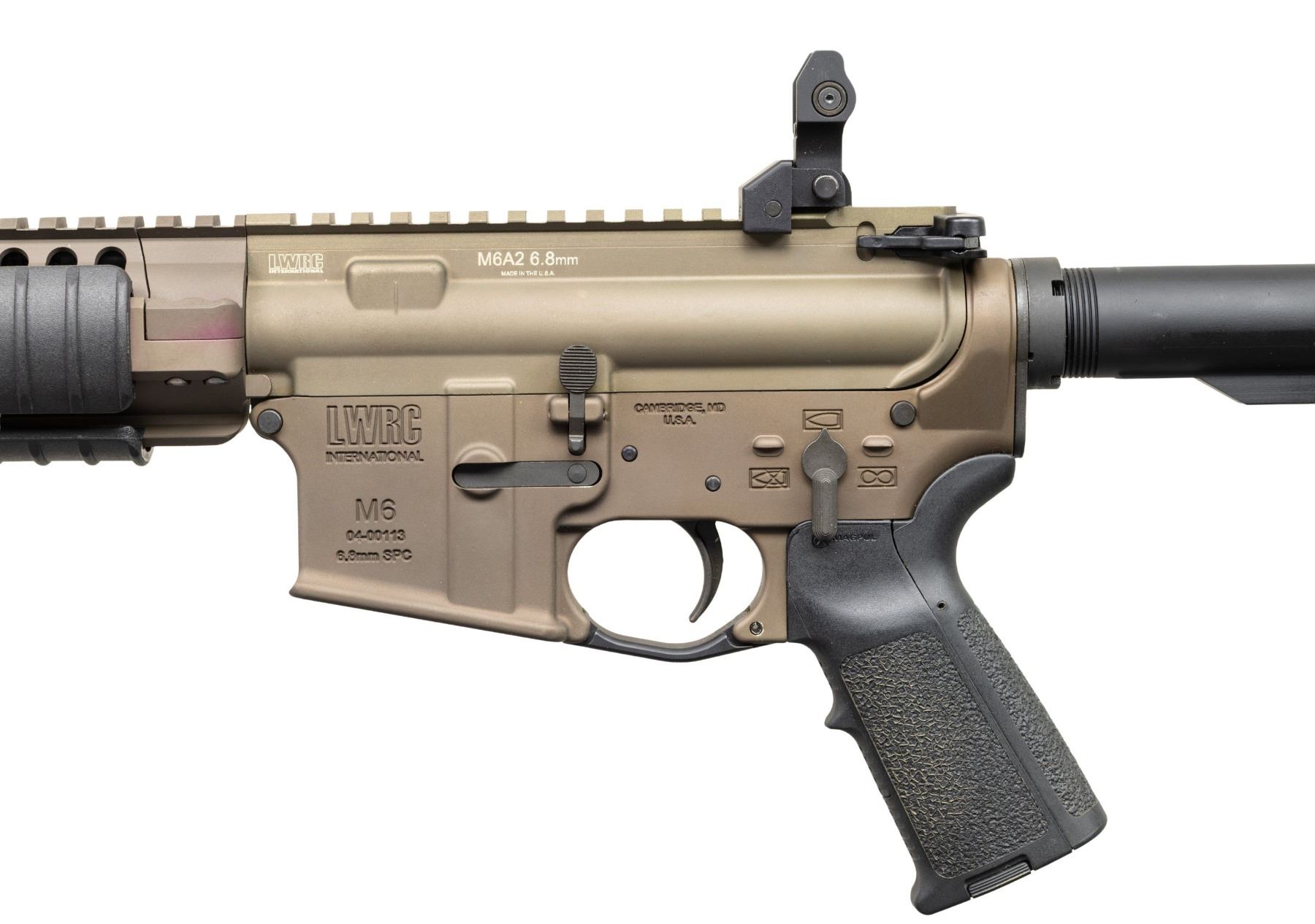 SEMI AUTO RIFLE. Cal.6.8mm SPC S#04-00113. Bbl 12" over bird cage flash hider. Flip up LWRC protected post front sight and flip up dual aperture protected rear sight. Quad rail forearm with protected covers. Flat dark Earth Finish. Veltor Telescopic stock. MagPul adjustable pistol grip. Right hand two position selector and bolt release. MAGS: 1- 30 Round. UNATTACHED ACCESSORIES: Original box, manual, grip adapters. CONDITION: all aspects like new, appears unfired. NATIONAL FIREARMS ACT SHORT BARRELED RIFLE REQUIRING BATF TRANSFER BEFORE TAKING POSSESSION. FULLY TRANSFERABLE. PROVENANCE: Military Museum Collection of Shooters Outpost, Hooksett NH. (03-1974/ZAL/VK). MODERN. CLASS III. $1,100-1,600.