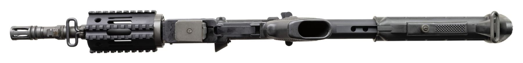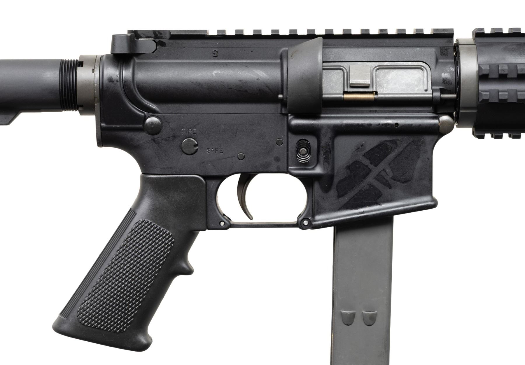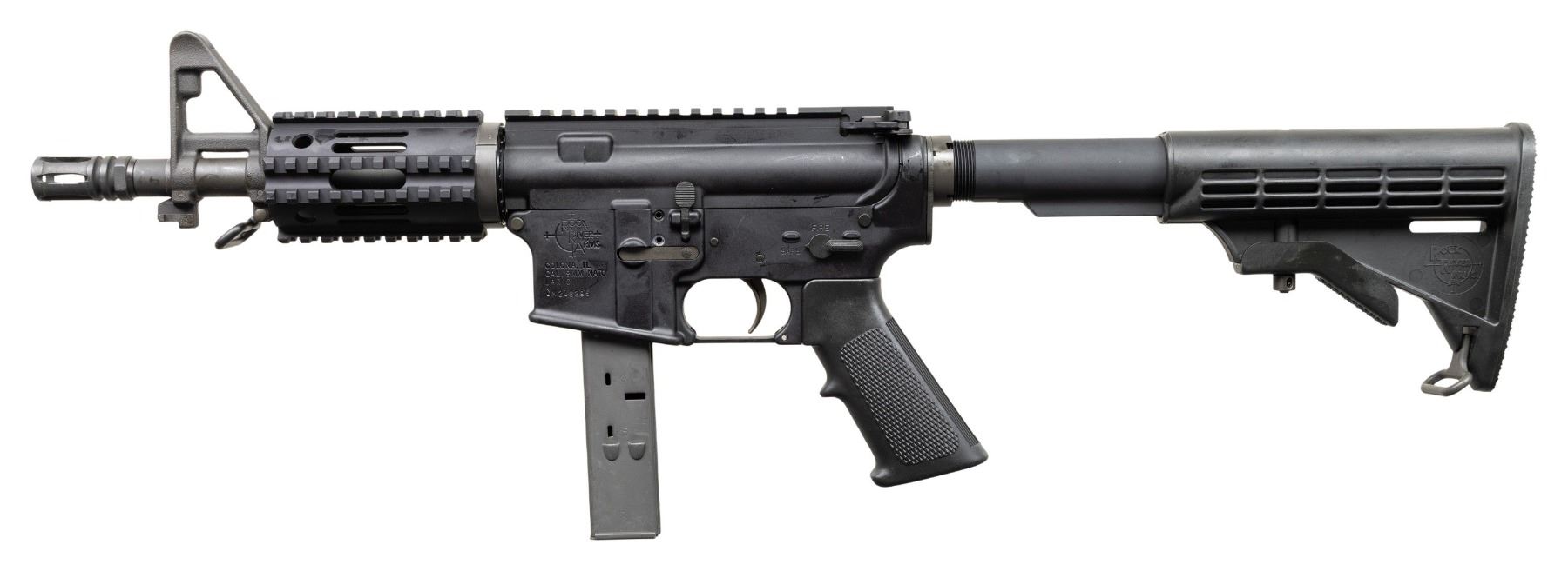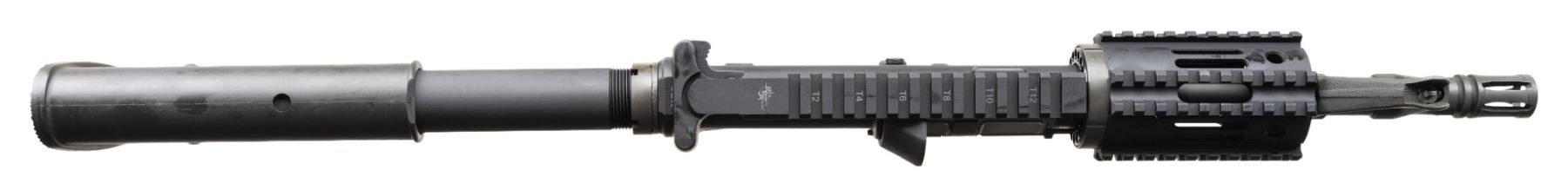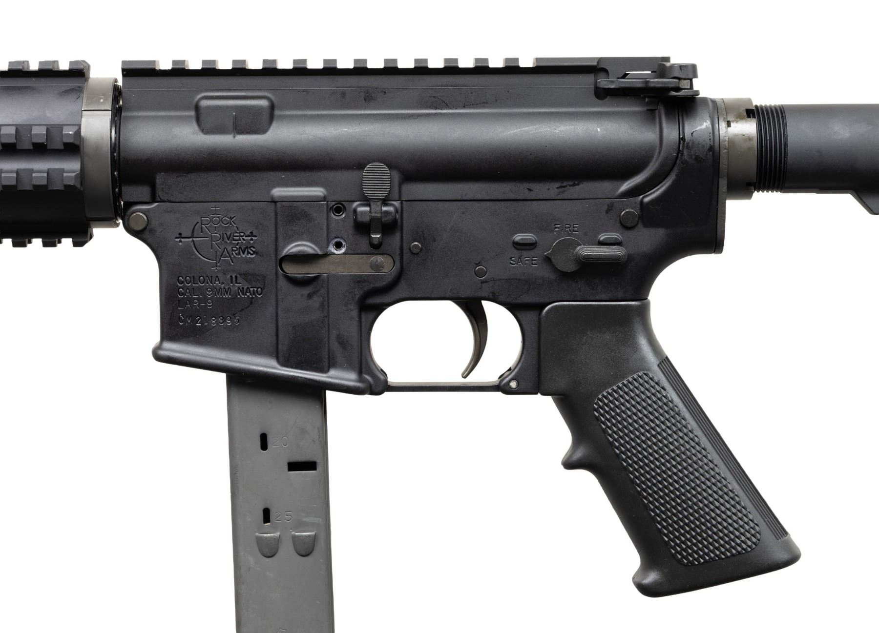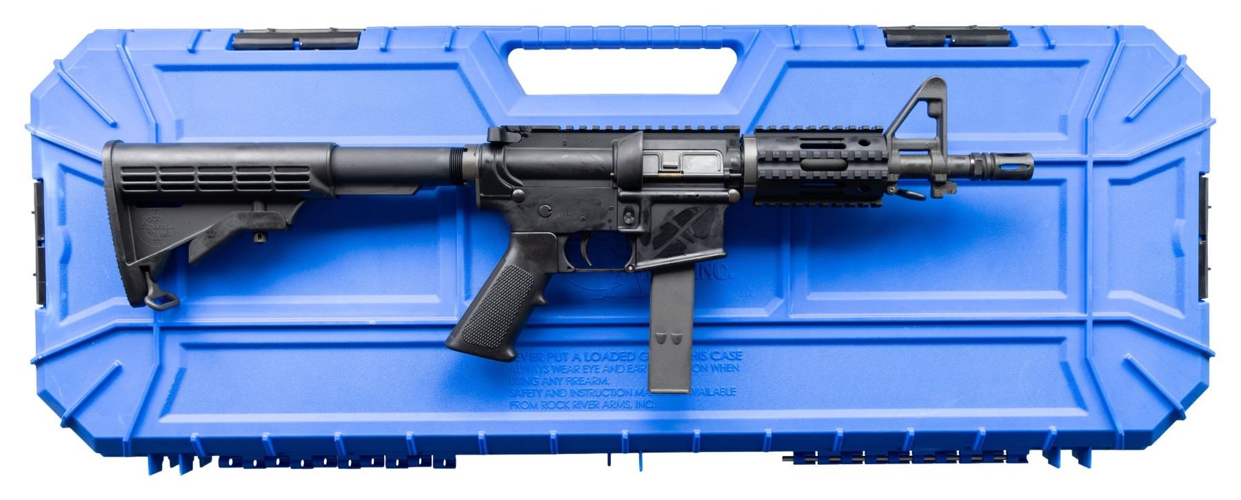 AUTO RIFLE. Cal 9mm Para. S#CM218395. Bbl 9" over A2 bird cage flash hider. Fixed post front sight with bayonet lug. Quad rail short aluminum hand guard. 9mm Colt SMG Compatible integral mag well. Fixed position telescopic stock. A2 Pistol Grip. MAGS: 1-25 Round. UNATTACHED ACCESSORIES: unmarked Rock River Arms blue plastic case. CONDITION: all aspects like new, appears unfired. NATIONAL FIREARMS ACT SHORT BARRELED RIFLE REQUIRING BATF TRANSFER BEFORE TAKING POSSESSION. FULLY TRANSFERABLE. PROVENANCE: Military Museum Collection of Shooters Outpost, Hooksett NH. (03-1982/ZAL/VK). MODERN. CLASS III. $800-1,200.