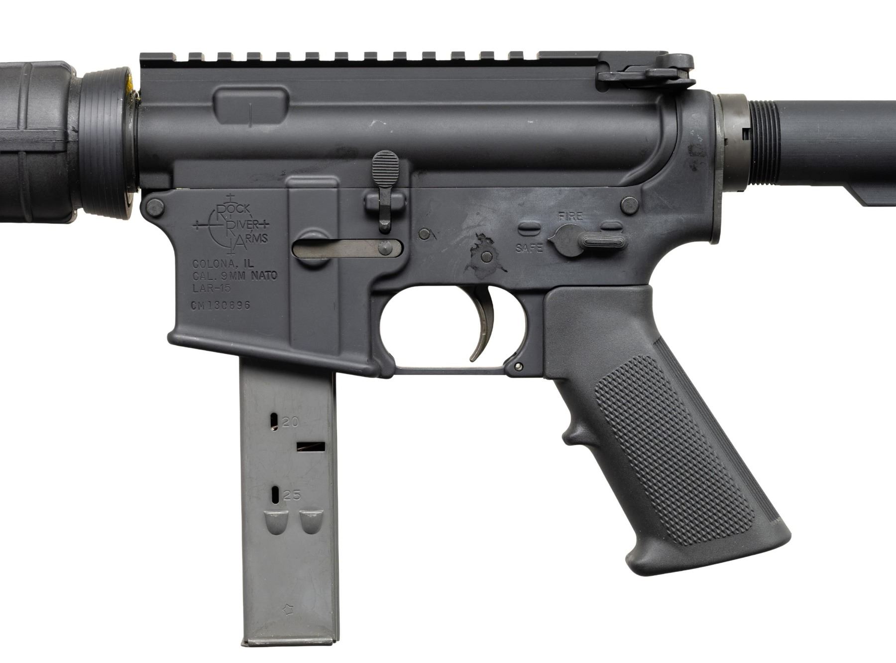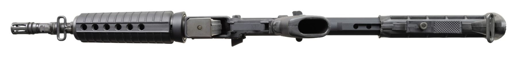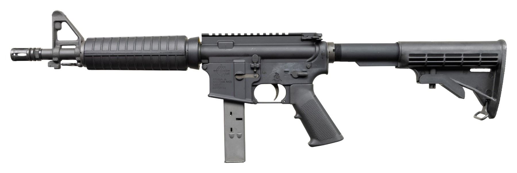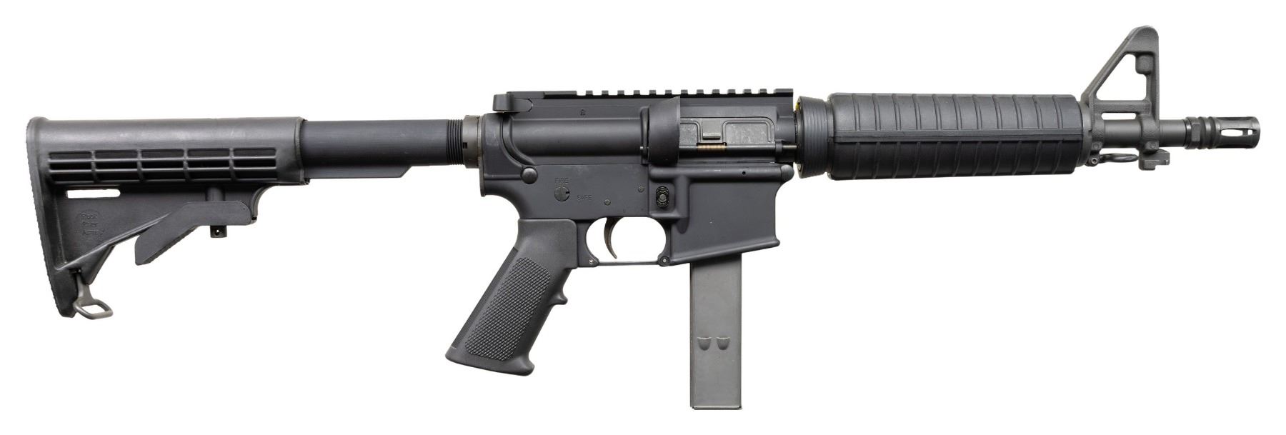 SEMI AUTO RIFLE WITH ORIGINAL BOX. Cal. 9mm Para. S#CM130896. Bbl is 12" over A2 bird cage flash hider. A2 style fixed front sight with bayonet lug. Carbine polymer hand guard. Factory 9mm adapter insert in mag well. 6 position telescopic stock. A2 hand guard. MAGS: 1-25 Round. UNATTACHED ACCESSORIES: Original box. CONDITION: All aspects like new, appears unfired. NATIONAL FIREARMS ACT SHORT BARRELED RIFLE REQUIRING BATF TRANSFER BEFORE TAKING POSSESSION. FULLY TRANSFERABLE. PROVENANCE: Military Museum Collection of Shooters Outpost, Hooksett NH. (03-1983/ZAL/VK). MODERN. CLASS III. $800-1,200.