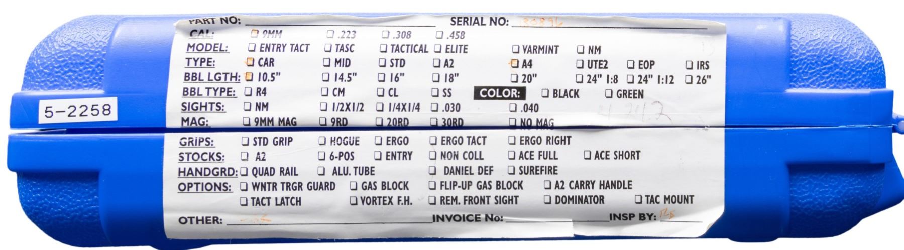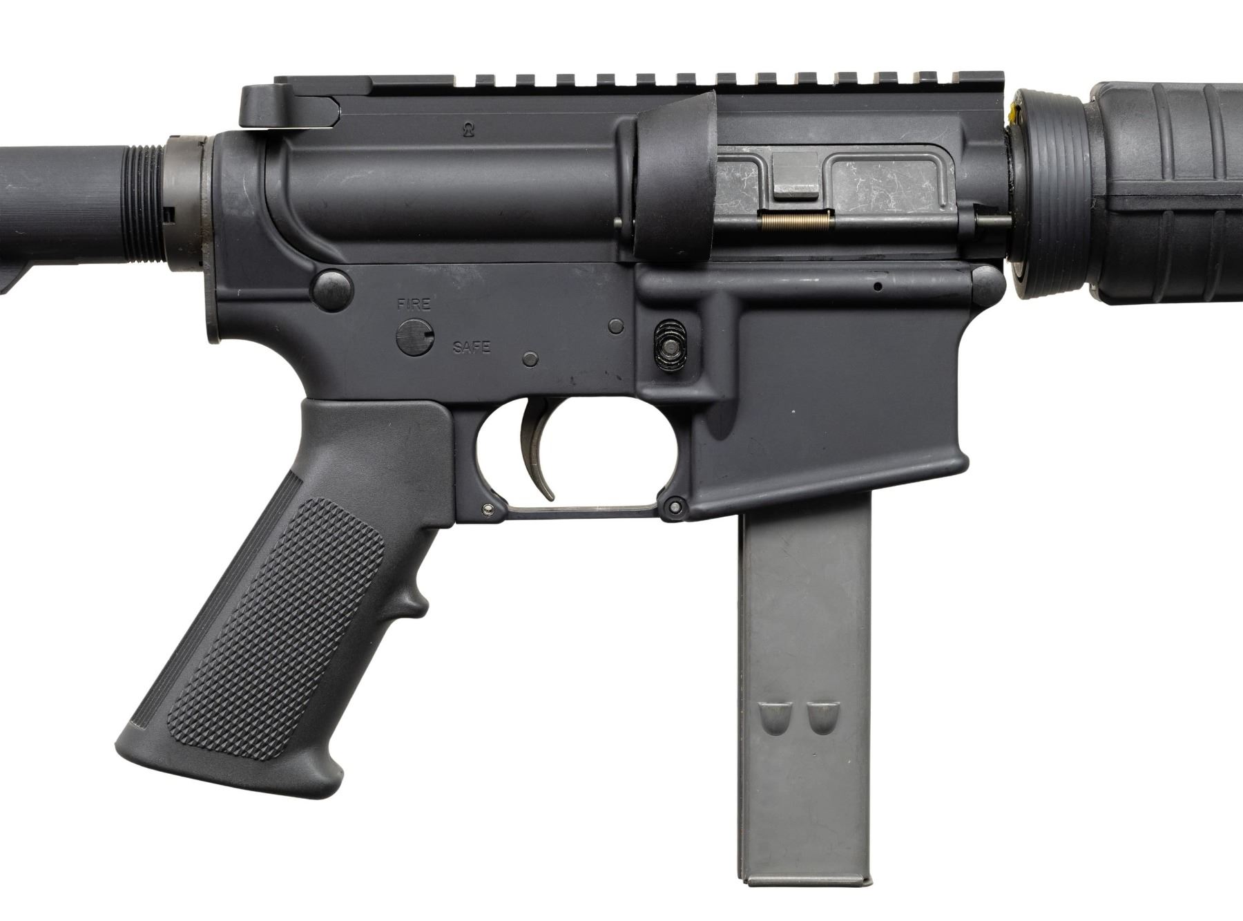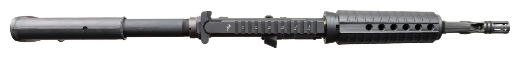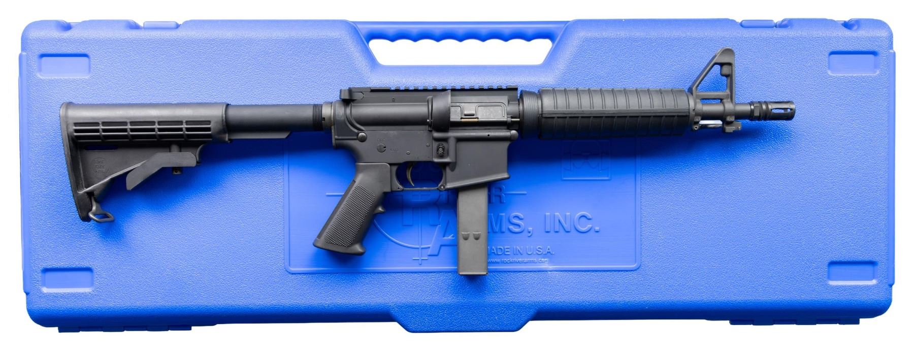 SEMI AUTO RIFLE WITH ORIGINAL BOX. Cal. 9mm Para. S#CM130896. Bbl is 12" over A2 bird cage flash hider. A2 style fixed front sight with bayonet lug. Carbine polymer hand guard. Factory 9mm adapter insert in mag well. 6 position telescopic stock. A2 hand guard. MAGS: 1-25 Round. UNATTACHED ACCESSORIES: Original box. CONDITION: All aspects like new, appears unfired. NATIONAL FIREARMS ACT SHORT BARRELED RIFLE REQUIRING BATF TRANSFER BEFORE TAKING POSSESSION. FULLY TRANSFERABLE. PROVENANCE: Military Museum Collection of Shooters Outpost, Hooksett NH. (03-1983/ZAL/VK). MODERN. CLASS III. $800-1,200.