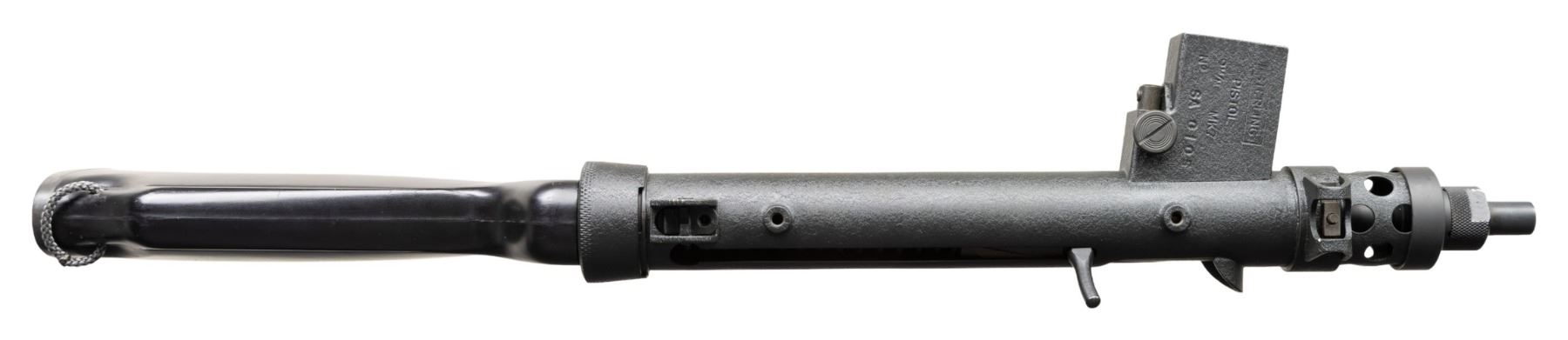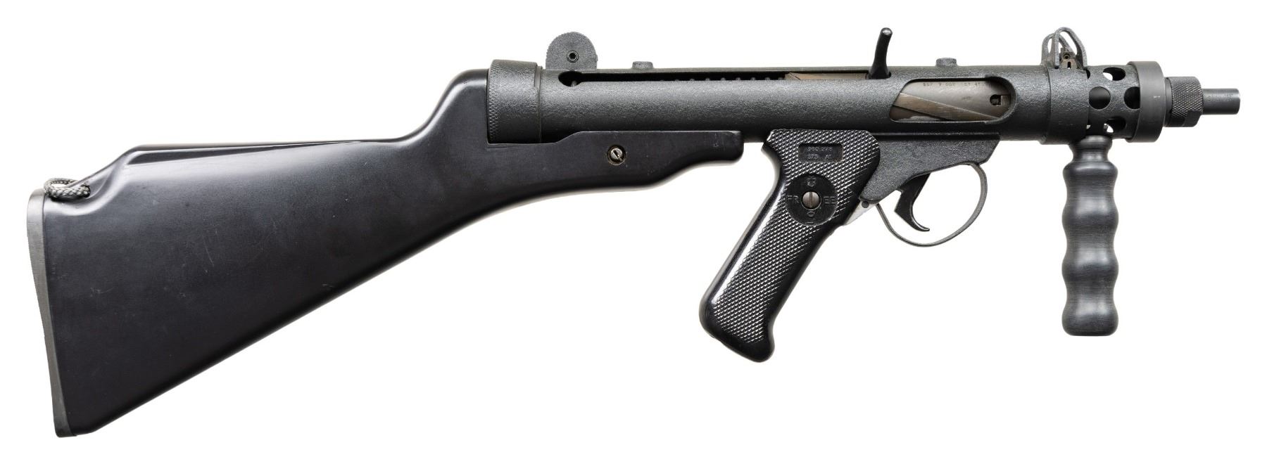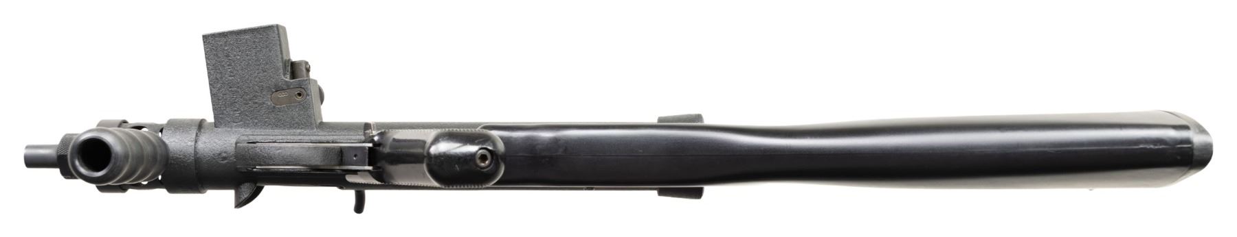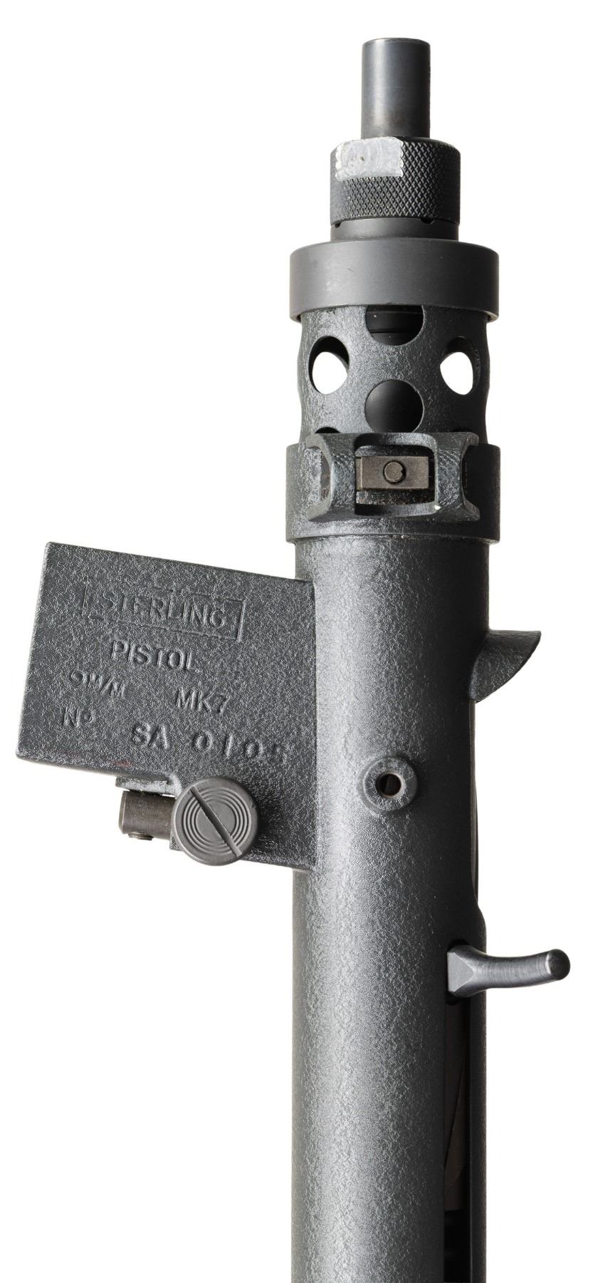 RIFLE. Cal.9mm Para. S#SA0105. Bbl 4 1/2". Post front sight with protected ears. Dual aperture flip rear sight with protected ears. Right handed three position selector (only capable of safe and semi). Black synthetic stock, fore grip and checkered pistol grip. Mag well marked "Sterling/Pistol/ 9mm MK7". UNATTACHED ACCESSORIES: 1 MAG, VHS manual and web sling. CONDITION: like new, original textured black finish with a few mild handling marks. Bright shiny bore with nice rifling. NATIONAL FIREARMS ACT SHORT BARRELED RIFLE. REQUIRING BATF TRANSFER BEFORE TAKING POSSESSION. FULLY TRANSFERABLE. PROVENANCE: Military Museum Collection of Shooters Outpost, Hooksett NH. (03-1961/ZAL/VK). MODERN. CLASS III. $800-1,200.
