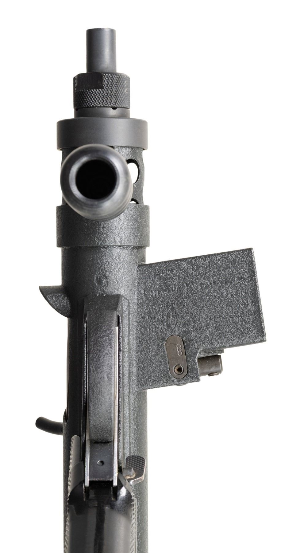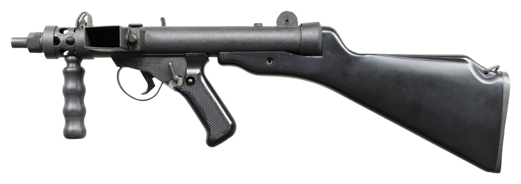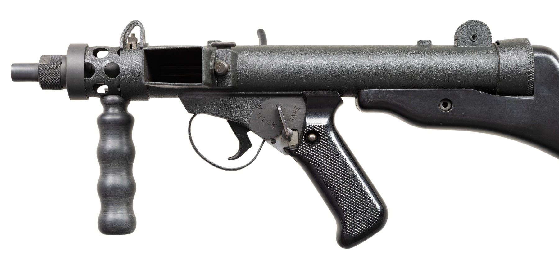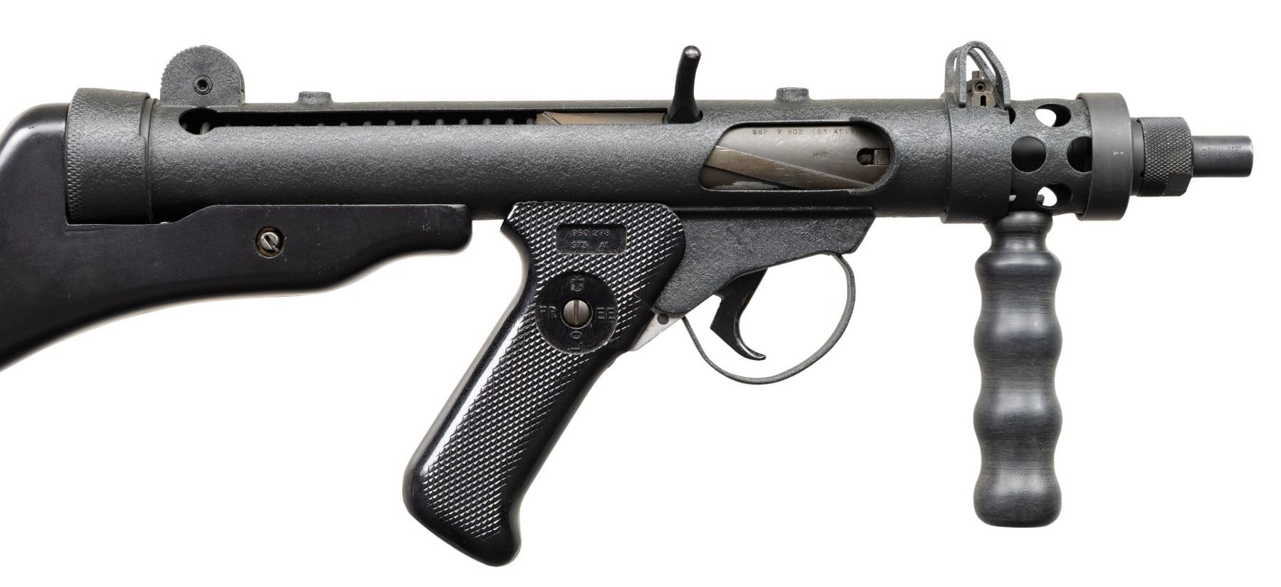 RIFLE. Cal.9mm Para. S#SA0105. Bbl 4 1/2". Post front sight with protected ears. Dual aperture flip rear sight with protected ears. Right handed three position selector (only capable of safe and semi). Black synthetic stock, fore grip and checkered pistol grip. Mag well marked "Sterling/Pistol/ 9mm MK7". UNATTACHED ACCESSORIES: 1 MAG, VHS manual and web sling. CONDITION: like new, original textured black finish with a few mild handling marks. Bright shiny bore with nice rifling. NATIONAL FIREARMS ACT SHORT BARRELED RIFLE. REQUIRING BATF TRANSFER BEFORE TAKING POSSESSION. FULLY TRANSFERABLE. PROVENANCE: Military Museum Collection of Shooters Outpost, Hooksett NH. (03-1961/ZAL/VK). MODERN. CLASS III. $800-1,200.