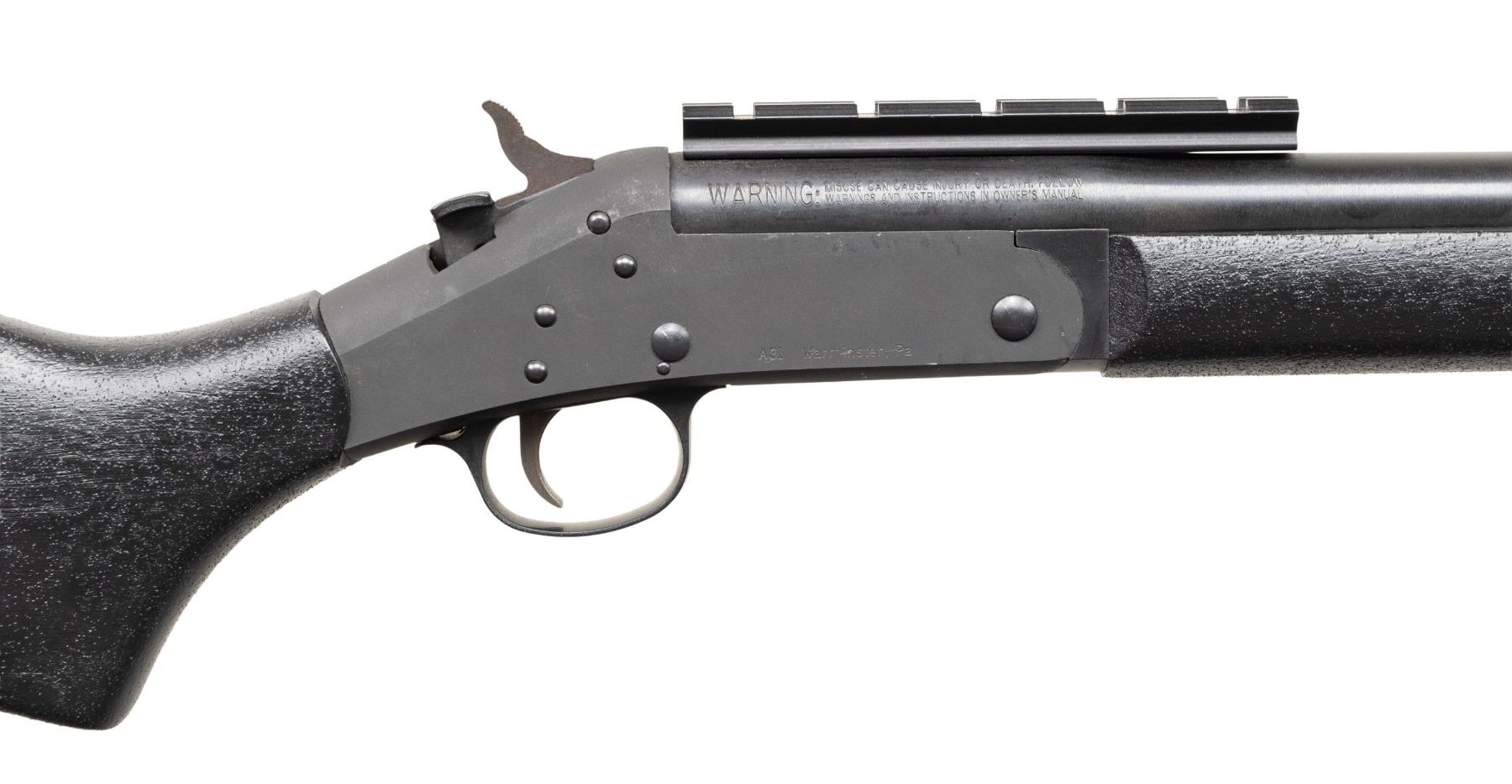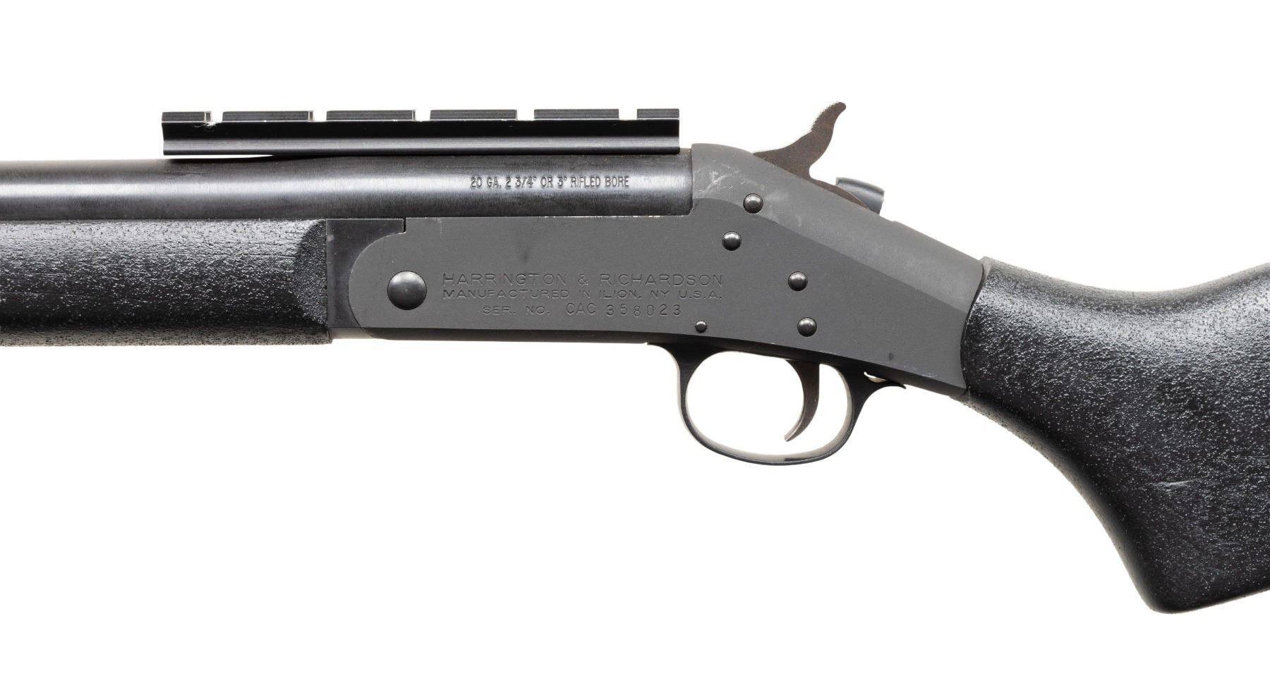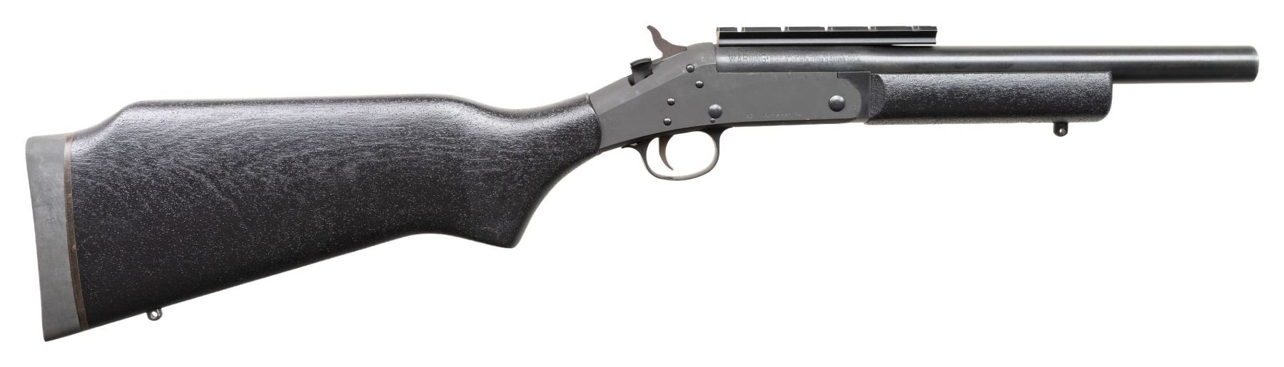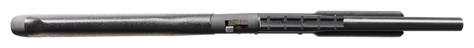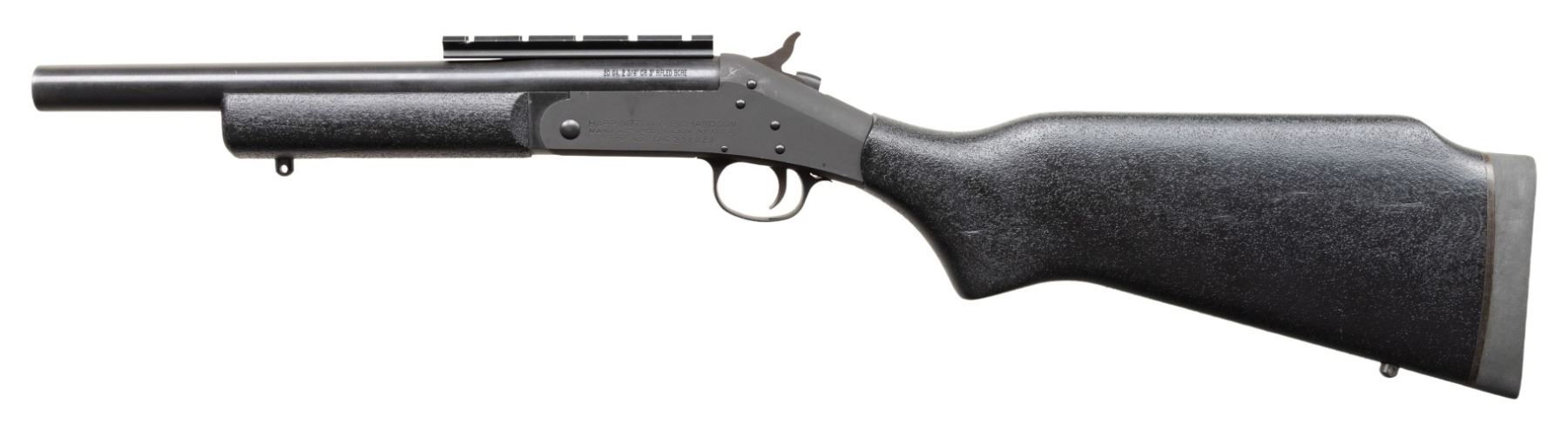 Cal 20 ga. S#.CAC358023. Bbl 12 1/2" Rifled slug with rail. ASI converted H&R SB1 to Short Barreled Shotgun. Black textured composite stock with H& R recoil pad & sling studs. CONDITION: all aspects like new,shows sign of light firing. Bright shiny bore with nice rifling. NATIONAL FIREARMS ACT SHORT BARRELED SHOTGUN REQUIRING BATF TRANSFER BEFORE TAKING POSSESSION. FULLY TRANSFERABLE. PROVENANCE: Military Museum Collection of Shooters Outpost, Hooksett NH. (03-1978/ZAL/VK). MODERN. CLASS III. $800-1,200.