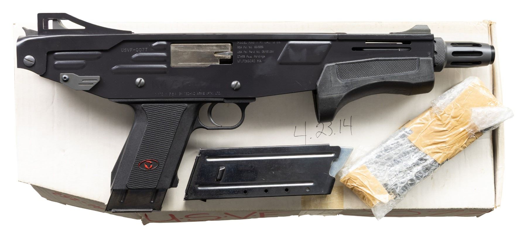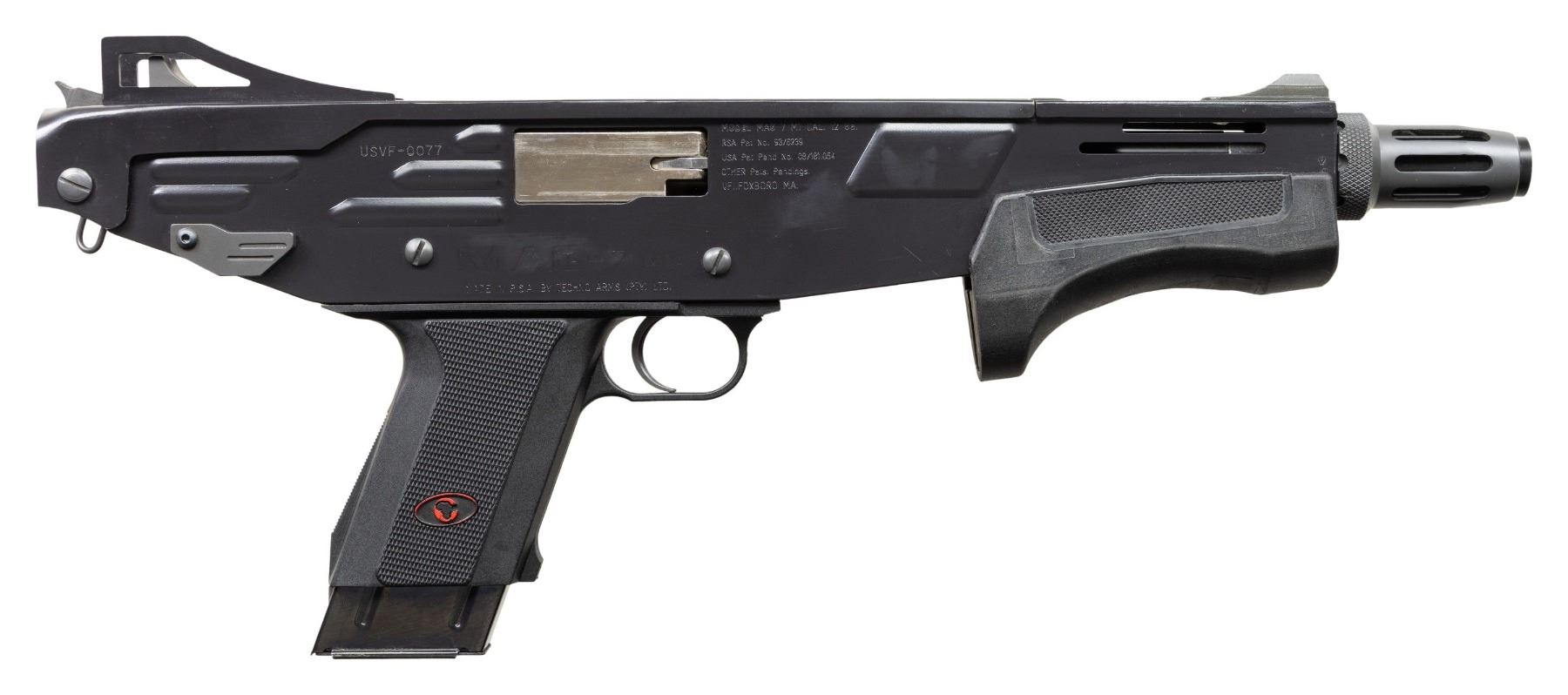 SLIDE ACTION SHOTGUN WITH ORIGINAL BOX. Cal. 12 Ga. S# USVF-0077. Bbl 11" over bird cage flash hider. An interesting, South African designed slide action shotgun made for close quarters combat. It was built to utilize a unique 12-gauge x 60mm (2.36-inch) shotgun shell. It will not function w/ common 2.75" shells. Raised ramp blade front sight with protected fixed v-notch rear sight. Swing swivel is located on left side of frame. Right handed selector and mag release. Checkered hard plastic forearm and lower. MAGS: 2 -5 rd.. UNATTACHED ACCESSORIES: Original box, manual . CONDITION: Overall very fine with only mild cycling wear and a few minor handling marks. Bright shiny bore. NATIONAL FIREARMS ACT SHORT BARRELED SHOTGUN REQUIRING BATF TRANSFER BEFORE TAKING POSSESSION. FULLY TRANSFERABLE. PROVENANCE: Military Museum Collection of Shooters Outpost, Hooksett NH. (03-1959/ZAL/VK). MODERN. CLASS III. $1,500-2,500.