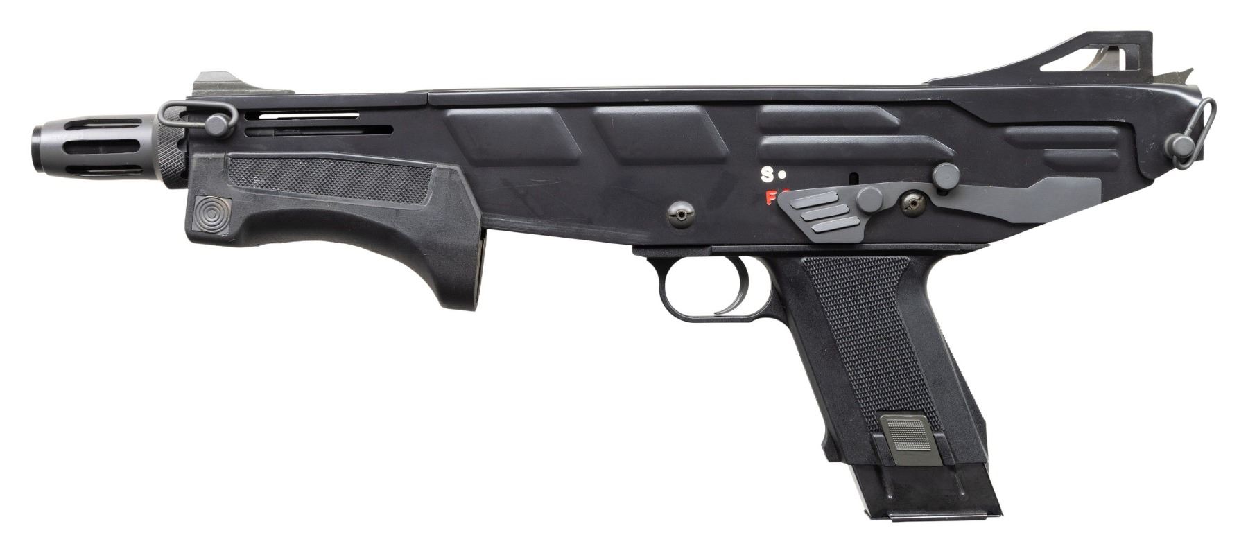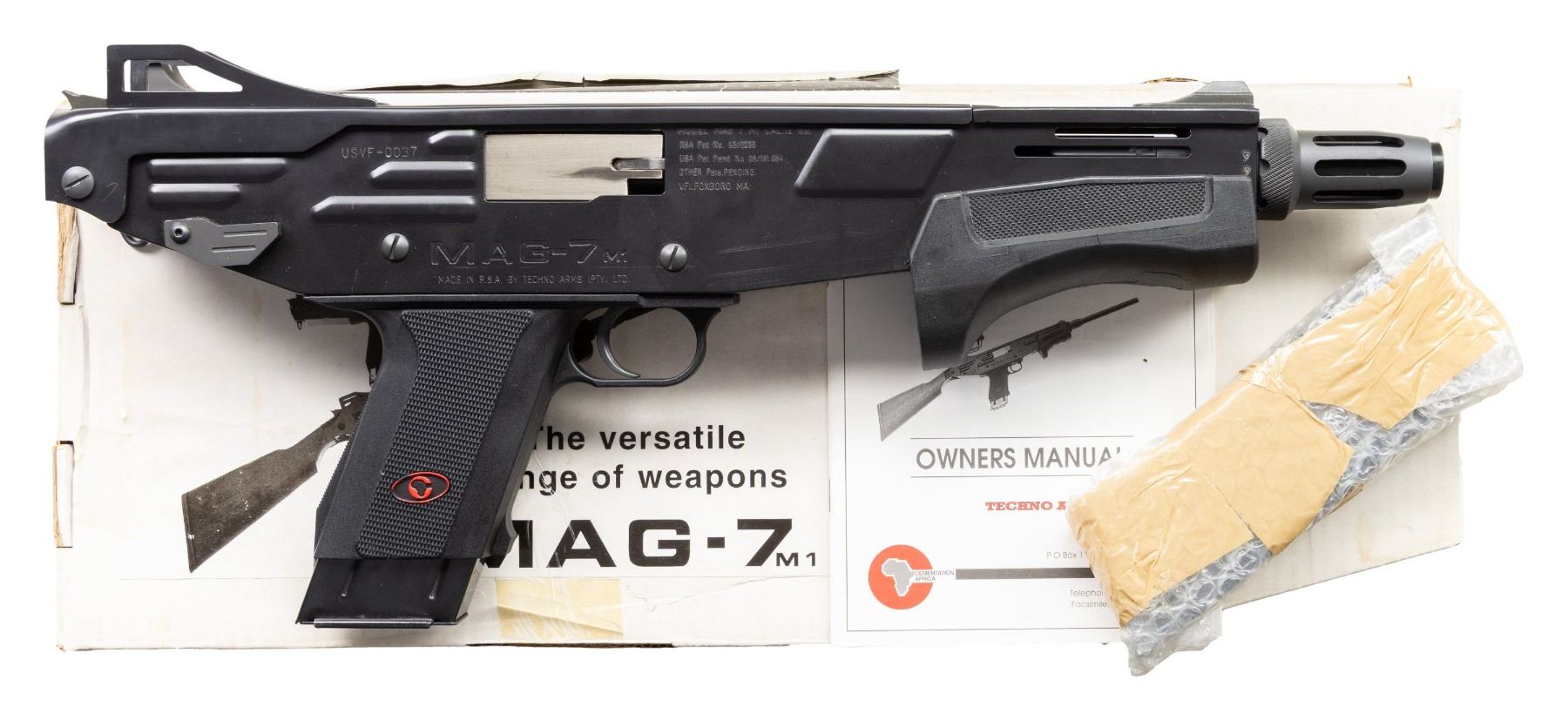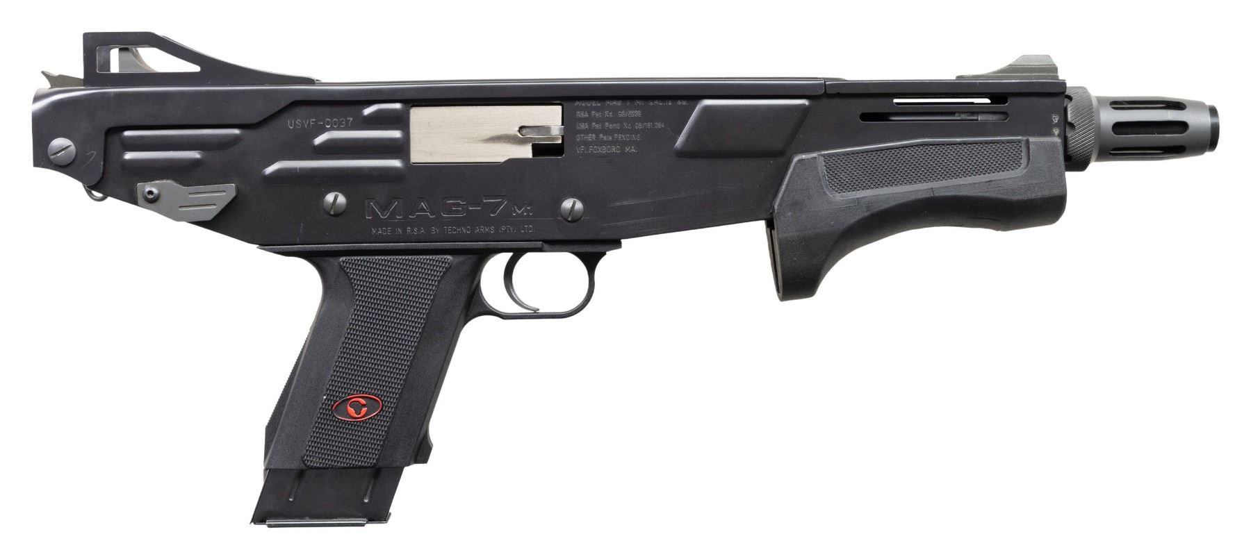 SLIDE ACTION SHOTGUN WITH ORIGINAL BOX. Cal. 12 Ga. S# USVF-0037. Bbl is 11" over flash suppressor. An interesting, South African designed slide action shotgun made for close quarters combat. It was built to utilize a unique 12-gauge x 60mm (2.36-inch) shotgun shell. It will not function w/ common 2.75" shells. Bladed ramp front sight. Fixed protected v-notch rear sight. Swing swivel is located on left hand side of frame. Right handed mag release and safety. Checkered hard plastic forearm and lower. MAGS: 1 - 5rd. UNATTACHED ACCESSORIES: original box and manual. CONDITION: very fine with only mild signs of cycling wear and scattered handling marks. Bright shiny bore. NATIONAL FIREARMS ACT SHORT BARRELED SHOTGUN REQUIRING BATF TRANSFER BEFORE TAKING POSSESSION. FULLY TRANSFERABLE. PROVENANCE: Military Museum Collection of Shooters Outpost, Hooksett NH. (03-1960/ZAL/VK). MODERN. CLASS III. $1,500-2,500.