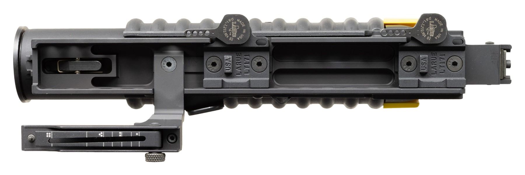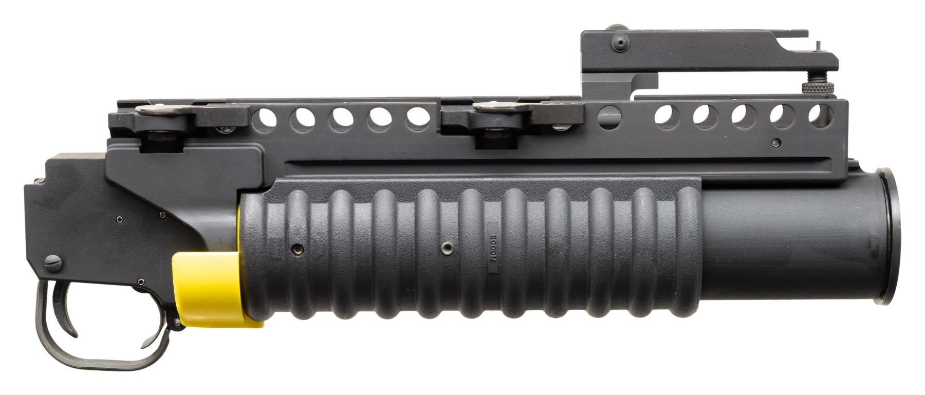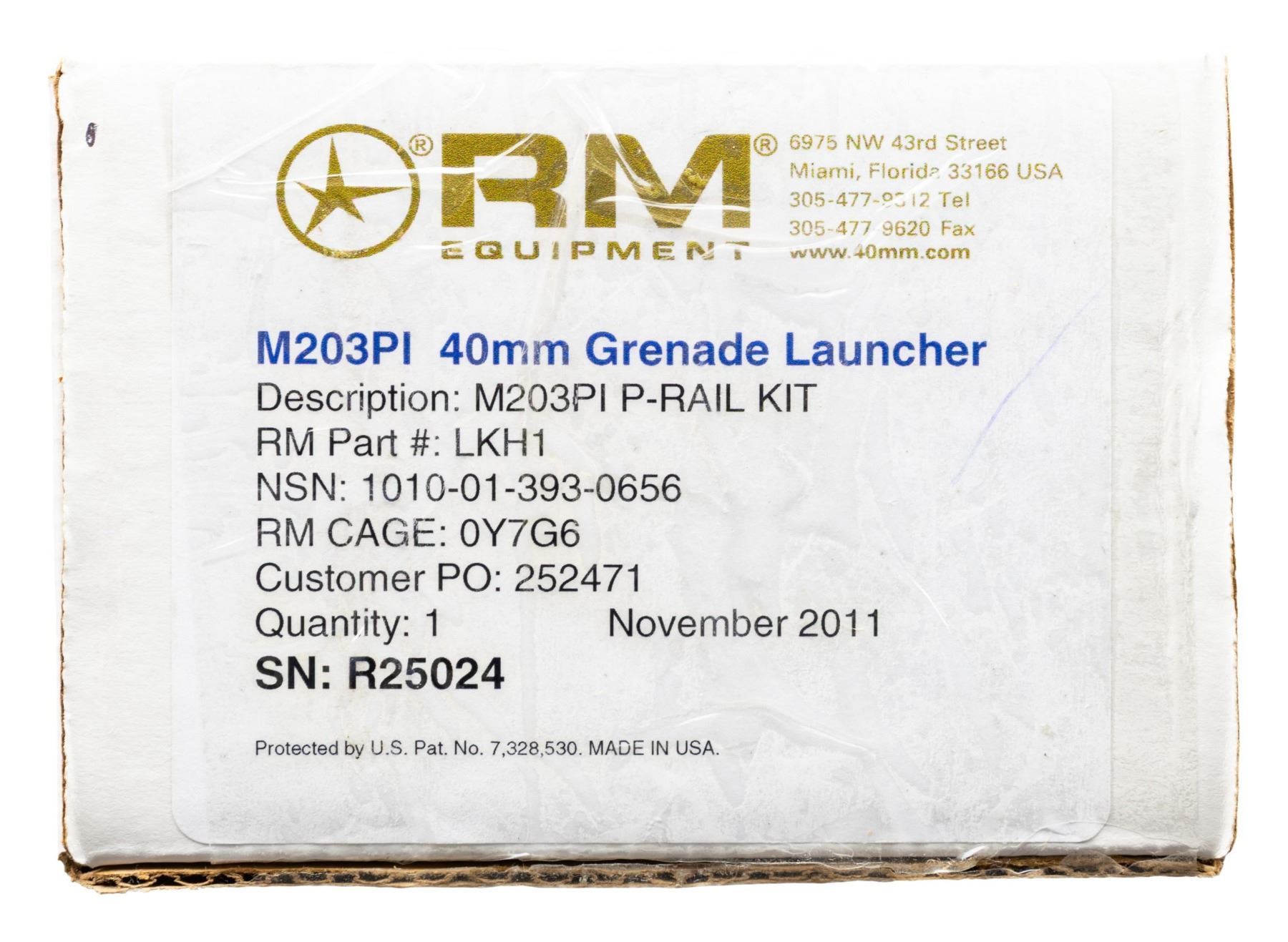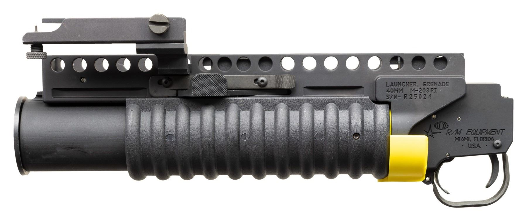 Cal 40mm. S#R25024. RM Equipment was founded in the early 1970s and specializes in the M-203 PI (Product Improved) Grenade Launcher. While the M-203 is well known and widely used, the M-203PI offers enhanced mounting for numerous rifles as well as stand alone capability. They have received numerous federal contract awards going back over 20 years. These interesting grenade launchers are set up with Larue quick detach p-rail mounts and a flip up launcher sight graduated to 400 meters. UNATTACHED ACCESSORIES: original box and manual. CONDITION: as new, unfired. PROVENANCE: Military Museum Collection of Shooters Outpost, Hooksett NH. NATIONAL FIREARMS ACT DESTRUCTIVE DEVICE REQUIRING BATF TRANSFER BEFORE TAKING POSSESSION. FULLY TRANSFERABLE. (03-1996/ZAL). MODERN. CLASS III. $2,500-3,500.
