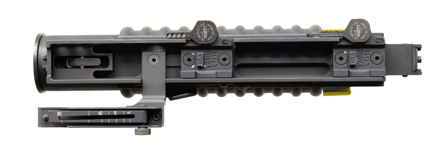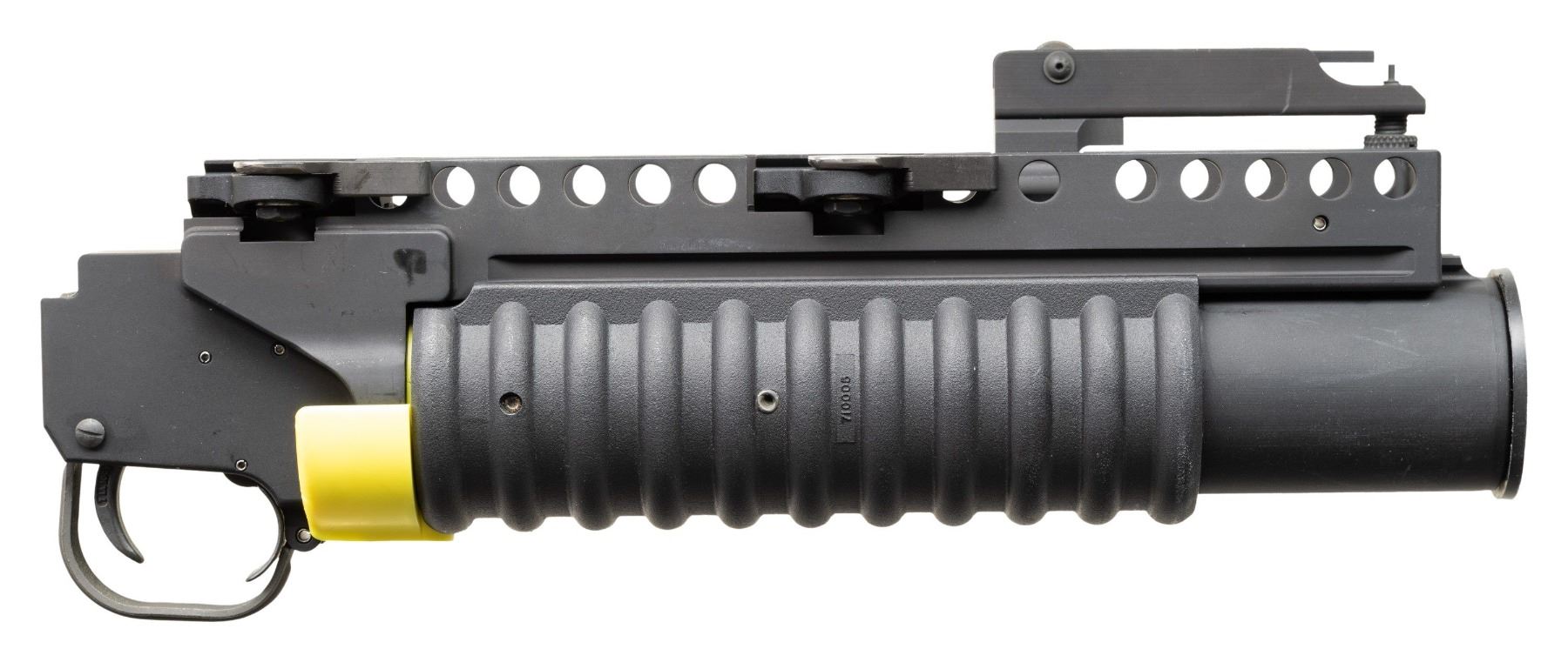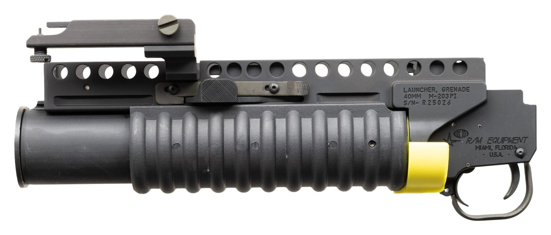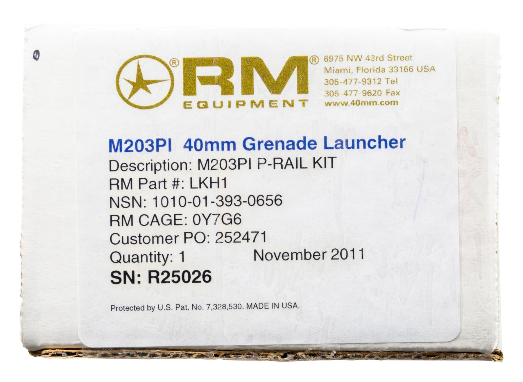 Cal 40mm. S#R25026. RM Equipment was founded in the early 1970s and specializes in the M-203 PI (Product Improved) Grenade Launcher. While the M-203 is well known and widely used, the M-203PI offers enhanced mounting for numerous rifles as well as stand alone capability. They have received numerous federal contract awards going back over 20 years. These interesting grenade launchers are set up with Larue quick detach p-rail mounts and a flip up launcher sight graduated to 400 meters. UNATTACHED ACCESSORIES: original box and manual. CONDITION: as new, unfired. PROVENANCE: Military Museum Collection of Shooters Outpost, Hooksett NH.NATIONAL FIREARMS ACT DESTRUCTIVE DEVICE REQUIRING BATF TRANSFER BEFORE TAKING POSSESSION. FULLY TRANSFERABLE. (03-1998/ZAL). MODERN. CLASS III. $2,500-3,500.