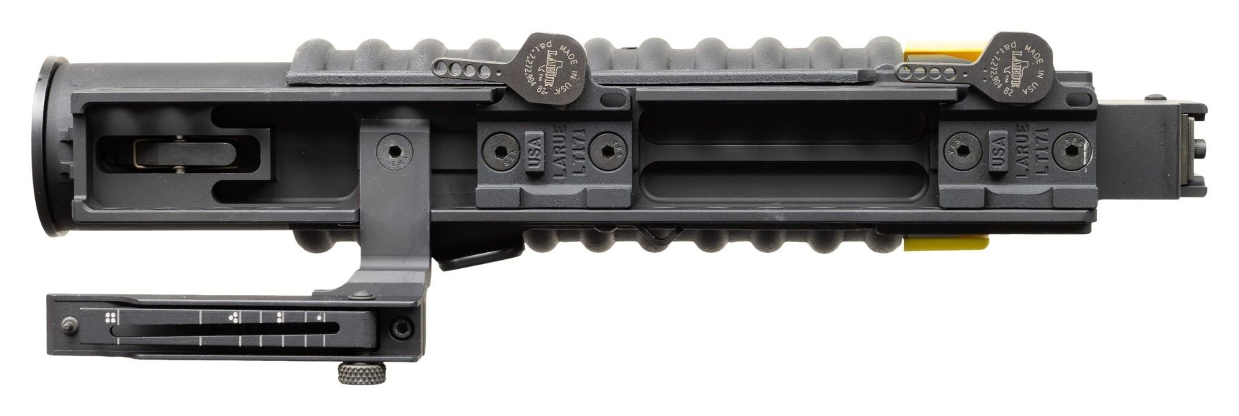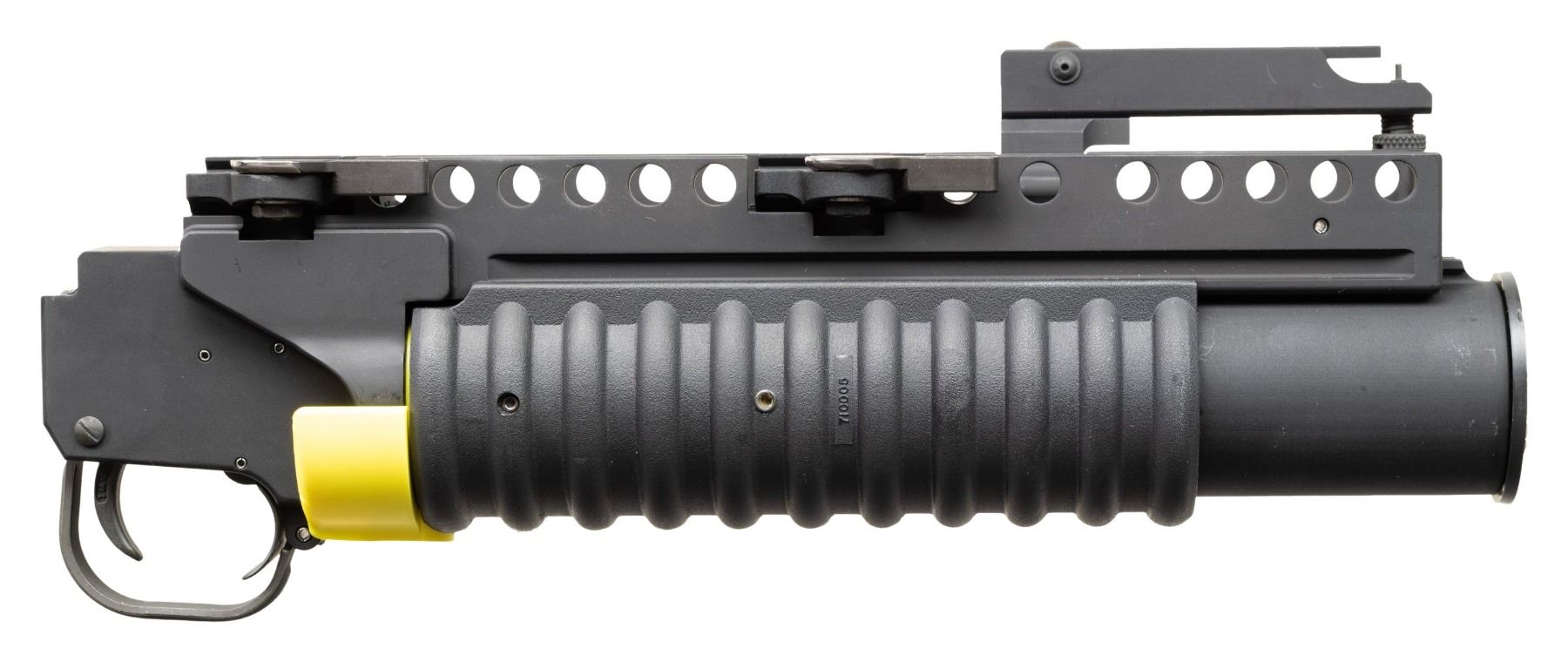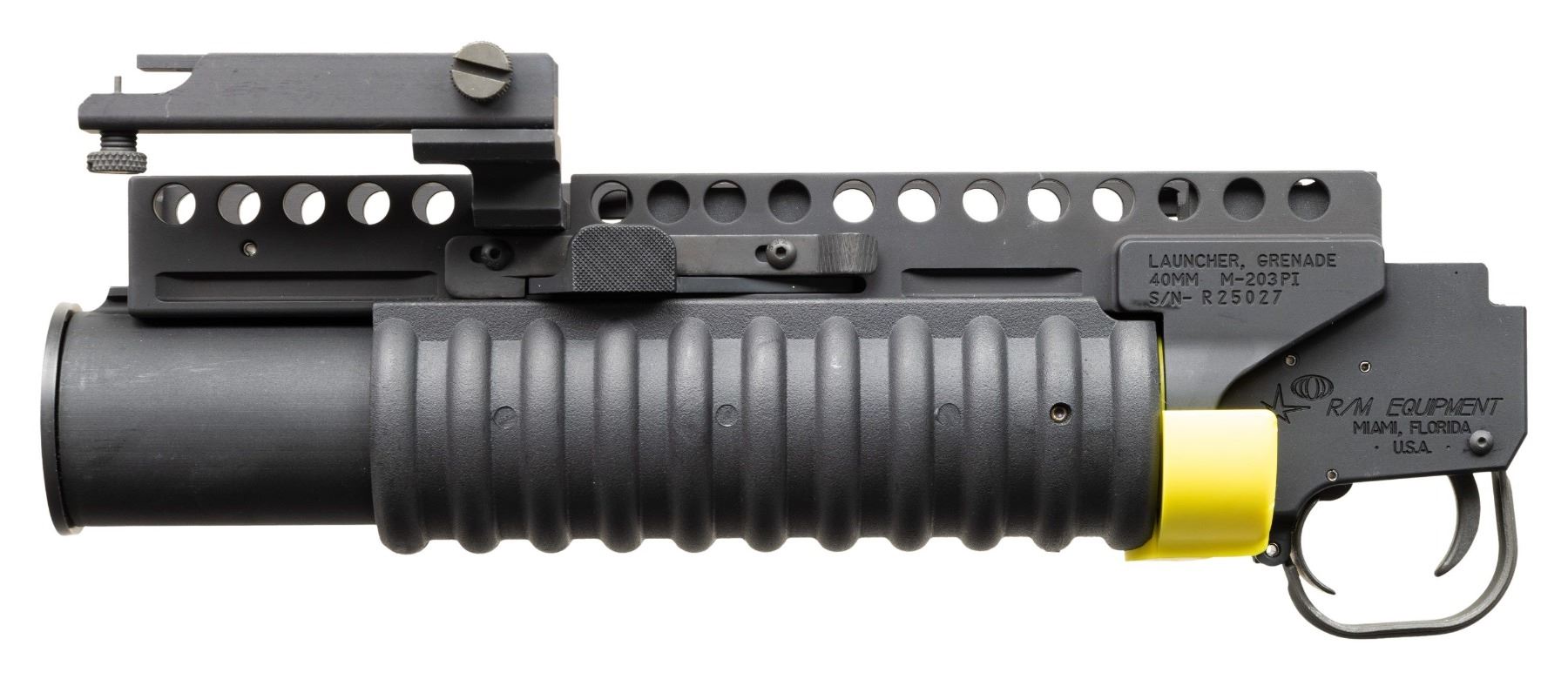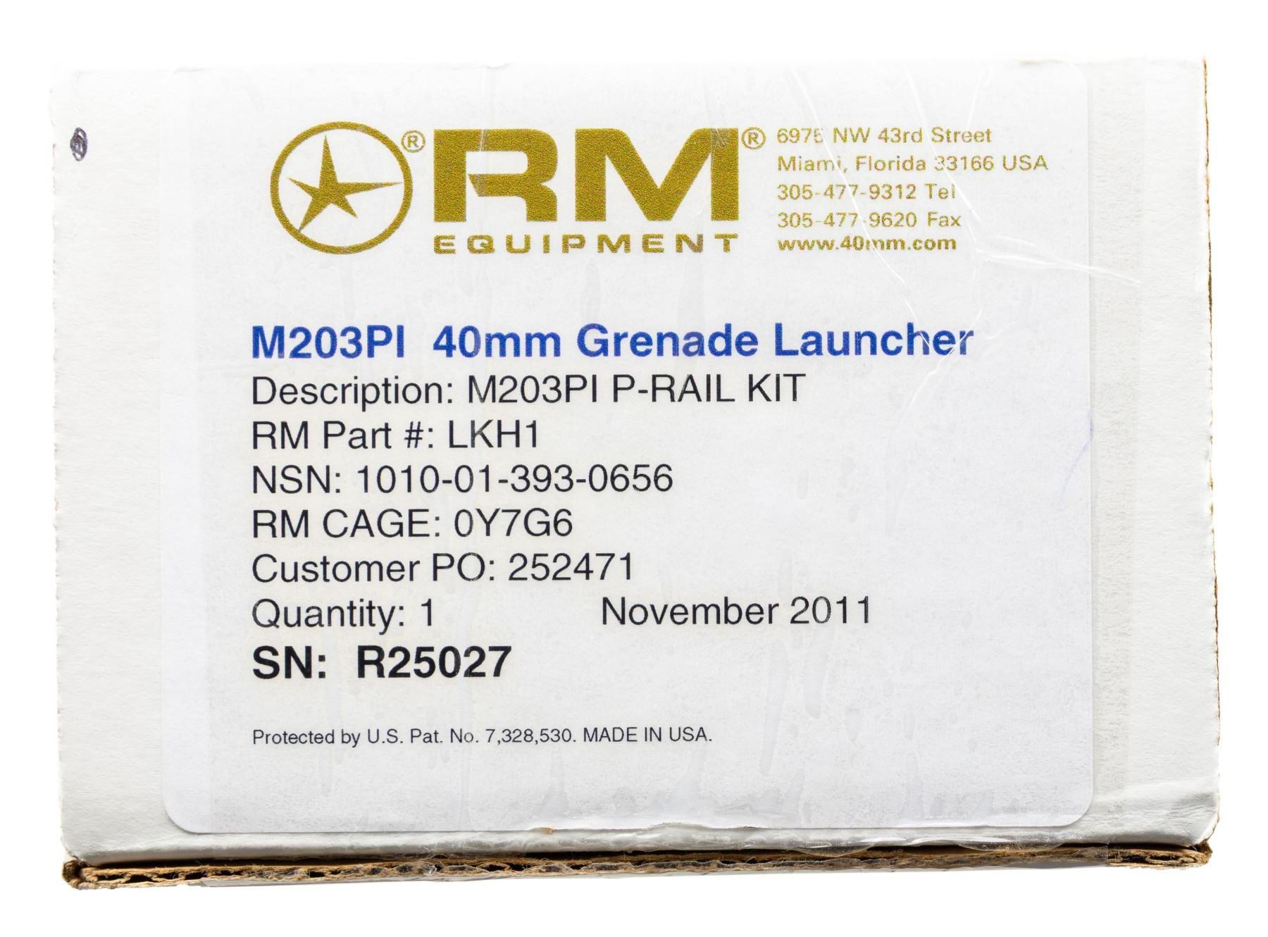 Cal 40mm. S#R25027. RM Equipment was founded in the early 1970s and specializes in the M-203 PI (Product Improved) Grenade Launcher. While the M-203 is well known and widely used, the M-203PI offers enhanced mounting for numerous rifles as well as stand alone capability. They have received numerous federal contract awards going back over 20 years. These interesting grenade launchers are set up with Larue quick detach p-rail mounts and a flip up launcher sight graduated to 400 meters. UNATTACHED ACCESSORIES: original box and manual. CONDITION: as new, unfired. PROVENANCE: Military Museum Collection of Shooters Outpost, Hooksett NH.NATIONAL FIREARMS ACT DESTRUCTIVE DEVICE REQUIRING BATF TRANSFER BEFORE TAKING POSSESSION. FULLY TRANSFERABLE. (03-1999/ZAL). MODERN. CLASS III. $2,500-3,500.