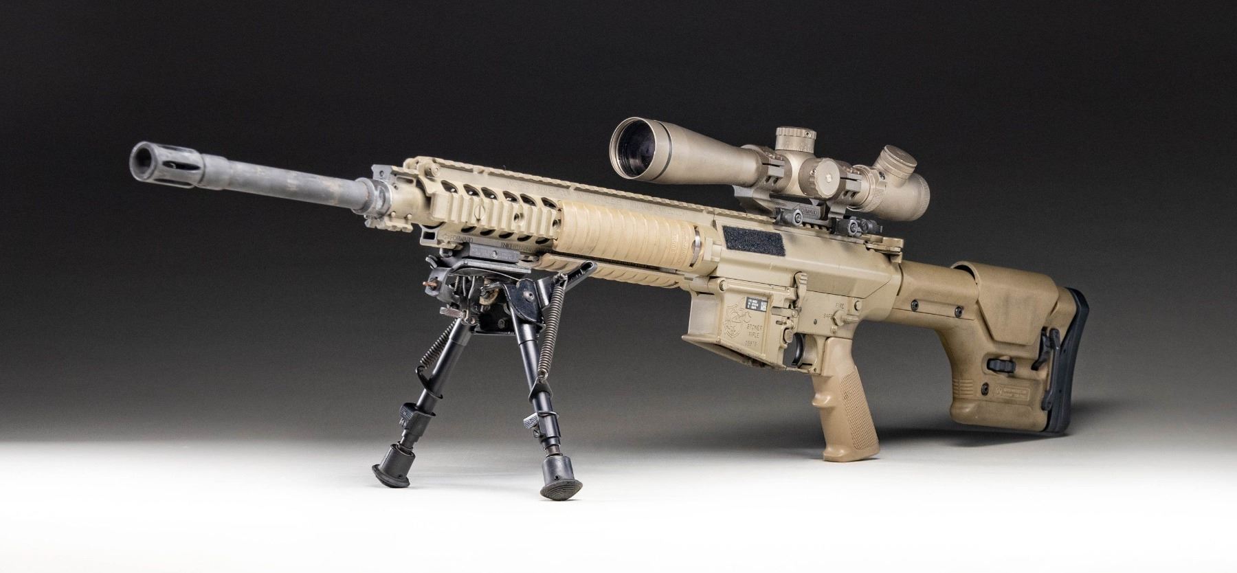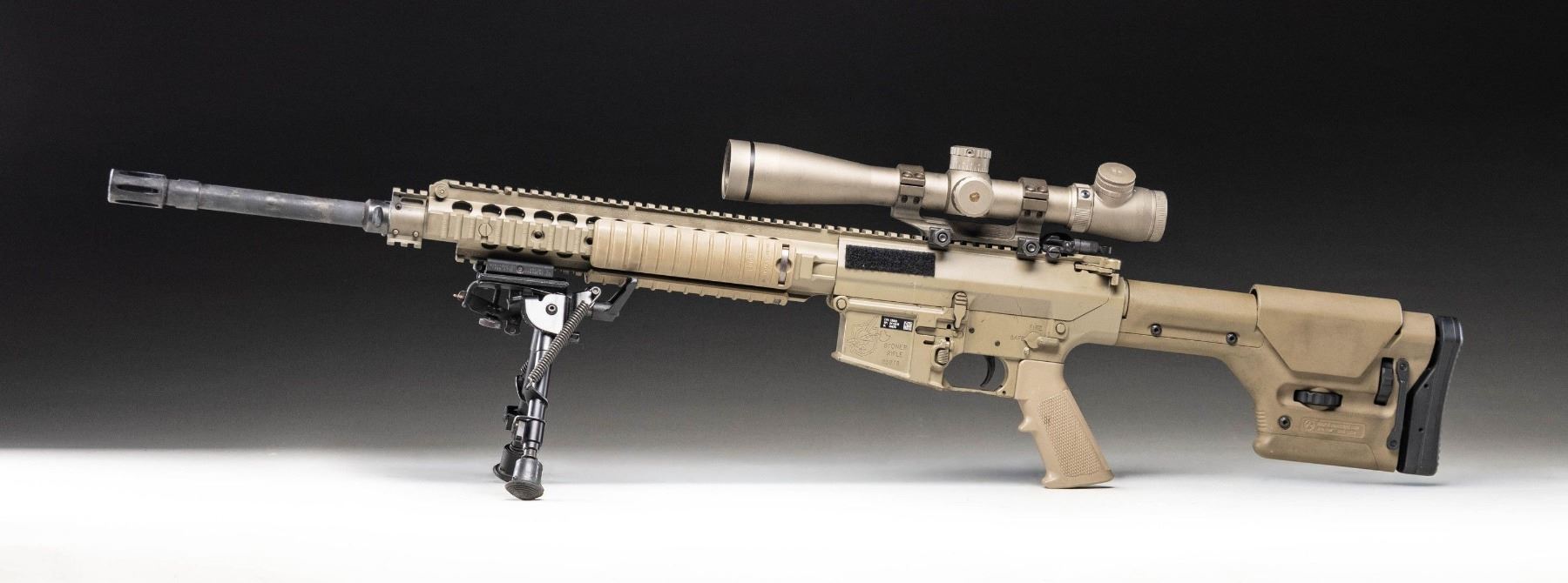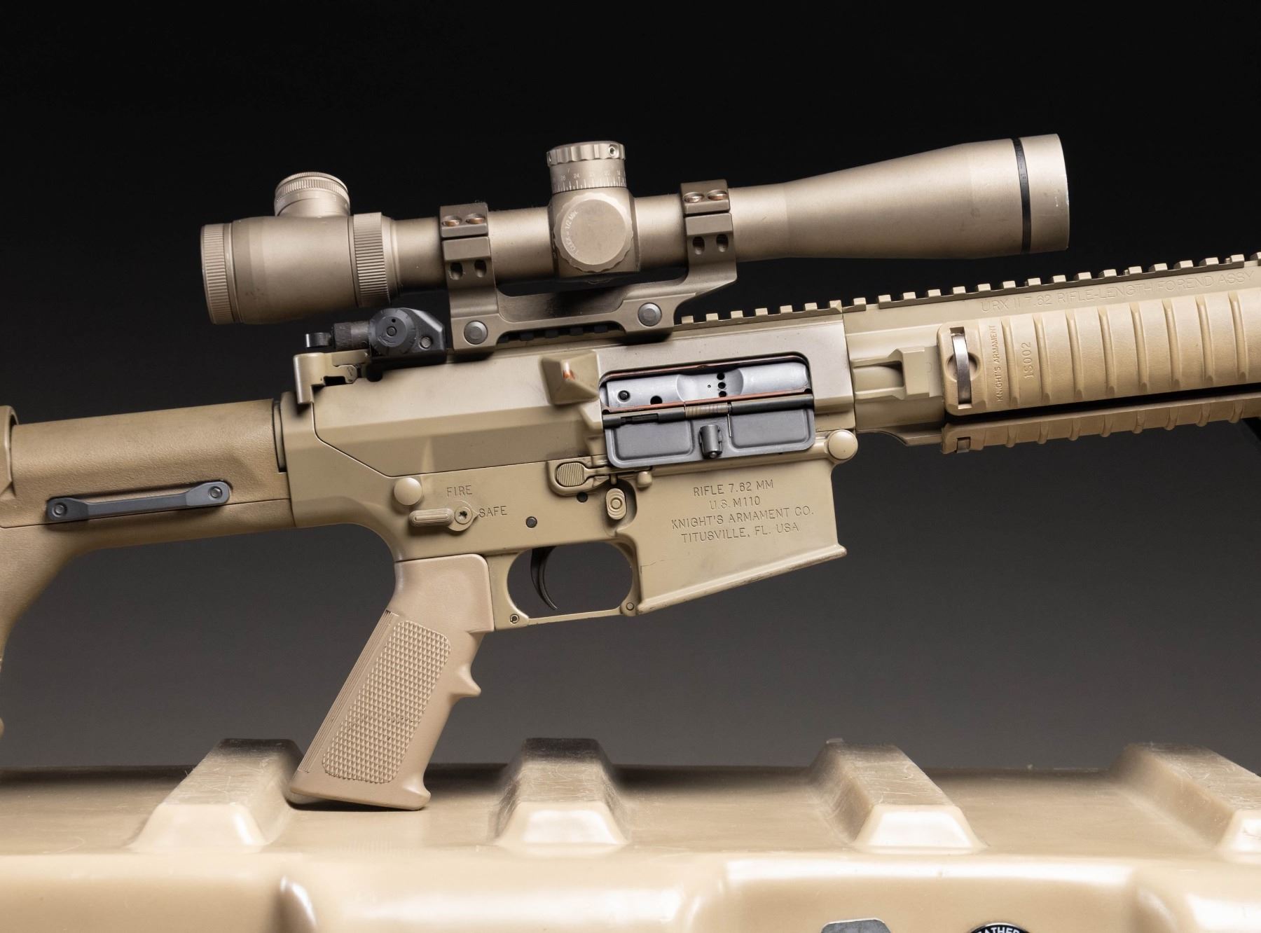 SEMI AUTO SNIPER RIFLE. Cal. 7.62x51. S# 05676. Bbl. 20" with flash hider. Actual military issued examples of the M110 are very rarely offered on the public market & this rifle represents a great chance the advanced military collector to acquire an original as issued M110 with US government roll markings. As far as this cataloger is aware this is the only the second time an Air Force issue M110 has been offered for sale at public auction. Right side of lower has KAC Titusville, FL markings. The AR-10 based M110 has been used by the US military since 2008, as both a sniper & marksman rifle. This weapons system has seen wide spread use in various Middle Eastern conflicts. Rifle is sighted with a FDE finish Leupold MK4 3.5-10x power scope on a Knight's Armament mount. Scope has mil-dot crosshair reticle & very good optics. Rifle is also equipped with a folding KAC aperture rear sight but no front iron sight is present. Right handed FDE charging handle. Safety, mag release & bolt release are all ambi. Bbl. & flash hider have a gray appearance with traces of FDE finish. Balance of metal has FDE finish. Magpul PRS stock & A2 style FDE pistol grip. KAC URX II quadrail handguard with three rail covers & Harris SBRM bipod. MAGS: 4-10 rd. & 4-20 rd. Total of 8. UNATTACHED ACCESSORIES: matching numbered Hardig case with two military manuals, 25 meter zeroing target, CMP Certificate of Authenticity stating the rifle is indeed a US Military issued rifle, a 2014 dated KAC test target, other CMP paperwork, four single mag pouches, one dual mag pouch, a large scope pouch & Otis cleaning kit. Also included is a document stating this gun was shipped from Picatinny arsenal to the Anniston Army depot in 2014. The document further states that it was later shipped from Anniston to the 355th Logistics Readiness Squadron in 2021 at Davis-Monthan Air Force Base. It is highly likely this rifle was issued to either Air Force Pararescue, as the 48th Rescue Squadron are stationed at Davis-Monthan or the 355th Security Forces Squadron sniper teams. CONDITION: furniture shows the expected handling & usage wear of a military arm with some black staining. Bbl. & flash hider are mostly gray with traces of FDE finish, edge wear, some light oxidation & notable carbon fouling. Balance of metal retains 93% FDE with scattered light flaking, handling marks, scratches & some operational wear. Action functions properly when hand cycled. Bright near excellent bore. (25-6189/MJC). MODERN. $40,000-60,000.