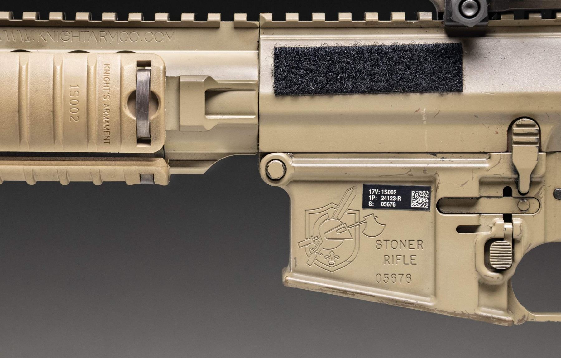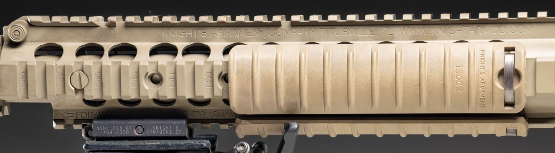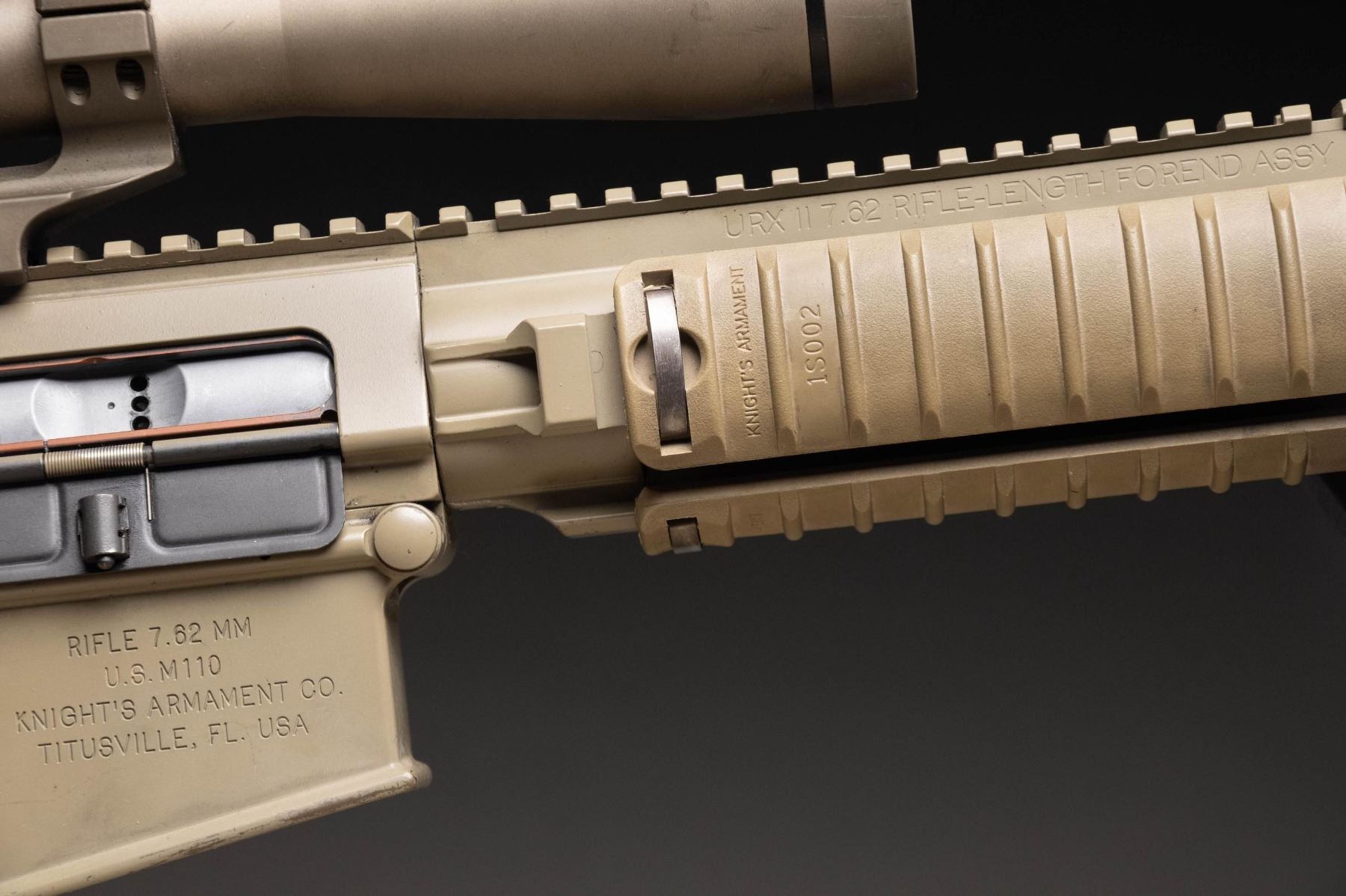 SEMI AUTO SNIPER RIFLE. Cal. 7.62x51. S# 05676. Bbl. 20" with flash hider. Actual military issued examples of the M110 are very rarely offered on the public market & this rifle represents a great chance the advanced military collector to acquire an original as issued M110 with US government roll markings. As far as this cataloger is aware this is the only the second time an Air Force issue M110 has been offered for sale at public auction. Right side of lower has KAC Titusville, FL markings. The AR-10 based M110 has been used by the US military since 2008, as both a sniper & marksman rifle. This weapons system has seen wide spread use in various Middle Eastern conflicts. Rifle is sighted with a FDE finish Leupold MK4 3.5-10x power scope on a Knight's Armament mount. Scope has mil-dot crosshair reticle & very good optics. Rifle is also equipped with a folding KAC aperture rear sight but no front iron sight is present. Right handed FDE charging handle. Safety, mag release & bolt release are all ambi. Bbl. & flash hider have a gray appearance with traces of FDE finish. Balance of metal has FDE finish. Magpul PRS stock & A2 style FDE pistol grip. KAC URX II quadrail handguard with three rail covers & Harris SBRM bipod. MAGS: 4-10 rd. & 4-20 rd. Total of 8. UNATTACHED ACCESSORIES: matching numbered Hardig case with two military manuals, 25 meter zeroing target, CMP Certificate of Authenticity stating the rifle is indeed a US Military issued rifle, a 2014 dated KAC test target, other CMP paperwork, four single mag pouches, one dual mag pouch, a large scope pouch & Otis cleaning kit. Also included is a document stating this gun was shipped from Picatinny arsenal to the Anniston Army depot in 2014. The document further states that it was later shipped from Anniston to the 355th Logistics Readiness Squadron in 2021 at Davis-Monthan Air Force Base. It is highly likely this rifle was issued to either Air Force Pararescue, as the 48th Rescue Squadron are stationed at Davis-Monthan or the 355th Security Forces Squadron sniper teams. CONDITION: furniture shows the expected handling & usage wear of a military arm with some black staining. Bbl. & flash hider are mostly gray with traces of FDE finish, edge wear, some light oxidation & notable carbon fouling. Balance of metal retains 93% FDE with scattered light flaking, handling marks, scratches & some operational wear. Action functions properly when hand cycled. Bright near excellent bore. (25-6189/MJC). MODERN. $40,000-60,000.