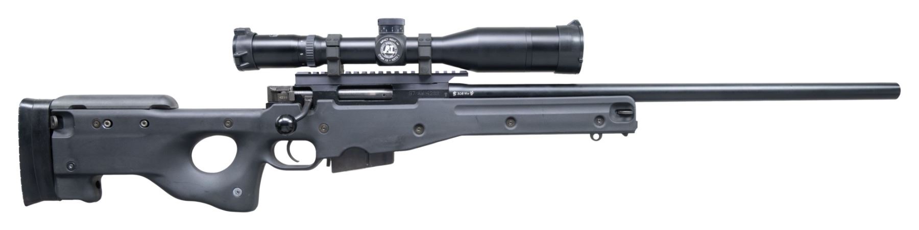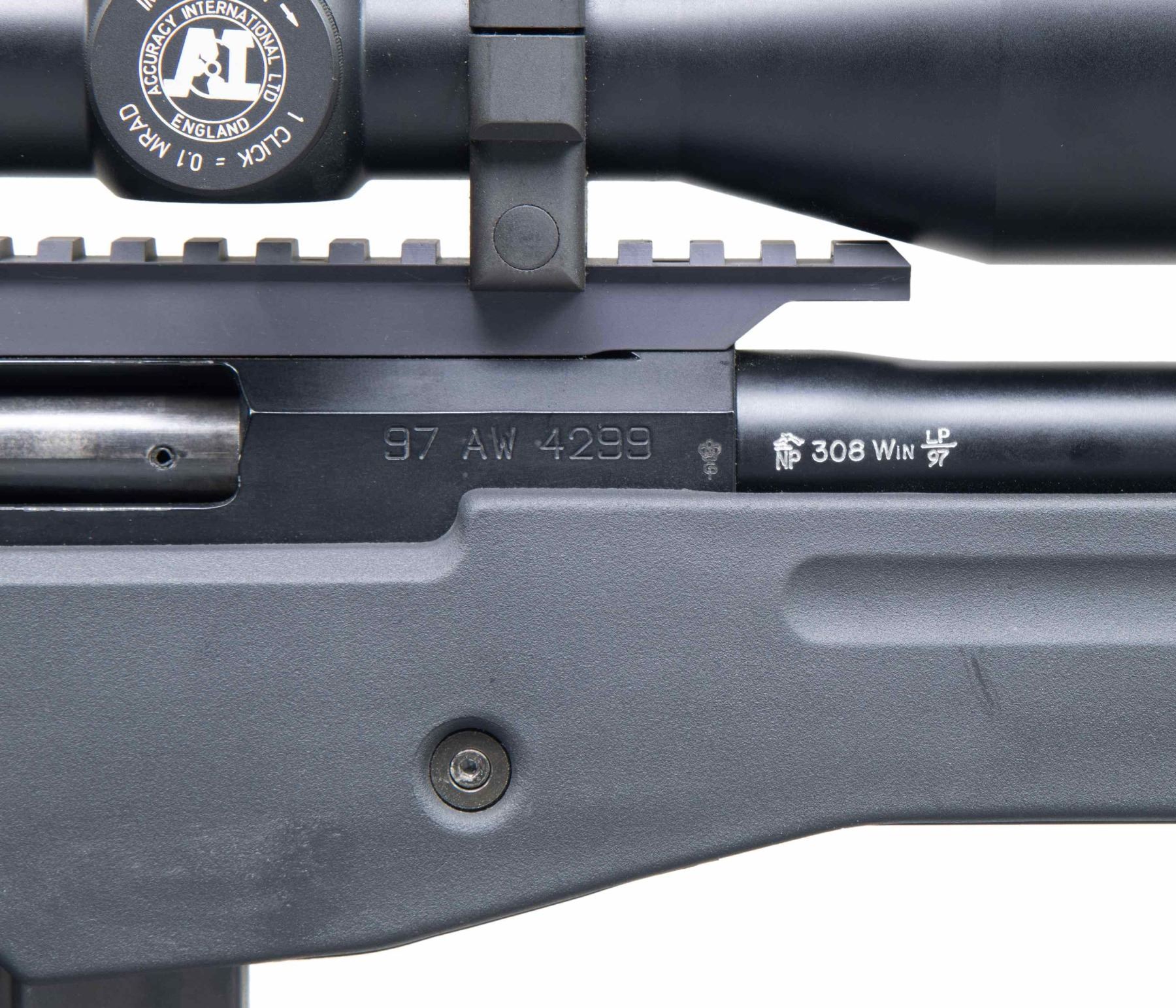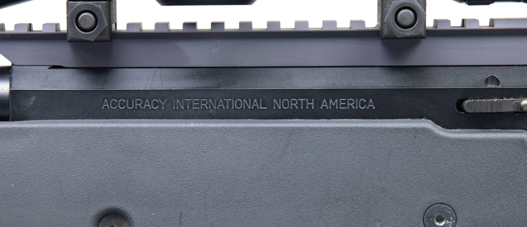 AW BOLT ACTION RIFLE WITH SCHMIDT & BENDER SCOPE. Cal. 308 Win. S# 4299. Bbl. 25". Model AW (Arctic Warfare) bolt action rifle mfg. in England by Accuracy International in 1997. The AW series was an improved variation of the iconic L96A1, with the "AW" name being derived from design features that were implemented to allow for use in extremely cold environments. The left side of the receiver is marked "ACCURACY INTERNATIONAL NORTH AMERICA", with "97 AW 4299" marked on the right. Right side of the receiver and bbl. exhibit British commercial proofs. Metal components exhibit a black enamel type finish overall, with the body exhibiting a blue finish. Distinctive L96 pattern thumbhole stock, with adj. comb and grid pattern Accuracy International black rubber recoil pad. Underside of forearm features a bipod rail. 8 3/8" receiver picatinny rail is fitted with a Schmidt & Bender 3-12x50mm MRAD scope with Police FPP reticle. All serialized parts are matching and include the receiver and bolt assembly. Bbl. is numbered "4711". MAGS: 1 10-rd. CONDITION: receiver and bbl. retain the vast majority of their original factory black enamel finish, exhibiting some superficial handling marks and a few spots of light edge wear. Bolt assembly shows mild wear and thinning, but otherwise presents nicely. Brilliant mirror chrome lined bore retains well defined rifling throughout. Stock shows some minor superficial marks from handling and storage. Scope retains a clear and sharp optic. A fine example of an iconic and highly desirable rifle. (25-3620/MLW). MODERN. $3,500-5,500.