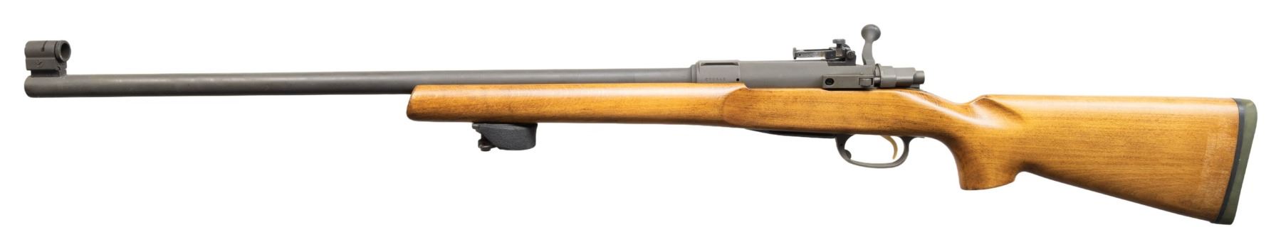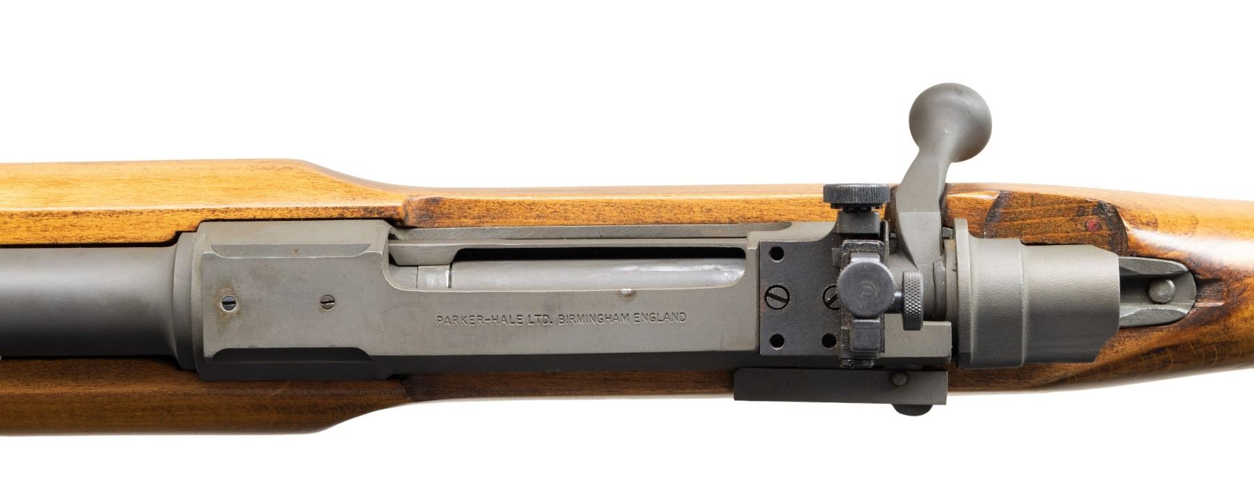 Cal. 7.62x51mm. S# 02064C. Bbl. 26". M82 bolt action rifle mfg. in England by Parker-Hale. Top of the receiver is marked "PARKER-HALE LTD. BIRMINGHAM ENGLAND", with the S# marked on the left side of the chamber. Left side of the bbl. is marked with a single British crown over "BNP" nitro proof. Metal components exhibit a parkerized finish overall, save for on the trigger, which exhibits a gold colored finish, as well as the rear sight assembly, which is blued. 1-piece plain wood beavertail pistol grip stock features a hand stop and hand stop rail on the underside of the forearm, as well as an unmarked brown rubber recoil pad. Right side of stock wrist is inletted for a sliding safety lever, which is absent. Stock appears to have been lightly sanded and refinished. Globe front sight with flip-up ladder aperture rear sight graduated 2-13. Top of the receiver is drilled, tapped, and grooved for scope mount attachment. MAGS: 1 blued and black enamel finished steel 4-rd. Right side of mag. is marked "PARKER-HALE ENGLAND/ PART No 98/223/ CAL 30/06&270". CONDITION: metal components retain the vast majority of their original parkerized finish, showing some light superficial handling marks, as well as some scattered spots of light surface oxidation and pitting (predominately on the bbl.). Bore is bright, exhibiting scattered patches of mild to moderate pitting, while retaining strong rifling throughout. Proper manual mechanics. Stock shows few minor superficial marks from handling and storage, but otherwise remains very good overall. PROVENANCE: From the Buckstix Collection. (25-6409/MLW). MODERN. $1,200-1,800.