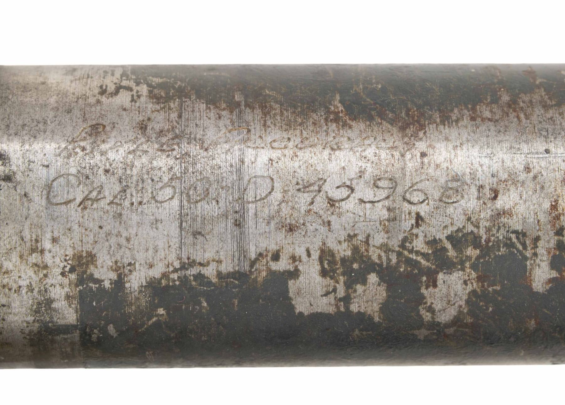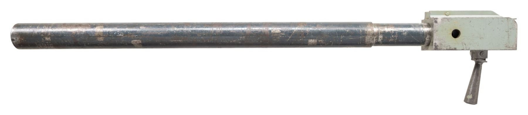 ACCURACY DEVICE. Cal. 50 BMG. S# 3048. Bbl. 35 7/8". This very large, heavy & interesting device was used to test the accuracy of 50 caliber machine gun ammunition. Though similar to other Mann devices, this barrel is fitted w/ a bolt action single shot receiver. The receiver is faintly electro-penciled on top "SA / NO130". Firing is accomplished by a spring-loaded over center hammer. The barrel, which measures approx. 2 1/4" in diameter, has a 4 3/4" rebated section forward of the receiver measuring approx. 2" in diameter. The rebated section is electro-penciled "RIFLE, ACCURACY / CAL. .50-D-45968". The barrel is additionally marked forward of the rebate "M / JM3 / SA15323 / D35496 / SA 9-42 / 3048 / F / small circular symbol resembling sunburst". CONDITION: receiver retains 50% of its thinning flaking light gray paint except the top, which is left in the white. Bolt assembly is in the white. Handling is turning gray w/ patina. Barrel turning gray & patina, showing traces of a dark blue paint w/ wear & handling marks. Very good shiny bore w/ sharp lands. (25-6123/RW). CURIO. $3,000-5,000.