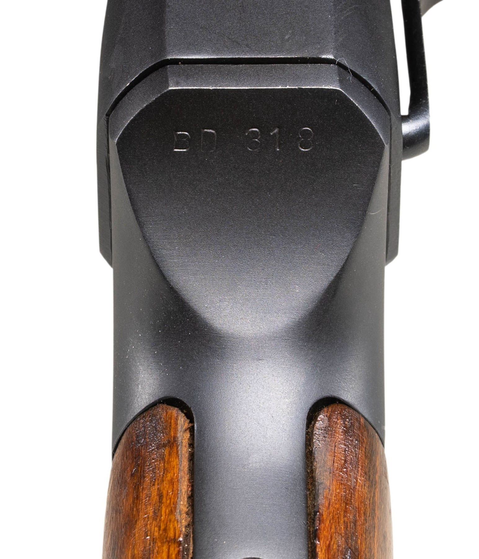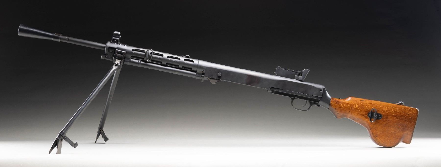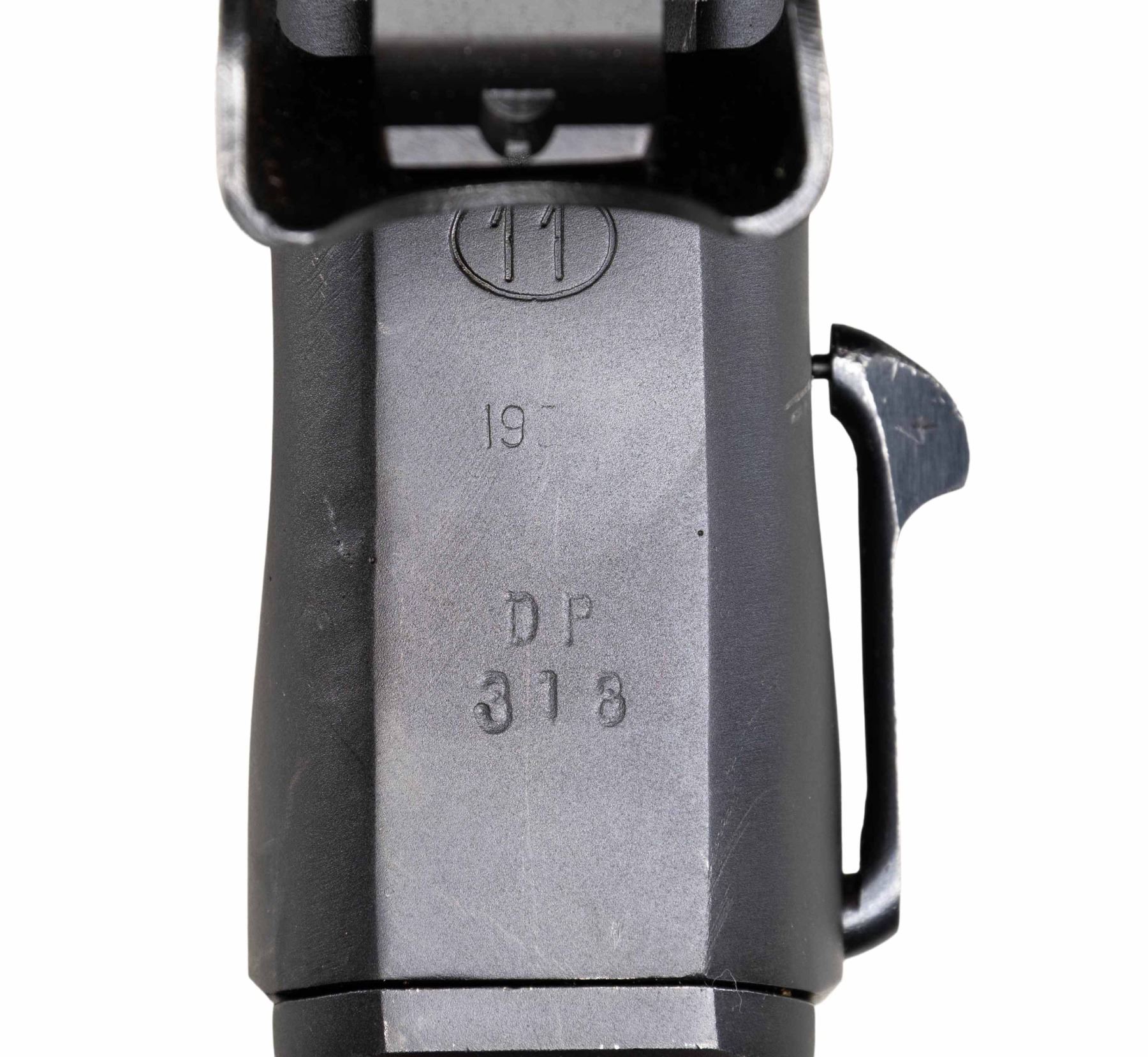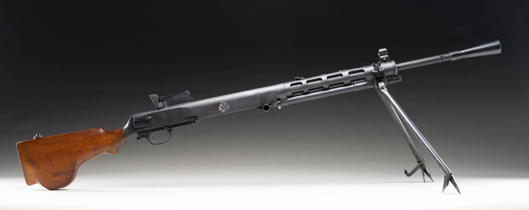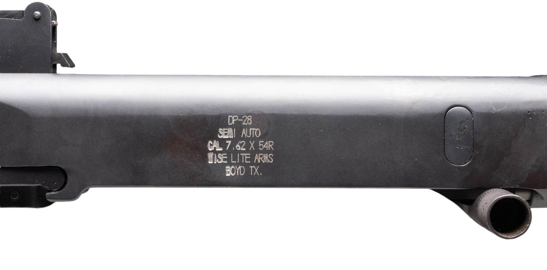 Cal. 7.62x54R. S# DP318. Bbl. 23 3/4". Originally mfg. as a DP-28 machine gun in Poland by Radom during the 1950s, this example was subsequently cut, imported, and reconfigured from a parts kit into a semi-automatic rifle for commercial sales by Wise Lite Arms. Right side of the receiver is engraved "DP-28/ SEMI AUTO/ CAL 7.62 X 54R/ WISE LITE ARMS/ BOYD TX.". Top rear section of the receiver is marked with Radom's "11" within an oval insignia, above a partially legible year of mfg. "195x" and the S#. Metal components exhibit a reapplied blue finish overall. Distinctive DP-28 contour plain wood buttstock with threaded oiler on comb. Open top post front sight with tangent square notch rear sight graduated 1-15. Integral ventilated handguard is fitted with an original bipod. Matching numbers are present on the receiver and lower assembly. Underside of bolt carrier has been numbered "318" to match. Mag. is absent. CONDITION: near excellent, with metal components retaining the vast majority of their reapplied blue finish, exhibiting some superficial handling marks and scratches, with a couple of patches of light to mild surface oxidation and pitting present on the underside of the bbl. Mirror bore, retaining well defined rifling throughout. Proper manual mechanics. Stock shows some scattered superficial handling marks, scratches, and impressions, but otherwise remains sound. An attractive example of a Wise Lite DP-28 semi-automatic rifle. (25-2300/MLW). MODERN. $3,000-4,000.