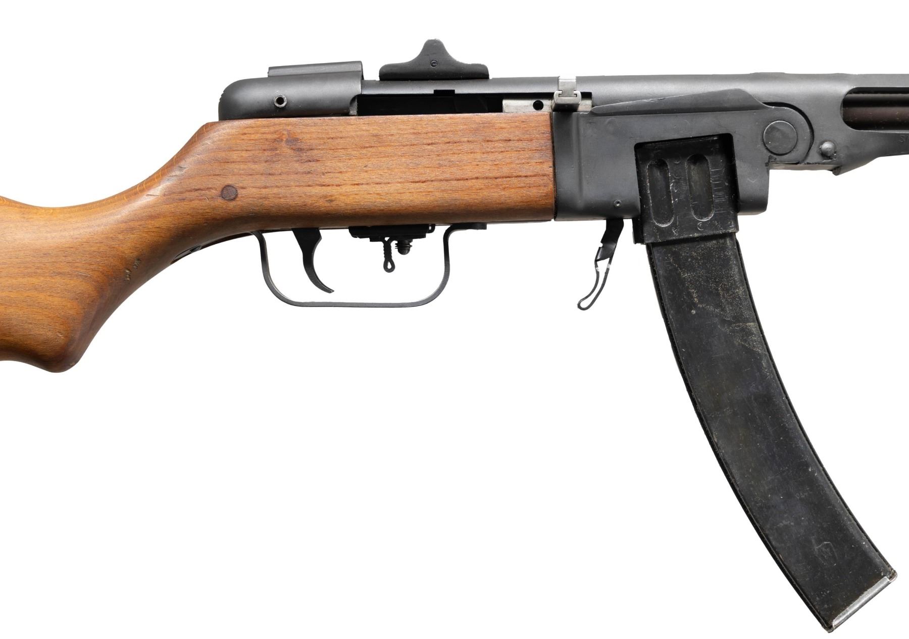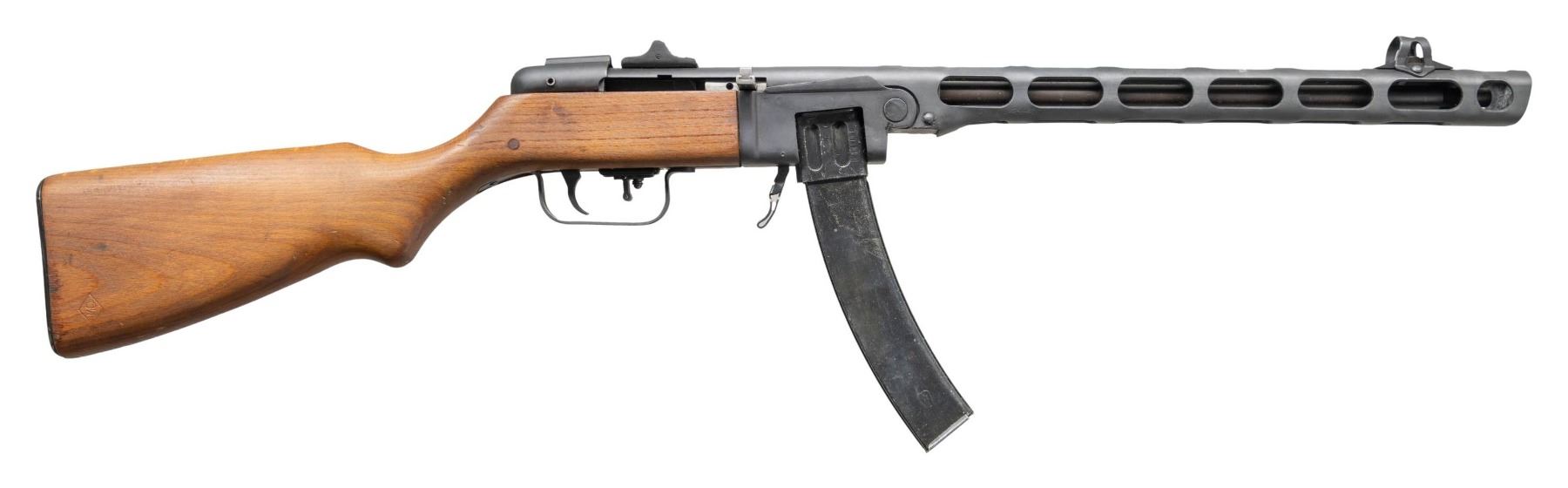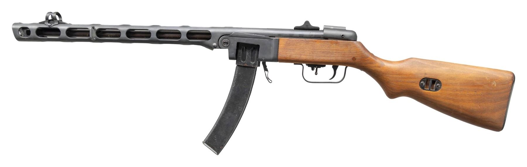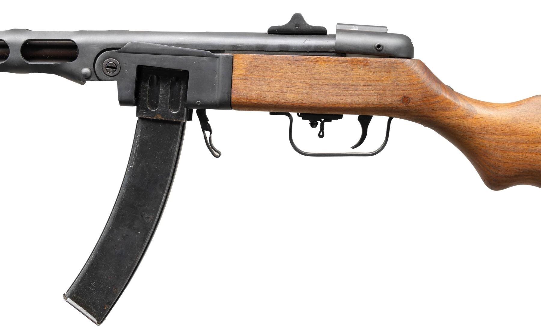 Cal. 7.62x25mm. S# WLA26-4076. Bbl. 16 1/8". PPSH-41 semi-automatic rifle mfg. by Wise Lite Arms on a new semi-automatic receiver from surplus parts. Left side of the receiver/bbl. shroud is marked "WISE LITE ARMS BOYD, TX 7,62X25mm Mod. PPSH41", with the S# marked on the right. Metal components exhibit a dull blue finish overall, save for on the bolt assembly, which is polished in-the-white. 1-piece plain wood pistol grip stock with flat steel buttplate. Hooded post front sight with 2-leaf square notch rear sight graduated "10" and "20". Contemporary replacement bolt buffer. MAGS: x3 blued steel 35-rd. stick mags. CONDITION: excellent, with metal components retaining virtually all of their reapplied blue finish overall, exhibiting some minor superficial handling marks. Near mirror bore, exhibiting some light pitting, while retaining well defined rifling throughout. Proper manual mechanics. Stock exhibits some scattered marks and impressions, but otherwise remains sound. (25-2341/MLW). MODERN. $1,000-1,500.