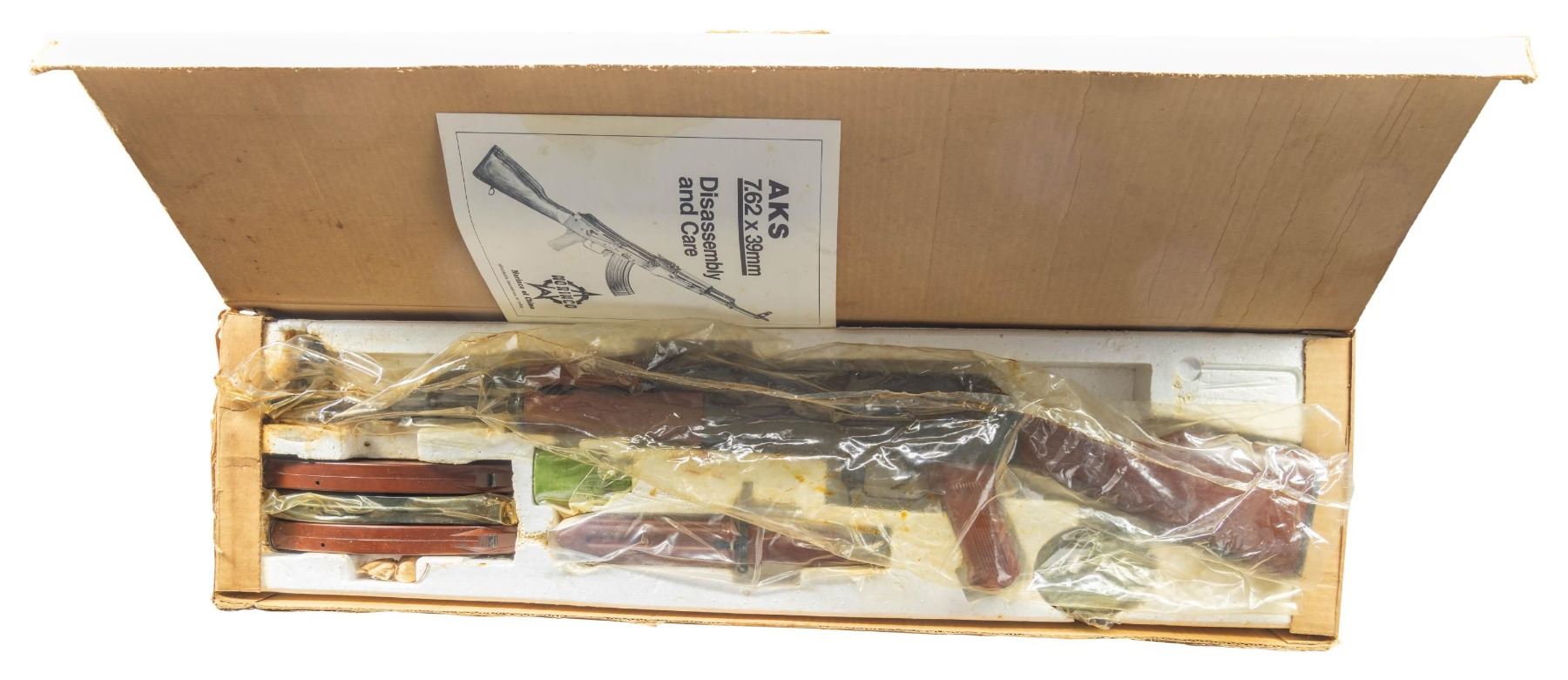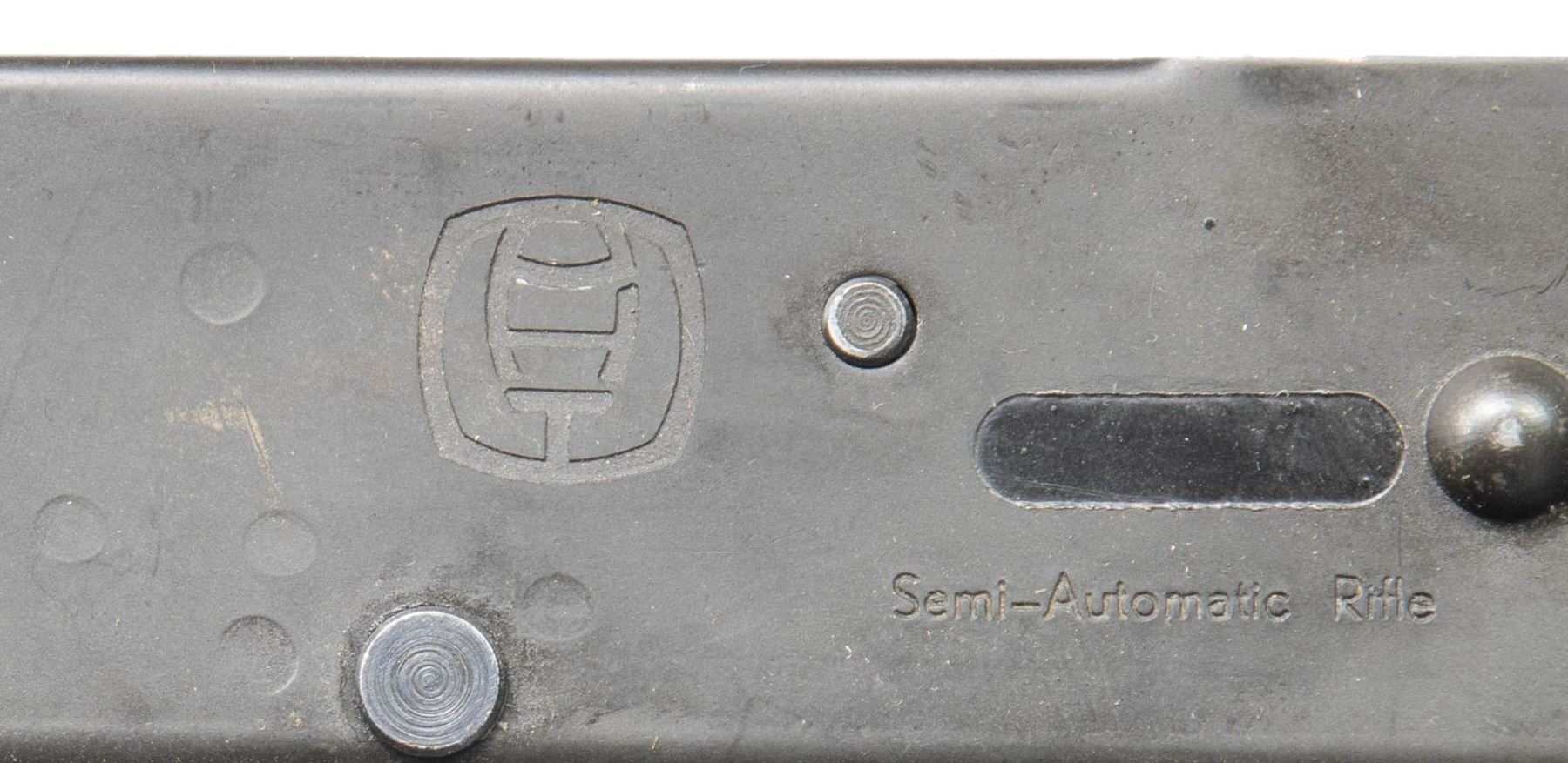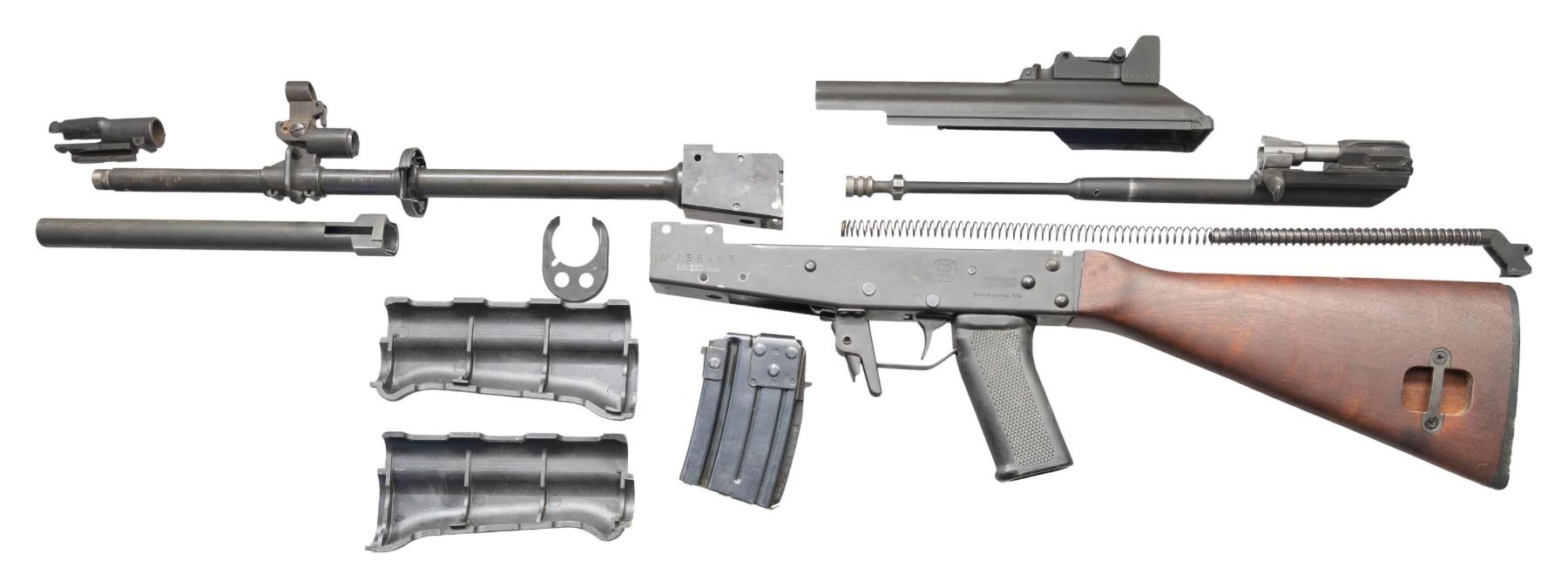 Cal. 223 Rem. S# 156688. Bbl. 16 1/2". M76 semi-automatic rifle parts kit mfg. in Finland by Valmet. The left side of the receiver is marked with the S# above the cal. designation, followed by an apparent "P/ H/ T" logo, a small oblong milled panel, and "Semi-Automatic Rifle", with "VALMET", "Made in Finland", as well as a Finnish lion's head proof and "C" marked on the right. Underside of receiver is marked "Valmet, Inc, Elmsford/ New York". Parts kit consists of the receiver, selector lever, trigger assembly, impress checkered black synthetic buttstock, fixed plain wood buttstock, bbl. (with broken trunnion), 3-prong flash hider, receiver cover, mainspring & mainspring guide rod, bolt carrier, bolt, gas cyl. tube, 2-piece checkered black synthetic forearm, as well as 1 desirable 3-weld blued steel 15-rd. mag. All serialized parts are matching and include the receiver and receiver cover. CONDITION: metal components retain the majority of their original factory finish, exhibiting some scattered handling marks and spots of light surface oxidation. Right side of receiver exhibits several spots of finish loss and heat related discoloration from removal of the trunnion. Mirror bore, exhibiting some scattered spots of light pitting, while retaining well defined rifling throughout. Synthetic and wood furniture shows some superficial handling marks, but otherwise remain sound. (25-4376/MLW). MODERN. $1,200-1,800.