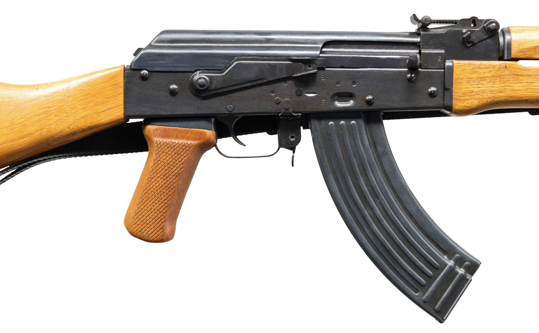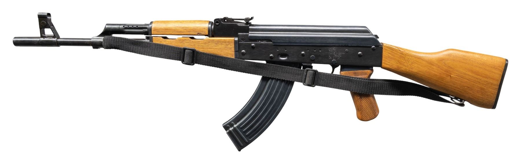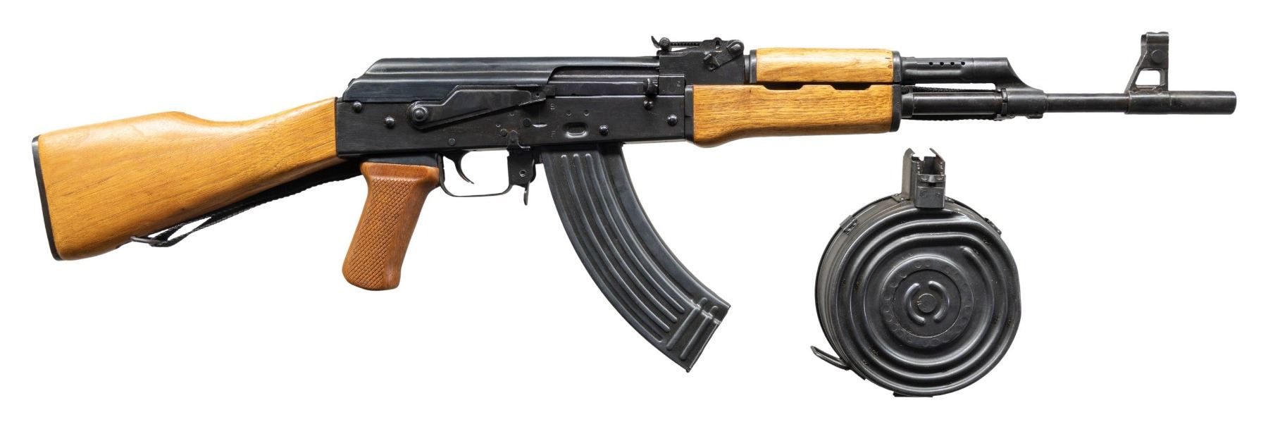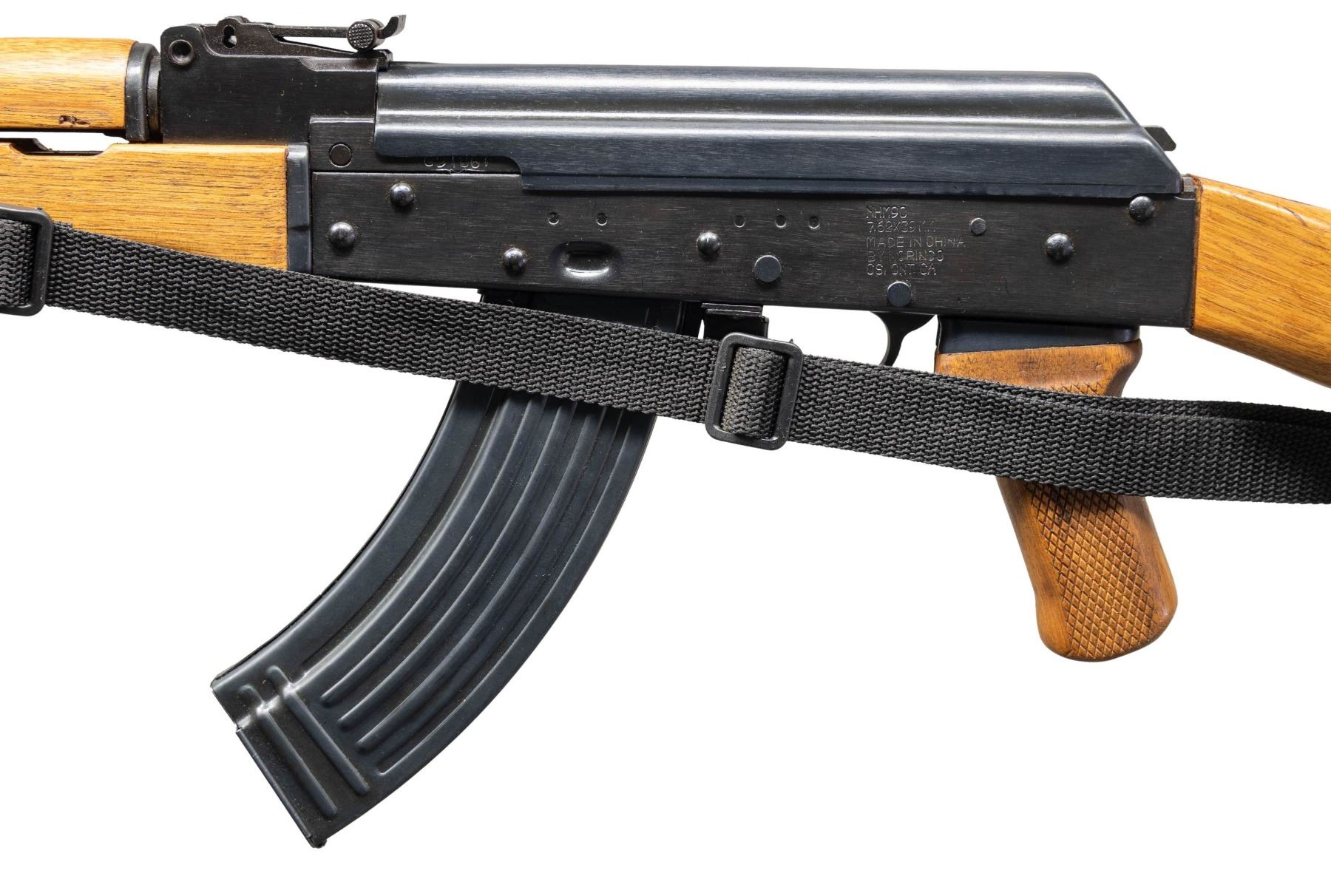 DRUM MAGAZINE. Cal. 7.62x39mm. S# 091867. Bbl. 17 5/8" (with factory welded bbl. extension). NHM90 semi-automatic rifle mfg. in China by Norinco and imported by CSI. Left side of the receiver is marked with the S# (on trunnion), followed by additional markings stipulating the model and cal. designations, as well as CSI's importer information. Metal components exhibit a blue finish overall, save for on the piston, which appears to be chrome plated. Plain wood forearm and handguard with flat checkered pistol grip, and fixed wood buttstock with steel trapdoor buttplate. Trapdoor cleaning kit is present. Open top AK pattern post front sight with tangent V-notch rear sight marked "D" (in lowest position) and graduated 1-8. Chrome lined bore with factory ground down bayonet lug. All serialized parts are matching and include the receiver (on trunnion), receiver cover, mainspring guide rod, bolt carrier, bolt, as well as the gas cyl. tube. MAGS: 1 Chinese blued steel 30-rd. mag. and 1 Chinese Factory 396 blued steel 75-rd. drum mag. CONDITION: metal components retain the vast majority of their original factory blue finish, showing some scattered superficial handling marks and light scratches overall. Brilliant mirror chrome lined bore, retaining well defined rifling throughout. Proper manual mechanics. Wood furniture shows a few superficial handling marks and impressions, but otherwise remains sound. (25-4794/MLW). MODERN. $500-900.