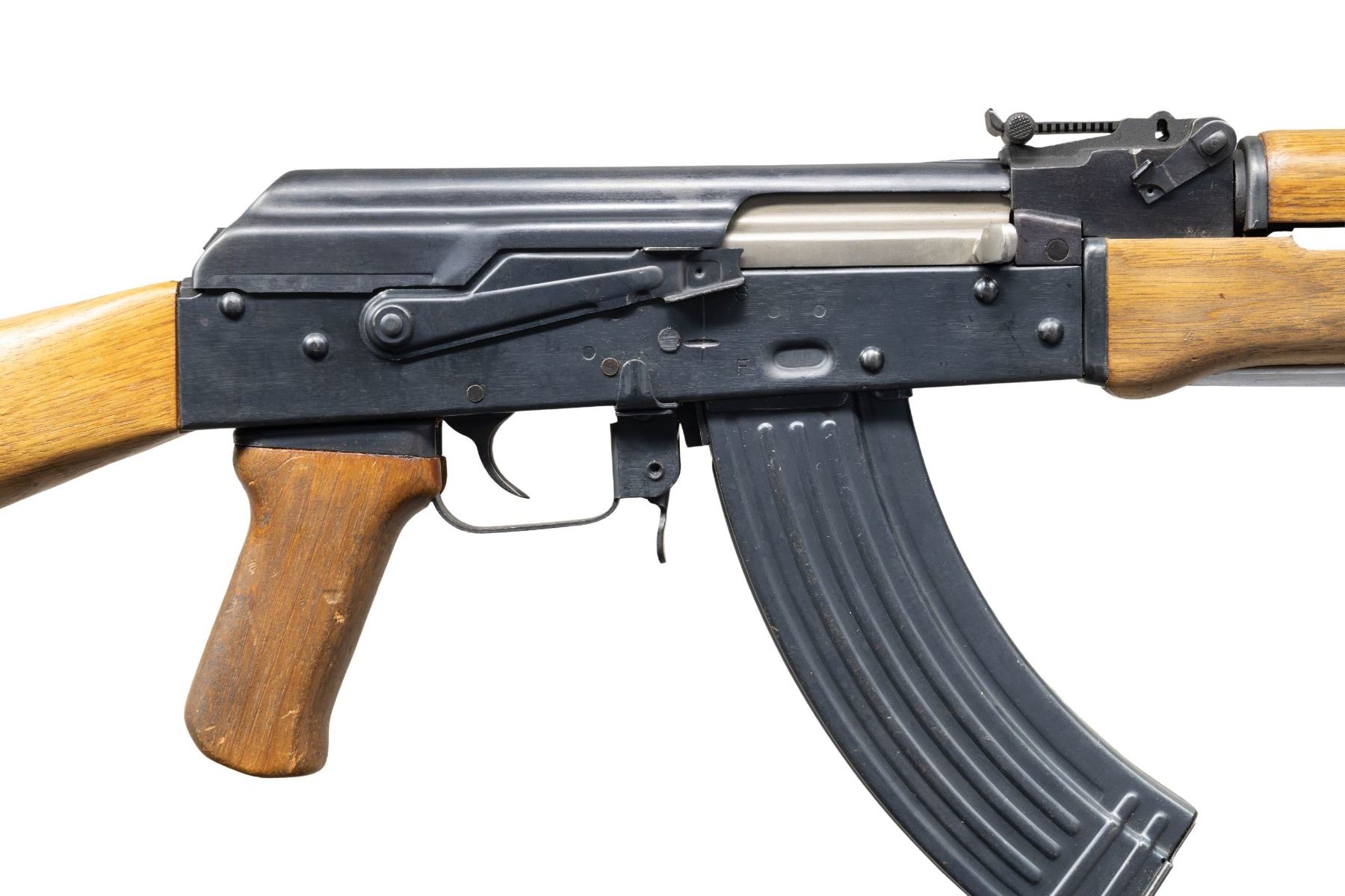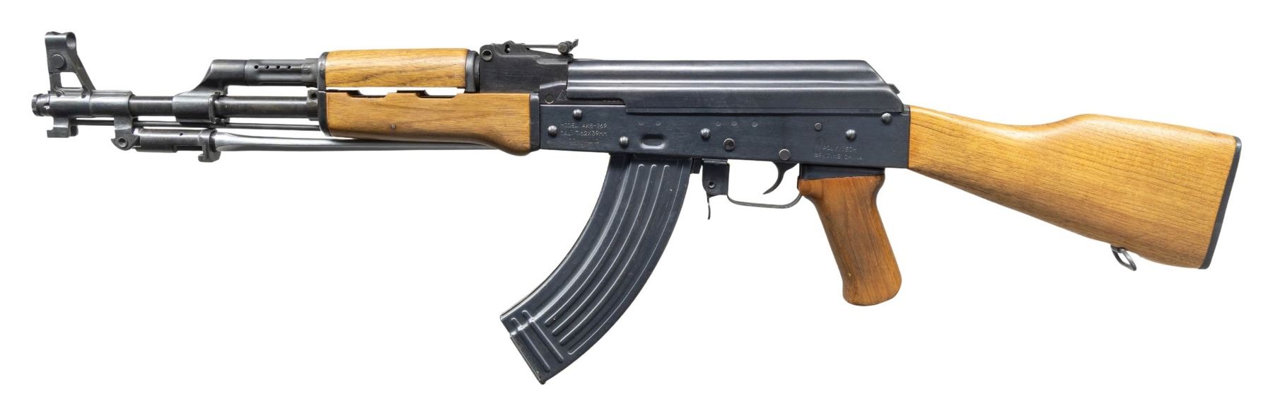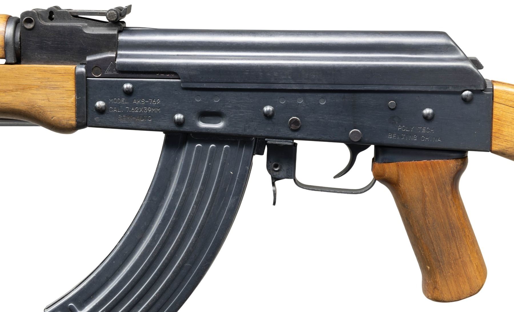 SEMI-AUTOMATIC RIFLE. Cal. 7.62x39mm. S# PW85-762-5264. Bbl. 16 1/4". AKS-762 semi-automatic rifle mfg. in China at Factory 416 for Polytech and imported by KFS. Left side of the trunnion is marked with Factory 416's "416" within a triangle insignia, followed by the S#. Left side of the receiver is marked with the model and cal. designations, as well as Polytech's mfg. information, with KFS' importer information marked on the underside ahead of the mag. well. Metal components exhibit a blue finish overall, save for on the bolt assembly, which is polished in-the-white, exhibiting a brown tinged appearance. Plain wood forearm, handguard, pistol grip, and buttstock with steel trapdoor buttplate. AK pattern post front sight with tangent V-notch rear sight marked "D" (lowest position) and graduated "1-8". Chrome lined bore with threaded muzzle, muzzle cover, and spike pattern folding bayonet. Cleaning rod and trapdoor cleaning kit are present. All serialized parts are matching and include the receiver (trunnion), bolt carrier, bolt, and gas cyl. tube. MAGS: 1 blued Chinese 30-rd. CONDITION: metal components retain the vast majority of their original factory blue finish, showing some scattered superficial handling marks and light scratches, as well as a few small spots of light surface oxidation. Underside of bayonet lug exhibits a small spot of light pitting. Brilliant mirror chrome lined bore, retaining well defined rifling throughout. Proper manual mechanics. Wood furniture shows some scattered marks and impressions from handling and storage, but otherwise remains sound. (25-2289/MLW). MODERN. $1,200-2,000.