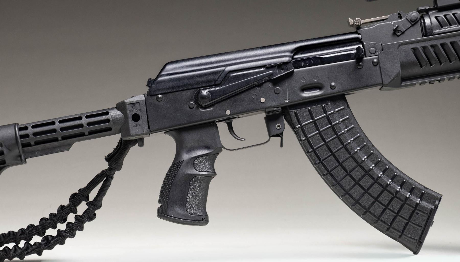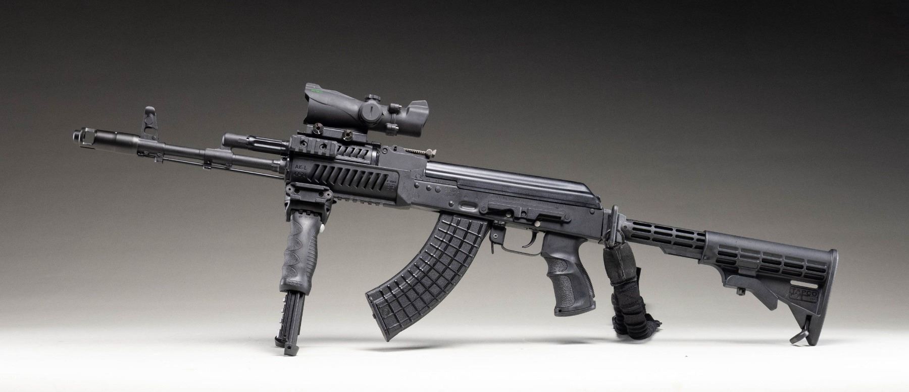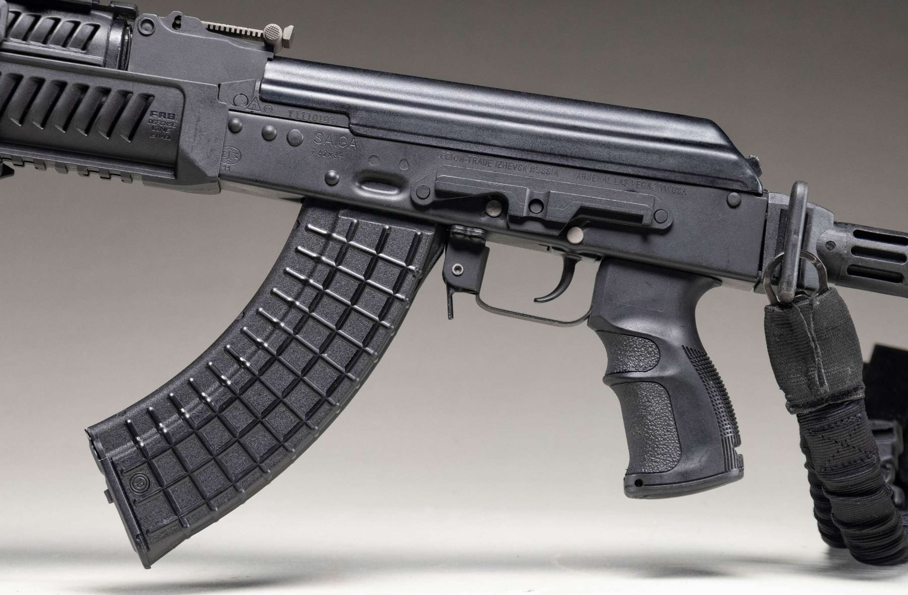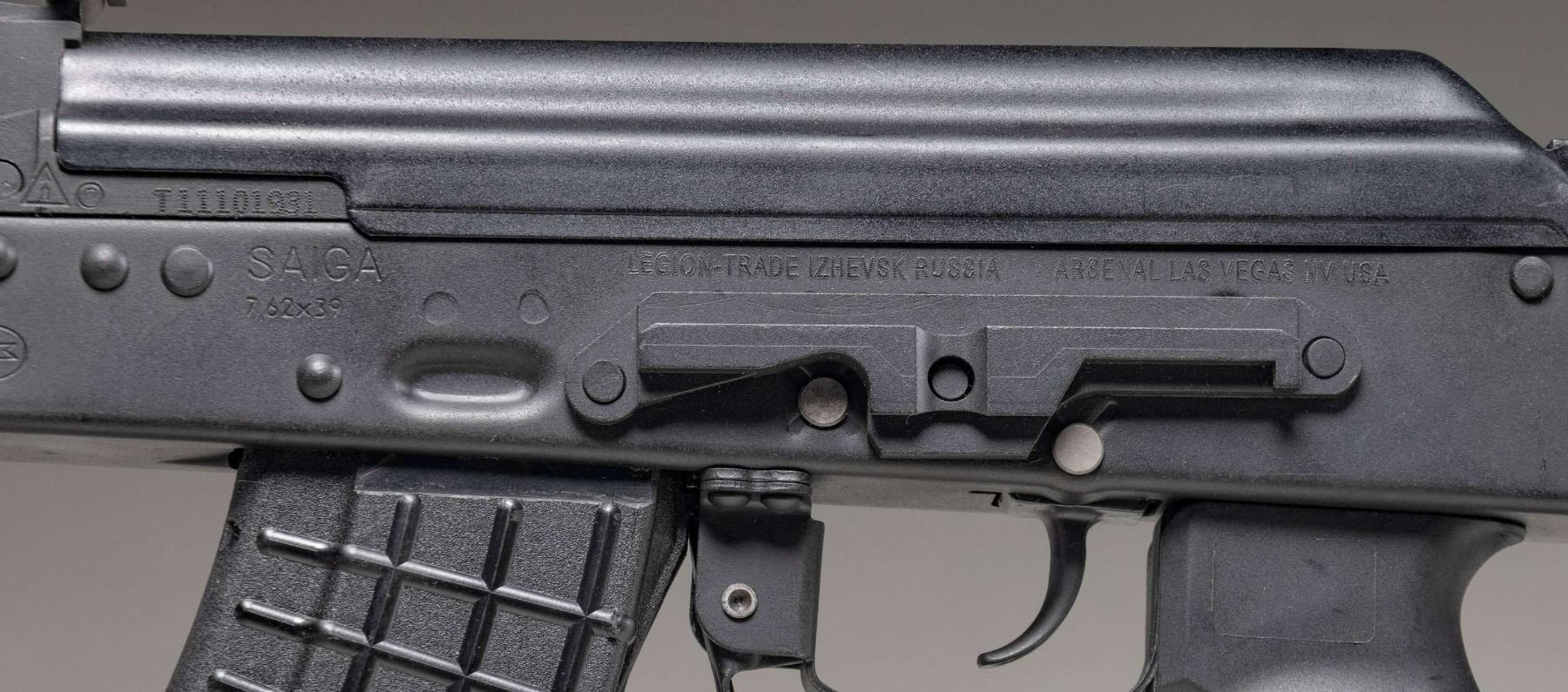 SEMI-AUTOMATIC RIFLE. Cal. 7.62x39mm. S# T11101931. Bbl. 16 1/4". Saiga (SGL-20) semi-automatic rifle mfg. in Russia by Legion Ltd. (Izhmash's internal custom shop) at the Izhmash factory and imported by Arsenal. Research suggests that Legion Ltd. has its own production line in the Izhmash factory, where it manufactured higher end iterations of the factory's standard production guns, with examples such as this being the closest available rifle in the U.S. to Russia's AK-103 platform. While finding success in the Russian and European markets, Legion had not managed to gather a foothold in the U.S. market. Looking to gain traction in the U.S., Legion partnered with Arsenal, whom had the expertise and knowledge to properly convert these rifles from their imported "sporting" configuration into AK-100 pattern series rifles. Left side of the trunnion is marked with the Izhmash arsenal insignia, followed by the S#. Left side of the stamped receiver is marked with the Izhmash logo within an oval above "11", followed by "SAIGA/ 7,62x39", "LEGION-TRADE IZHEVSK RUSSIA", and Arsenal's importer information. Metal components exhibit a matte black finish overall. FAB Defense AK-L ventilated black polymer 2-piece quad rail forearm with textured black synthetic pistol grip, and TAPCO AR pattern adj. buttstock. Underside of handguard is fitted with a FAB Defense G2 T-Pod vertical foregrip, with the buttstock being fitted with a single point black nylon sling. Chrome lined bore with AK-74 pattern muzzle brake and chrome plated gas piston. Standard AK pattern open top post front sight and adj. U-notch rear sight marked with a Cyrillic "N" in the lowest position, and graduated 2-10. Upper handguard rail is mounted with a Bushnell 1x32 Trophy reflex sight with red/green T-Dot reticle. Top of scope features an integral blade and square notch rear sight. Left side of the receiver features an integral AK pattern side-mounted optic rail. All serialized parts are matching and include the receiver (trunnion), as well as the bolt carrier, and bolt. MAGS: x5 black polymer mags. (x1 Bulgarian (Circle 10 marked) and x4 TAPCO) 30-rd. mags., as well as x4 steel Bulgarian 30-rd. mags., all housed within a canvas bag. UNATTACHED ACCESSORIES: Bushnell optic box. CONDITION: near new, with metal components retaining virtually all of their original factory matte black finish, exhibiting few minor superficial handling marks overall, with a typical dragline on the receiver from the selector lever. Brilliant mirror chrome lined bore, retaining sharp and well defined rifling throughout. Proper manual mechanics. Aftermarket polymer furniture is excellent. Scope batteries are dead, but scope otherwise retains a clear optic. An excellent example of a Legion / Arsenal Saiga rifle, that with the correct furniture, will make for a rifle that is virtually the closest thing to a Russian AK-100 series rifle that can be obtained in the U.S. (25-6201/MLW). MODERN. $1,750-2,500.