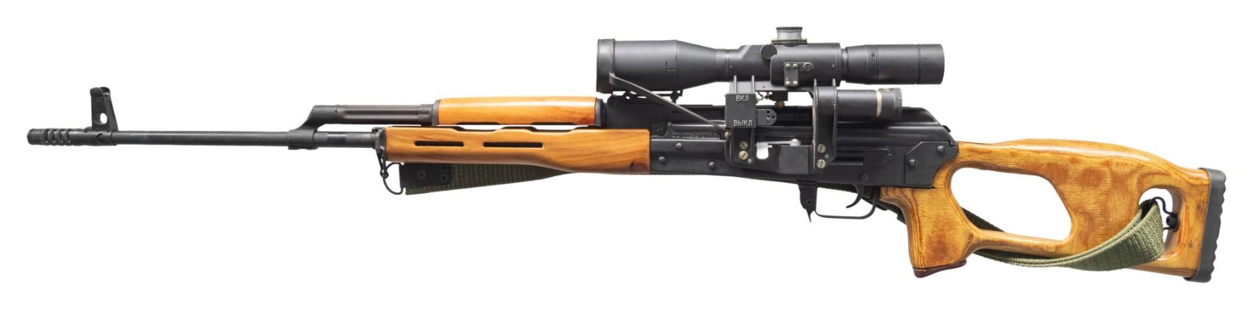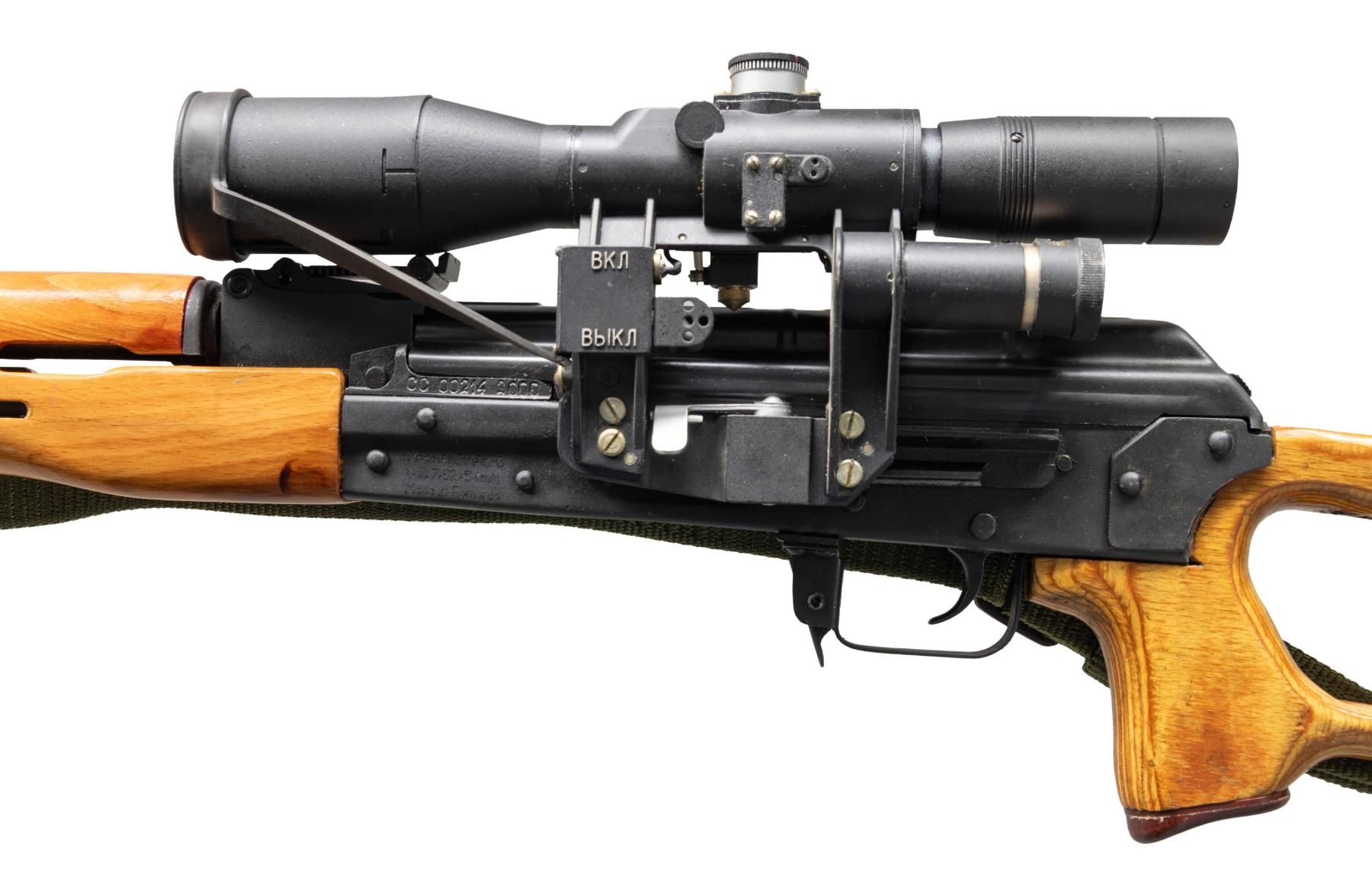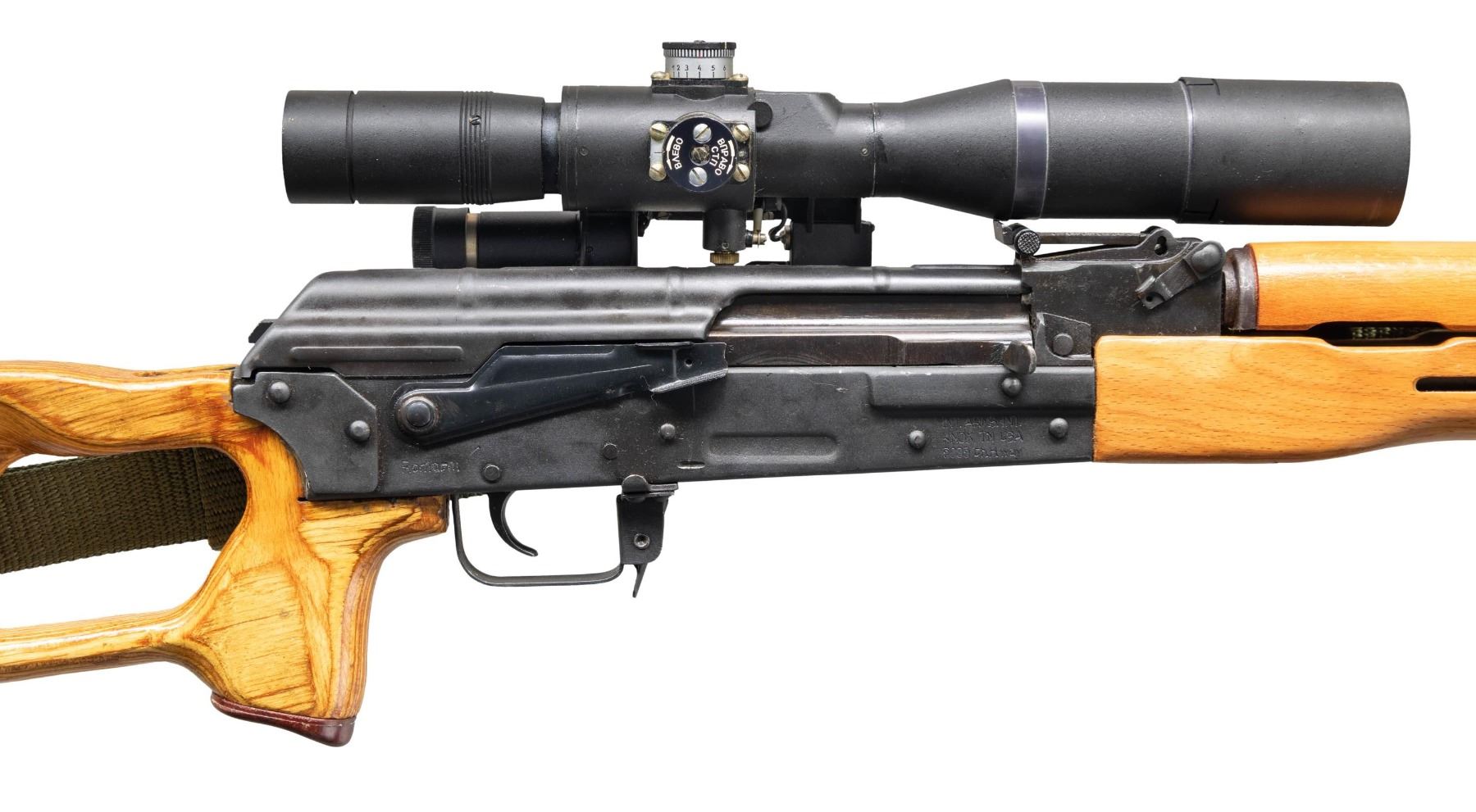POSP SCOPE. Cal. 7.62x54R. S# CC002142000. Bbl. 24 1/4". Romak-3 (commercial variation of the Romanian PSL) semi-automatic rifle mfg. in Romanian by Romarm and imported by "INT.ARMS.INT". Left side of the receiver is marked with the S# (on trunnion) above the model and cal. designations, with "Romarm" and "INT.ARMS.INT./ KNOX TN USA/ 5005 Ch.H.way" marked on the right. Metal components exhibit a matte black finish overall, save for on the selector lever, bolt carrier, and bolt, which are blued. Ventilated laminated wood forearm, handguard, and brown bakelite capped skeleton buttstock with grooved steel buttplate. Open top AK pattern post front sight with tangent U-notch rear sight marked "P" (lowest position) and graduated 1-12. Left side of the receiver features an integral optic rail fitted with a Belarusian mfg. POSP 8x42 scope (# "No0003986"). Scope exhibits a textured matte black finish. Chrome lined bore with pinned ported muzzle brake. All serialized parts are matching and include the receiver, selector lever pin, receiver cover, bolt carrier, bolt, as well as the gas cyl. tube. Mag. is absent. CONDITION: metal components retain the vast majority of their original factory matte black finish, exhibiting some light edge wear, with some scattered superficial marks and light scratches present overall. Mirror chrome lined bore, retaining well defined rifling throughout. Proper manual mechanics. Wood furniture shows a few superficial marks and minor impressions from handling and storage, with some light surface level cracks present on the buttstock. Exterior of scope shows some scattered handling marks, with the front lens shroud drooping downward when fully extended. Scope retains a clear and sharp optic. (25-3917/MLW). MODERN. $1,000-1,500.