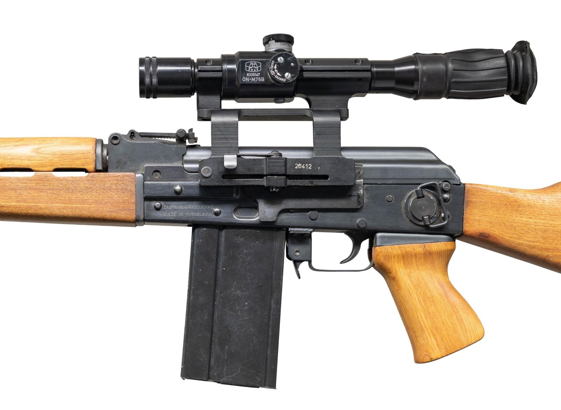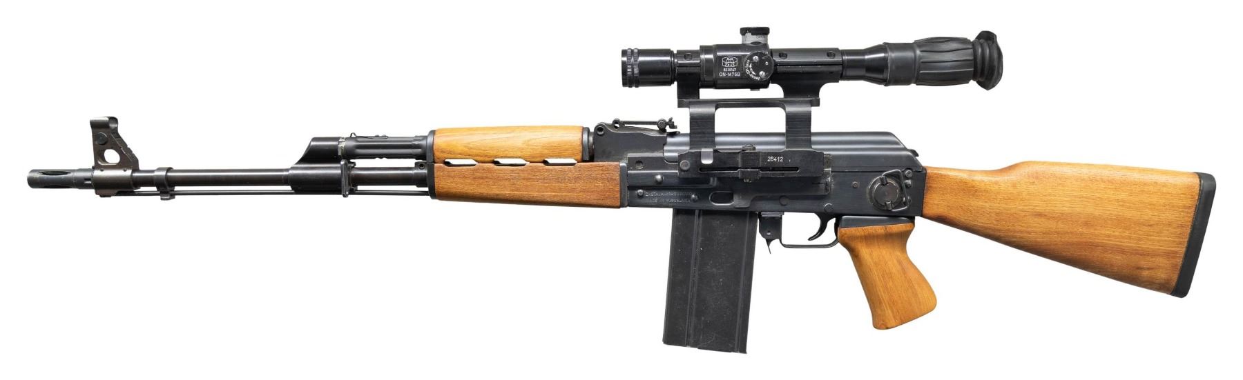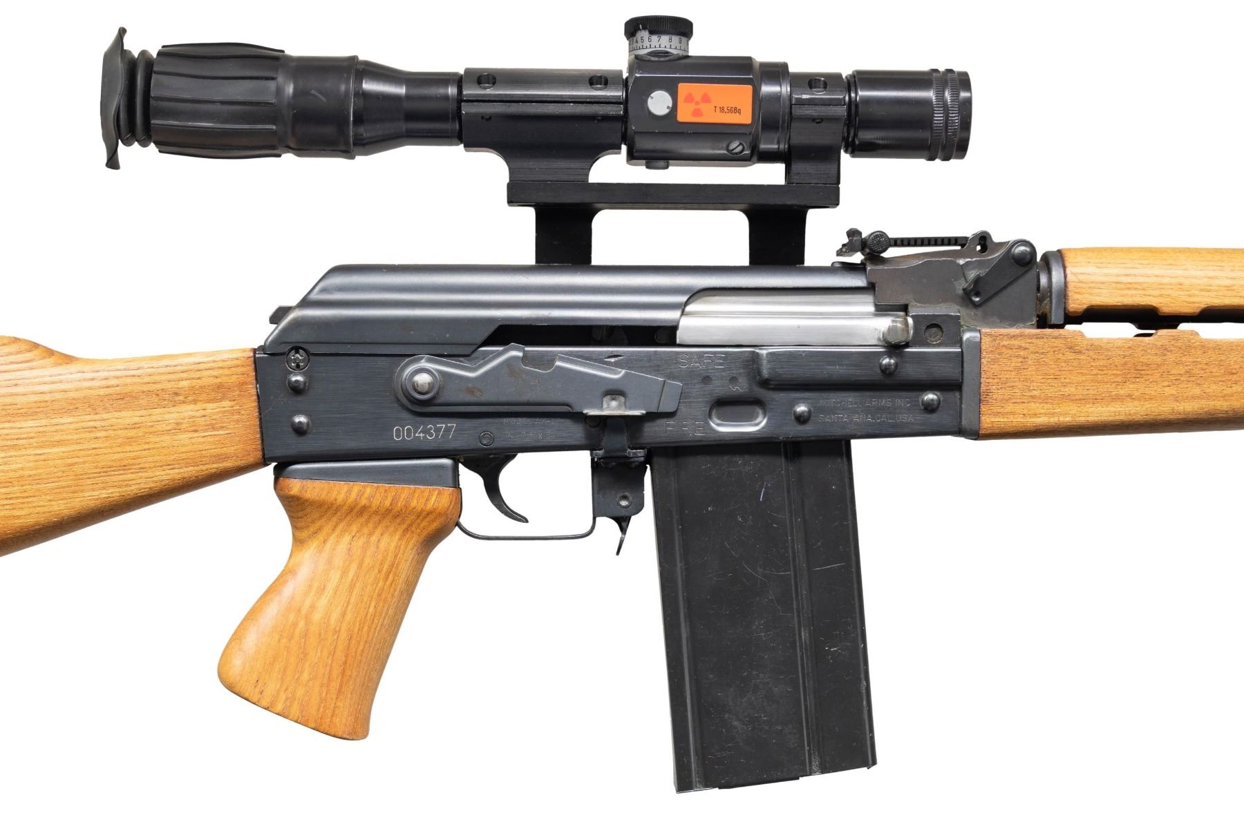 SEMI-AUTOMATIC RIFLE WITH SCOPE. Cal. 7.62x51mm. S# 004377. Bbl. 19 5/8". AK-47 semi-automatic rifle mfg. in Yugoslavia by Zastava and imported by Mitchell Arms. Left side of the stamped receiver is marked with Zastava's mfg. information, with the S#, model and cal. designations, as well as Mitchell Arms' importer information marked on the right. Metal components exhibit a blue finish overall, save for on the bolt assembly which has been brightly polished in-the-white. Plain wood forearm, handguard, pistol grip, and buttstock with black rubber recoil pad. Open top AK pattern post front sight with tangent U-notch rear sight featuring a flip-up night sight and being graduated 0-10. Side-mounted optic rail is fitted with a ZRAK ON-M76B scope. Bbl. features a birdcage pattern flash hider and 3-position adj. gas block. All numbered parts are matching via the assembly # "436", which is present on the trunnion (top flat), receiver cover (interior), mainspring guide rod, bolt carrier, bolt, as well as the gas cyl. tube. MAGS: 1 black enamel finished 20-rd. CONDITION: metal components retain the vast majority of their original factory blue finish, showing some scattered superficial handling marks, as well as scattered spots of light surface oxidation. Bolt carrier exhibits some scattered spots of dark discoloration. Bright bore, exhibiting some scattered spots of pitting, as well as what appears to be either light pitting or grease along the edges of the lands, while retaining strong rifling throughout. Proper manual mechanics. Wood furniture is very good to excellent overall. Scope retains a clear optic. Scope mount latch appears to be broken, with the mount being locked in place regardless of which direction the latch is turned. (25-2245/MLW). MODERN. $1,200-1,800.