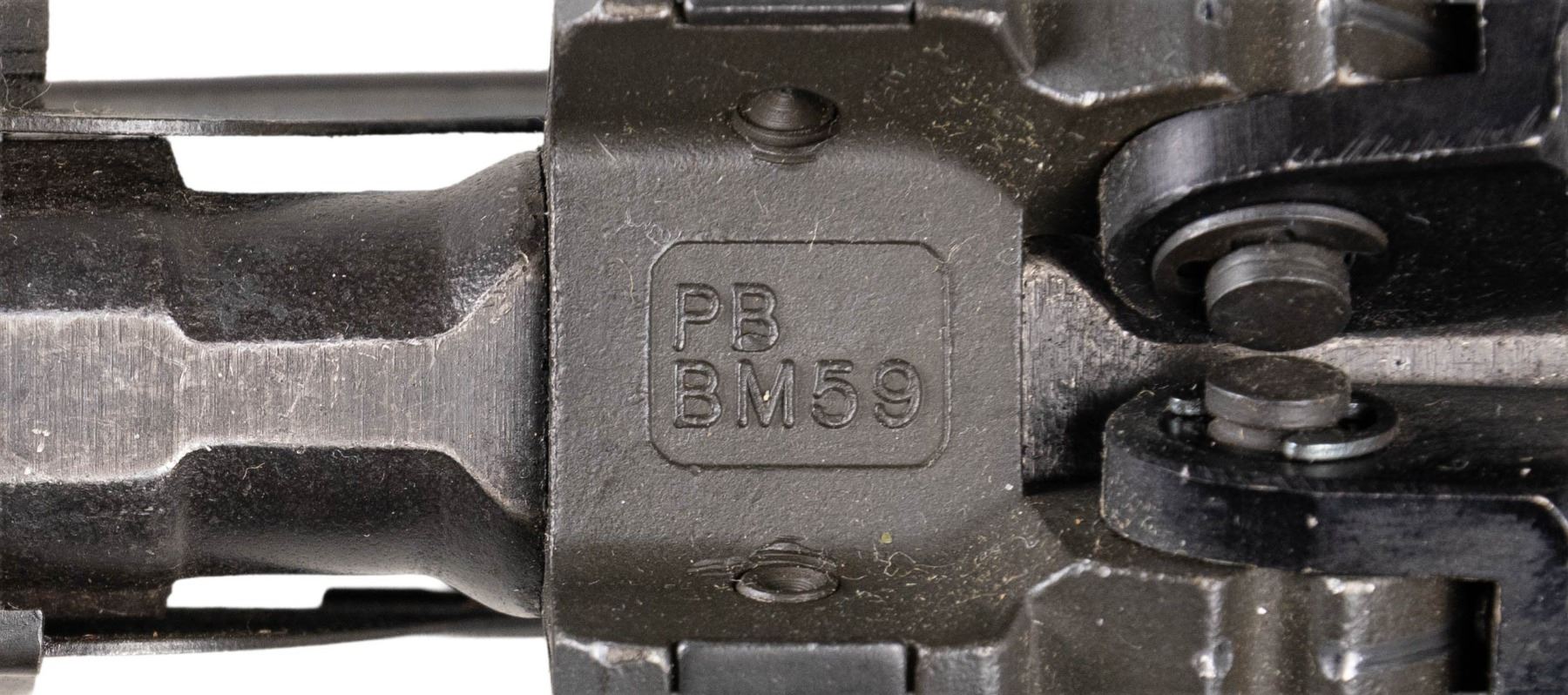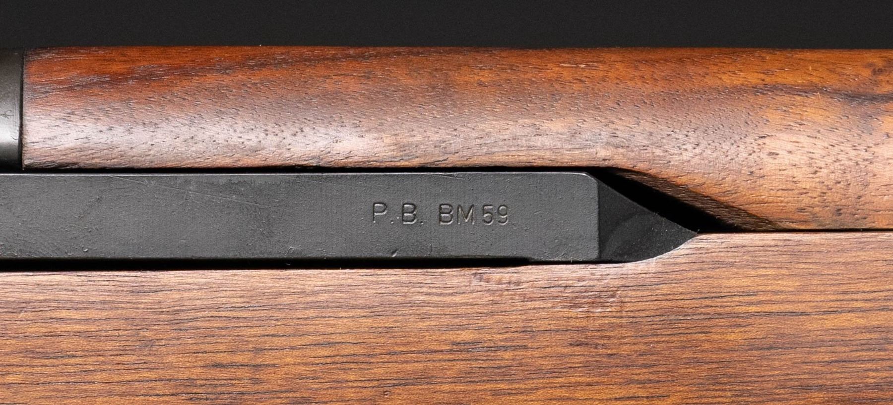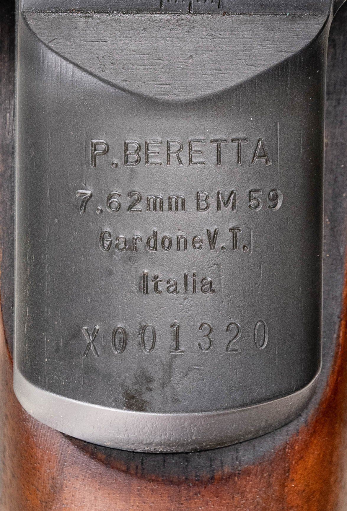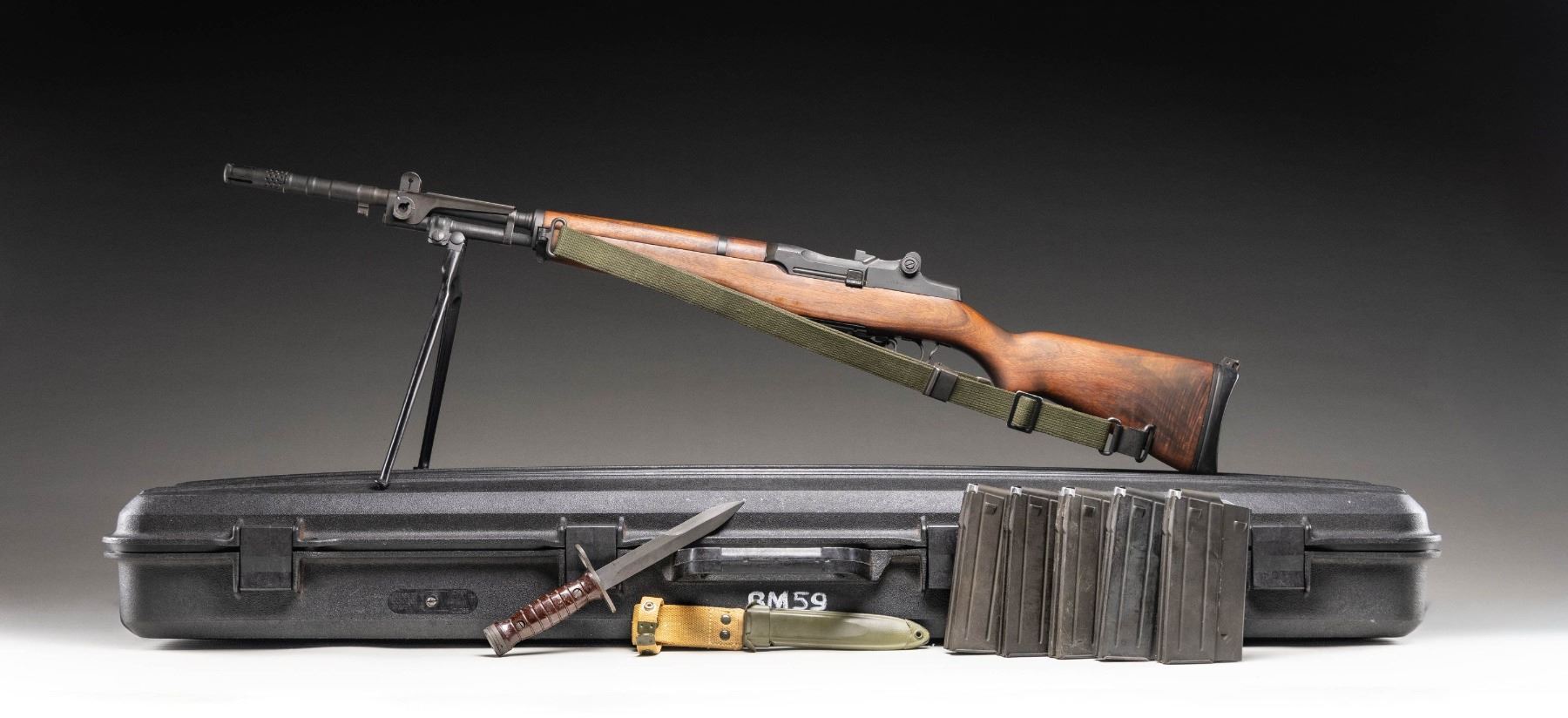 RIFLE. Cal. 7.62x51. S# X001320. Bbl. 23 3/8" including Tri-Compensator. The BM59 rifles were imported by Springfield Armory of Geneseo, Illinois in the 1980s as parts kits and were assembled in the United States. The parts included some Beretta marked receivers as in this example. The receiver is marked at heel "P. BERETTA / 7.62mm BM59 / Gardoni V.T. / ITALIA / serial number". Receiver marked on left side below rear sight "SPRINGFIELD ARMORY". All major parts marked "BERETTA" except bolt, which is marked "WRA" and hammer which is marked "HR". Adjustable aperture rear sight. Blade front sight with protective ears. Integral folding grenade launcher sight. Barrel is fitted with Tri-Compensator which has bayonet lug. Folding bipod is present. Trigger guard equipped with folding winter trigger. Unmarked walnut stock and handguard. Hard rubber buttplate with folding shoulder rest and side swinging trap cover. Butt swivel hinges to the left. Green web sling. MAGS: five detachable 20 round military-issue magazines. All marked "BR BM59" on floorplate. UNATTACHED ACCESSORIES: included is a 6 5/8" bladed Italian-issue bayonet. Bayonet is unmarked. Grooved brown plastic grips retained by two screws. Bayonet is fitted in green plastic scabbard with tan web frog. Frog has inked matching serial number. Bayonet is in very good condition with light wear and small spots of flaking paint on scabbard. Additionally included, Springfield Armory order form, "Slam-Fire" article reprint, Beretta BM59 operator's manual and a warranty card signed by Dennis Reese, Springfield Armory President and stamped with matching serial number. Also included is a black padded synthetic carrying case. CONDITION: stock set has very light wear with scattered tiny handling marks. The wood has been slightly relieved on the right side of the barrel channel, not visible when rifle is assembled. Rifle retains 95% of its factory parkerized with very light hi-point wear. Very good shiny bore with sharp lands. PROVENANCE: From the BuckStix Collection. (25-6506/RW). MODERN. $2,500-3,750.