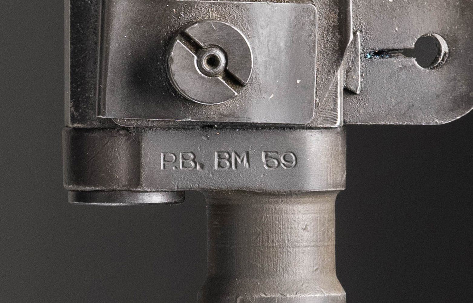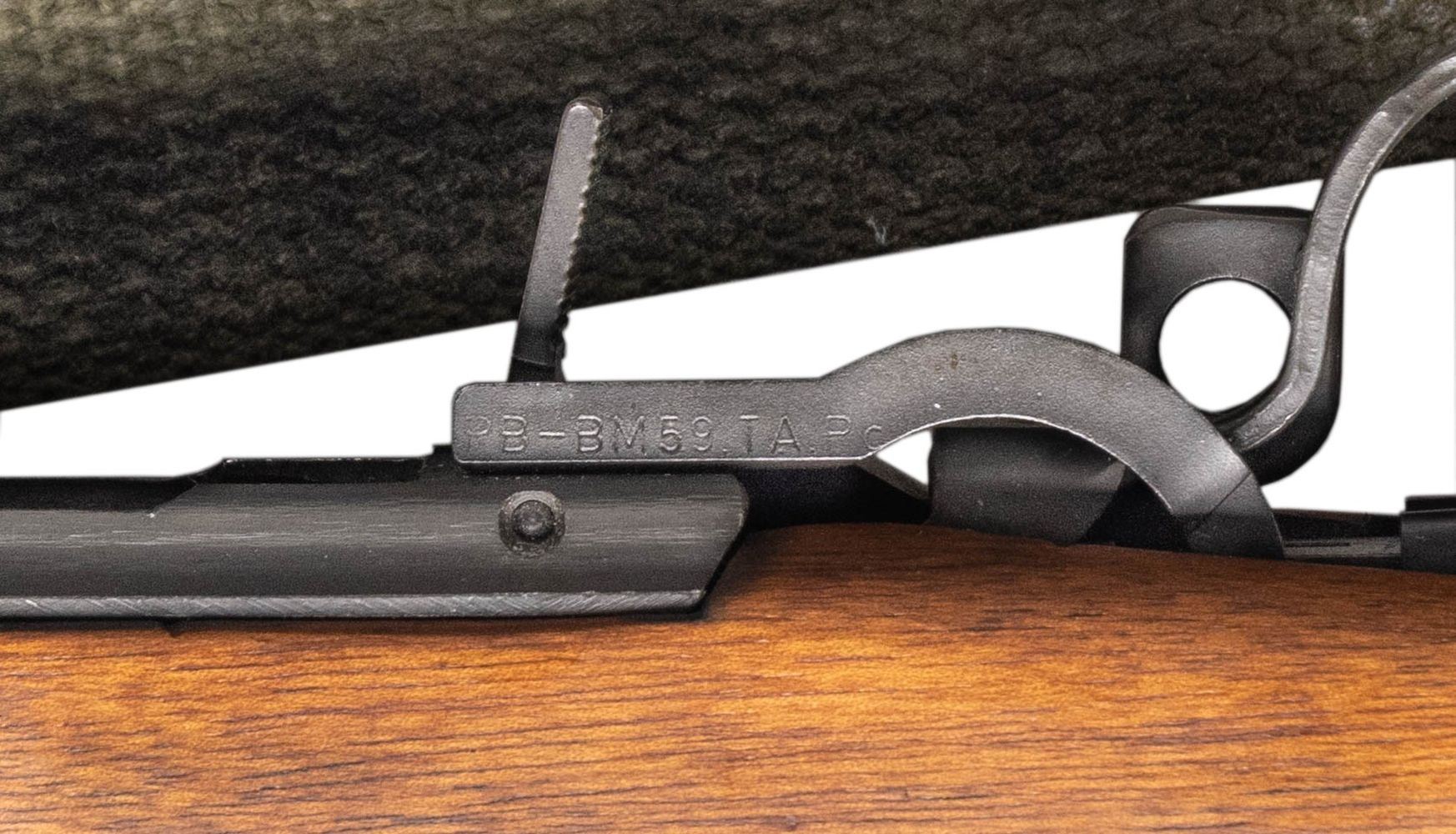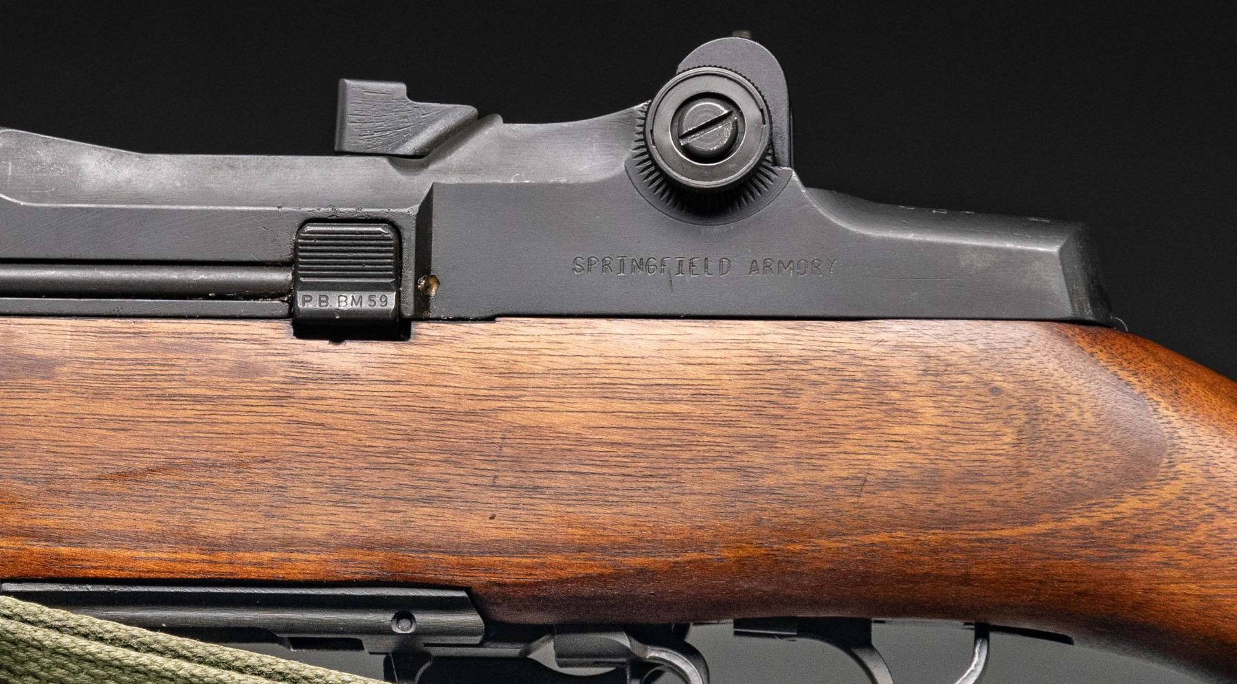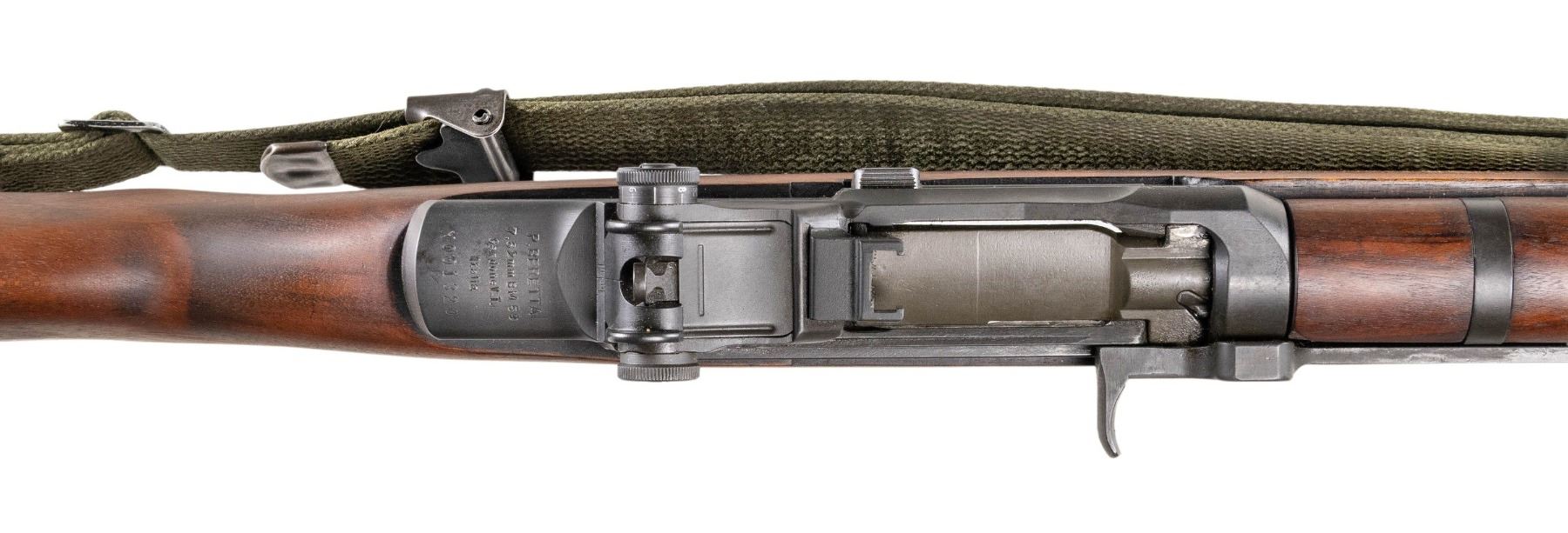 RIFLE. Cal. 7.62x51. S# X001320. Bbl. 23 3/8" including Tri-Compensator. The BM59 rifles were imported by Springfield Armory of Geneseo, Illinois in the 1980s as parts kits and were assembled in the United States. The parts included some Beretta marked receivers as in this example. The receiver is marked at heel "P. BERETTA / 7.62mm BM59 / Gardoni V.T. / ITALIA / serial number". Receiver marked on left side below rear sight "SPRINGFIELD ARMORY". All major parts marked "BERETTA" except bolt, which is marked "WRA" and hammer which is marked "HR". Adjustable aperture rear sight. Blade front sight with protective ears. Integral folding grenade launcher sight. Barrel is fitted with Tri-Compensator which has bayonet lug. Folding bipod is present. Trigger guard equipped with folding winter trigger. Unmarked walnut stock and handguard. Hard rubber buttplate with folding shoulder rest and side swinging trap cover. Butt swivel hinges to the left. Green web sling. MAGS: five detachable 20 round military-issue magazines. All marked "BR BM59" on floorplate. UNATTACHED ACCESSORIES: included is a 6 5/8" bladed Italian-issue bayonet. Bayonet is unmarked. Grooved brown plastic grips retained by two screws. Bayonet is fitted in green plastic scabbard with tan web frog. Frog has inked matching serial number. Bayonet is in very good condition with light wear and small spots of flaking paint on scabbard. Additionally included, Springfield Armory order form, "Slam-Fire" article reprint, Beretta BM59 operator's manual and a warranty card signed by Dennis Reese, Springfield Armory President and stamped with matching serial number. Also included is a black padded synthetic carrying case. CONDITION: stock set has very light wear with scattered tiny handling marks. The wood has been slightly relieved on the right side of the barrel channel, not visible when rifle is assembled. Rifle retains 95% of its factory parkerized with very light hi-point wear. Very good shiny bore with sharp lands. PROVENANCE: From the BuckStix Collection. (25-6506/RW). MODERN. $2,500-3,750.