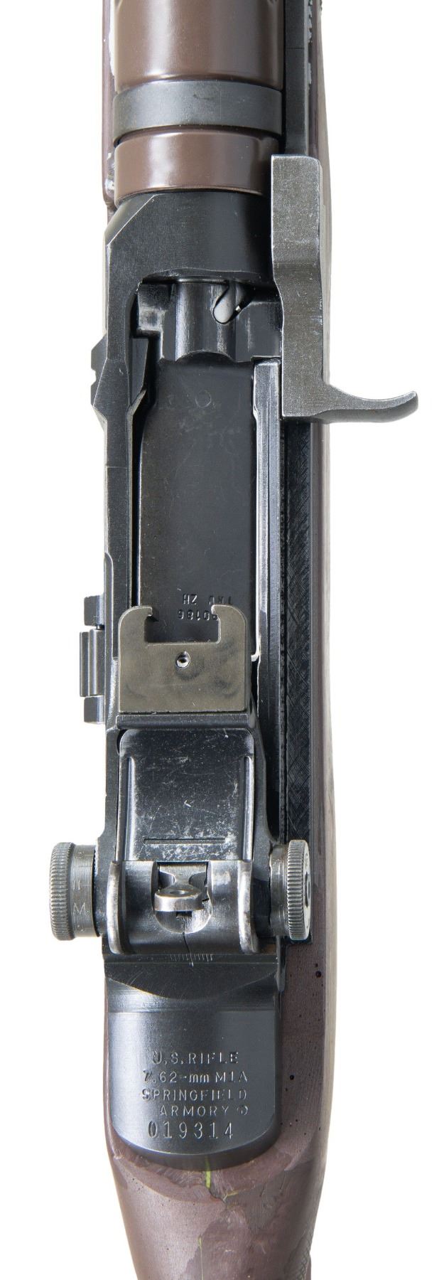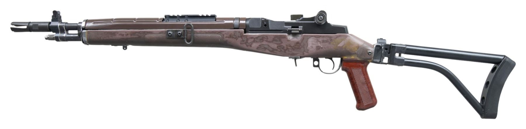 SCOUT RIFLE. Cal. 7.62x51. S# 019314. Bbl. 19 3/4" including open end flash suppressor. T105E1 aperture rear sight. Blade front sight w/ protective ears. Bbl. is fitted w/ rail mount 2 1/2" ahead of receiver. TRW bolt. Brown synthetic stock has been modified w/ an added side swivel, pistol grip & metal sidefolding stock. MAGS: none. CONDITION: plastic stock shows sanding marks & the discoloration of added synthetic materials around grip & behind receiver. Metal has thinning & wear w/ small areas of removed finish. Sidefolding stock functions correctly. Bright shiny bore. (25-2731/RW). CURIO. $1,000-1,500.