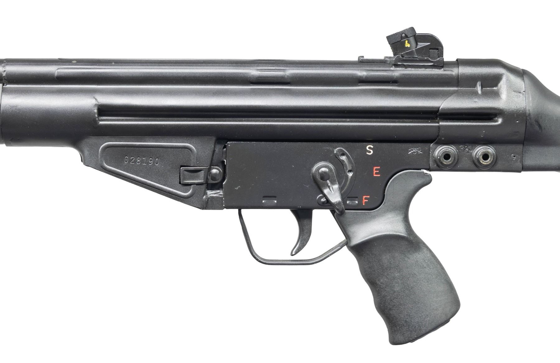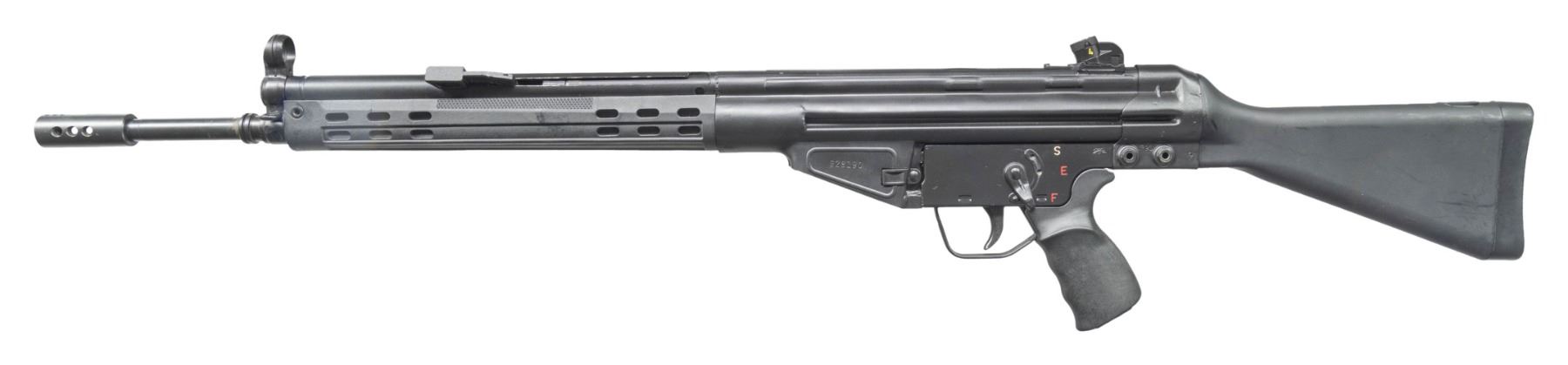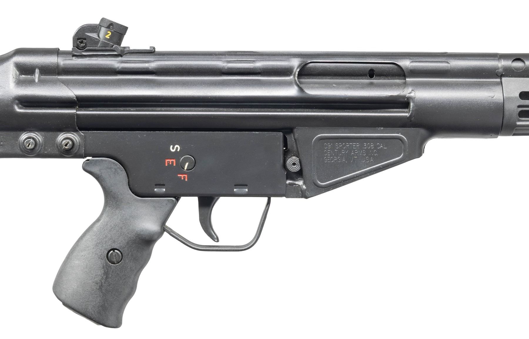 Cal. 308 Win. S# G28190. Bbl. 18". C91 Sporter semi-automatic rifle mfg. by Century Arms. Left side of the receiver is marked with the S#, with the model and cal. designations, as well as Century Arms' mfg. information marked on the right. Left side of the 3-position ("S", "E", and "F") trigger pack housing and buttstock socket are marked with a partially defaced prior S#. Top of the bolt is marked with a small star proof, followed by the date "10/65". Metal components exhibit a dull black enamel type finish overall. Black polymer handguard with black synthetic thumbrest pistol grip, and fixed black synthetic stock. Standard HK91/G3 pattern post front sight and 4-position drum rear sight. Bbl. is fitted with a muzzle brake. Mag. is absent. CONDITION: metal components retain virtually all of their original factory black enamel finish, exhibiting some superficial handling marks, with some flaking present on the bbl. towards the front sight tower. Near mirror bore, exhibiting scattered spots of light to mild pitting, as well as a couple of patches of mild pitting towards the muzzle, while retaining strong rifling throughout. Proper manual mechanics. Black synthetic furniture shows some superficial handling marks, but otherwise remains very good overall. (25-2335/MLW). MODERN. $1,000-1,500.