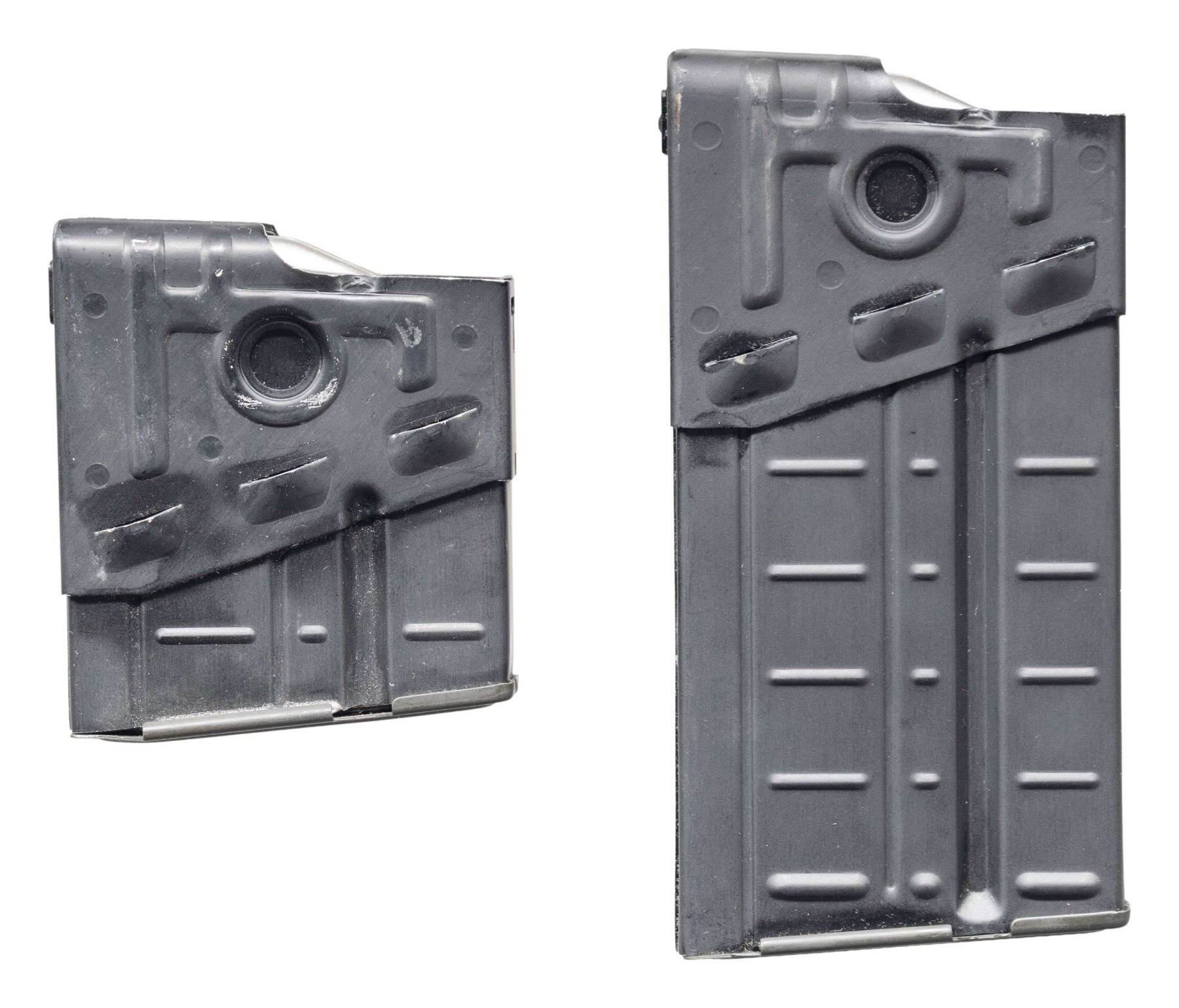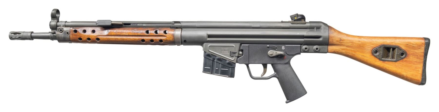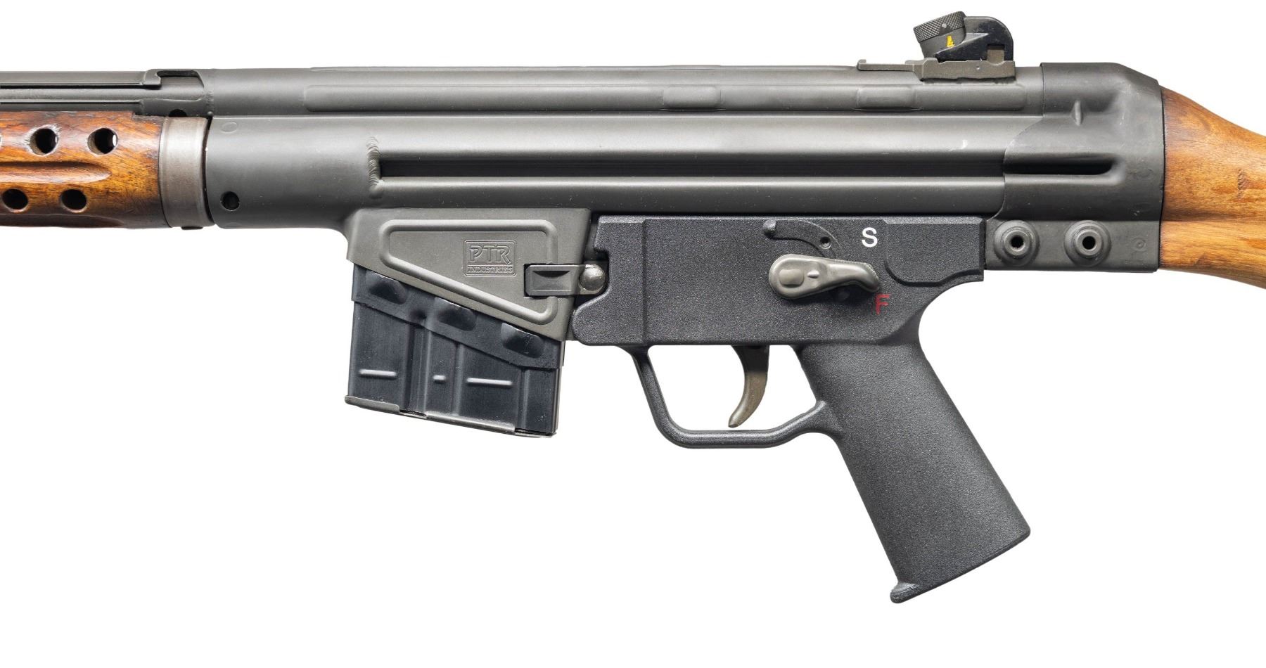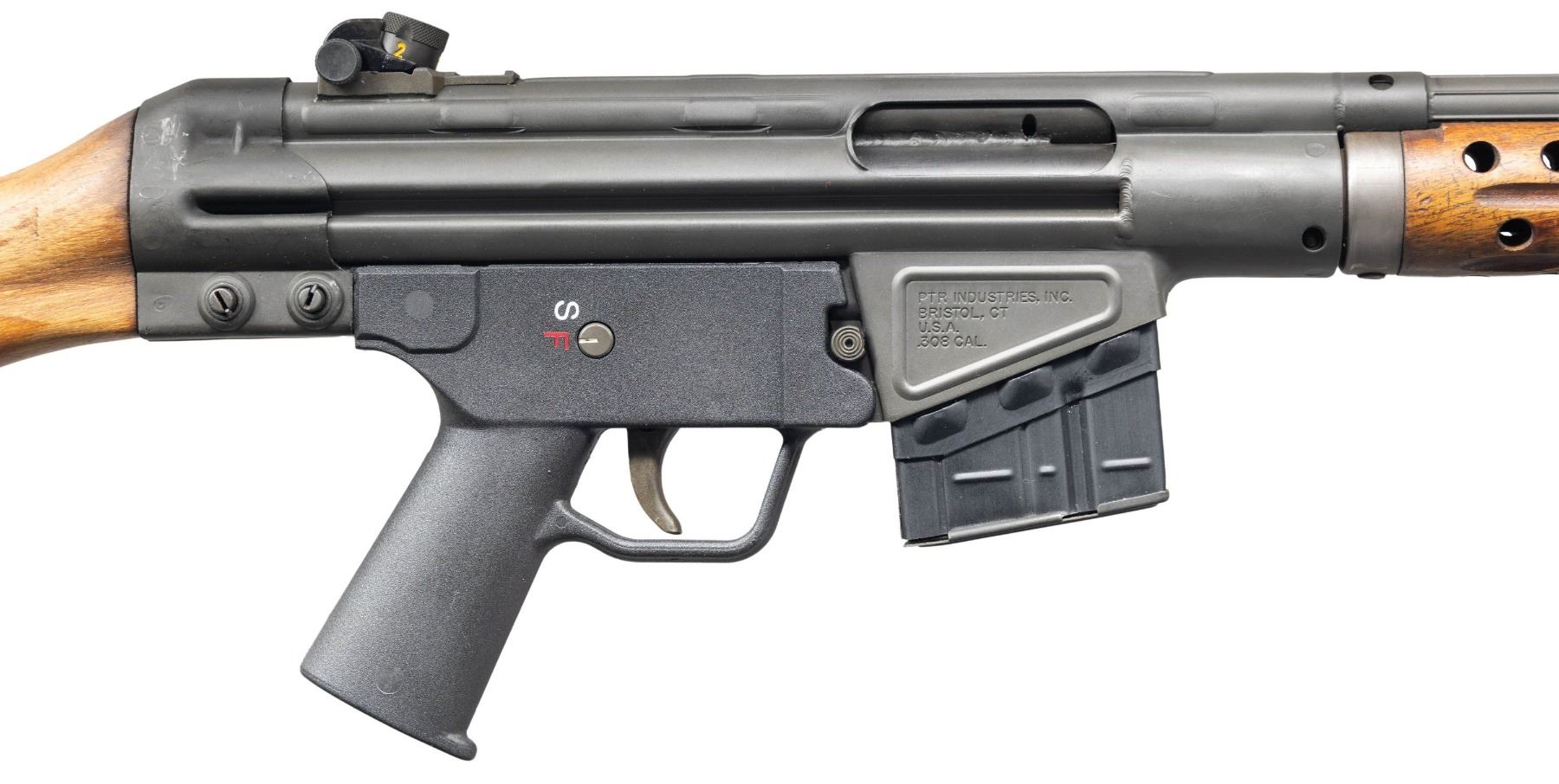 WITH FACTORY HARD CASE. Cal. 308 Win. S# GI4705. Bbl. 16". PTR-91 Classic semi-automatic rifle mfg. by PTR Industries. Left side of the receiver is marked with PTR's boxed logo, with PTR's mfg. information and the cal. designation marked on the right. Receiver, selector lever, gas cyl. tube, bbl., and birdcage flash hider exhibit a phosphate finish, with the buttstock socket exhibiting an apparent arsenal phosphate finish. 1-piece perforated wood handguard and plain wood buttstock. Black synthetic trigger pack housing marked "S" and "F". Standard post front sight and 4-position "drum" rear sight. MAGS: x2 aluminum 5-rd. mags. and 1 aluminum 20-rd. mag. UNATTACHED ACCESSORIES: matching factory hard case. CONDITION: metal components are excellent, showing some light superficial handling marks overall. Steel hardware on forearm appears to be surplus, having faded to a mostly gray patina. Mirror bore, retaining well defined rifling throughout. Proper manual mechanics. Wood furniture shows scattered marks and impressions from handling and storage, but otherwise remains sound. PROVENANCE: Paul Birkenstamm Collection. (25-6310/MLW). MODERN. $700-1,000.